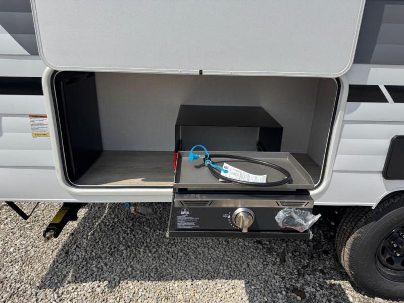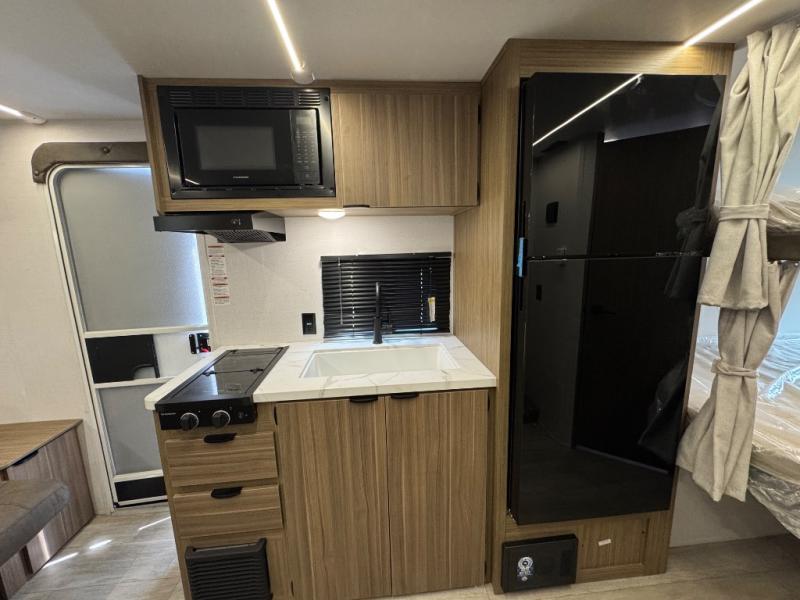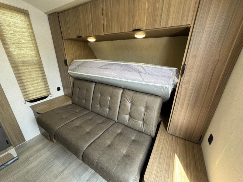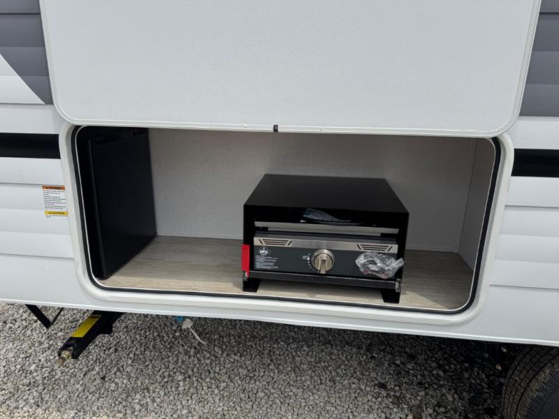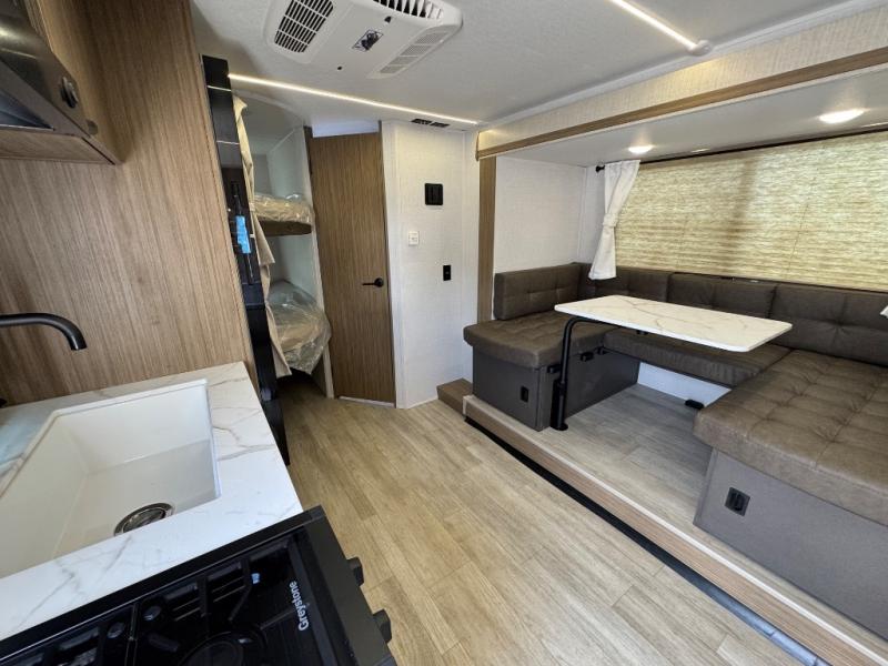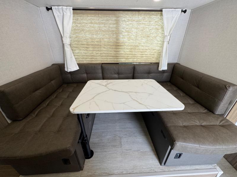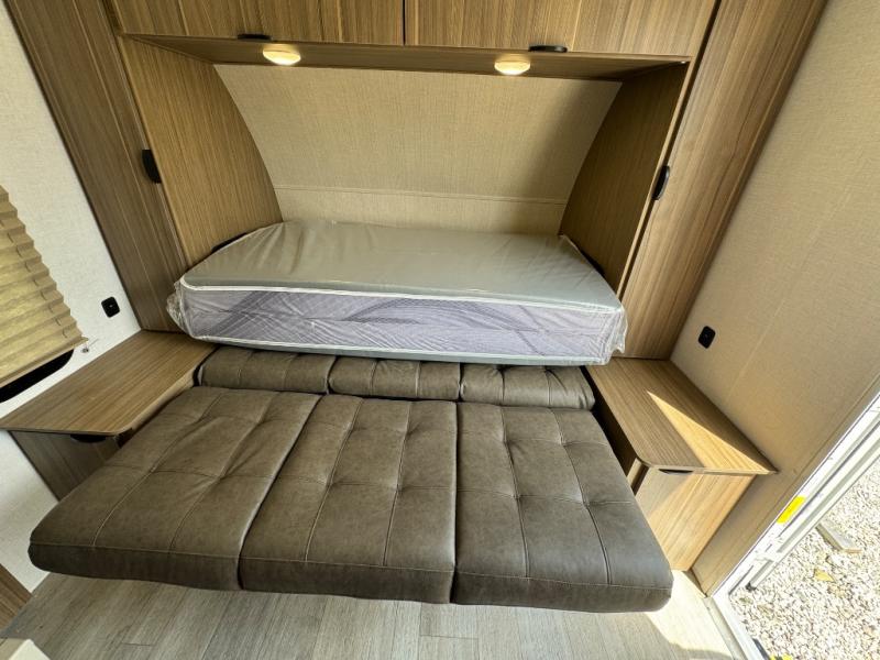 Start camping the right way in this travel trailer! It features a front Murphy bed that will double as your seating and sleeping space each day. The corner set of double-size bunk beds come with storage to keep things out of the way and are conveniently next to the rear corner bathroom with a shower with a skylight to freshen up in each morning. You can prepare your best home cooked meals with the two-burner cooktop and store leftovers in the 12V refrigerator. Enjoy your meals, play card games, and even sleep at the U-shaped dinette slide.