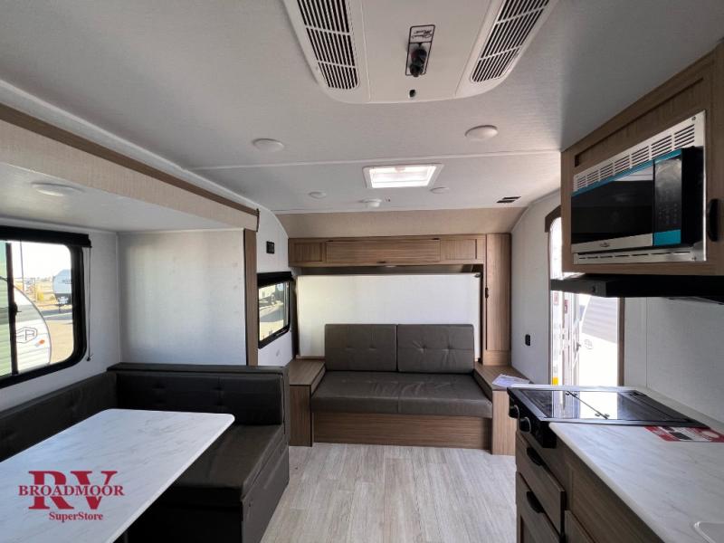 Versatile living is found all throughout this travel trailer! Starting with the front Murphy bed which transforms from sofa seating during the day to a queen bed at night. The kids can sleep on the set of double bed bunks in the rear curbside corner, and they will appreciate the rear corner bathroom being right next to them at night. You can prepare your best home cooked meals either indoors with the two burner cooktop and microwave oven, or breathe in some fresh air while you cook at the outside kitchen. Enjoy your meals at the U-shaped dinette slide and look out at your beautiful scenery through the panoramic window!