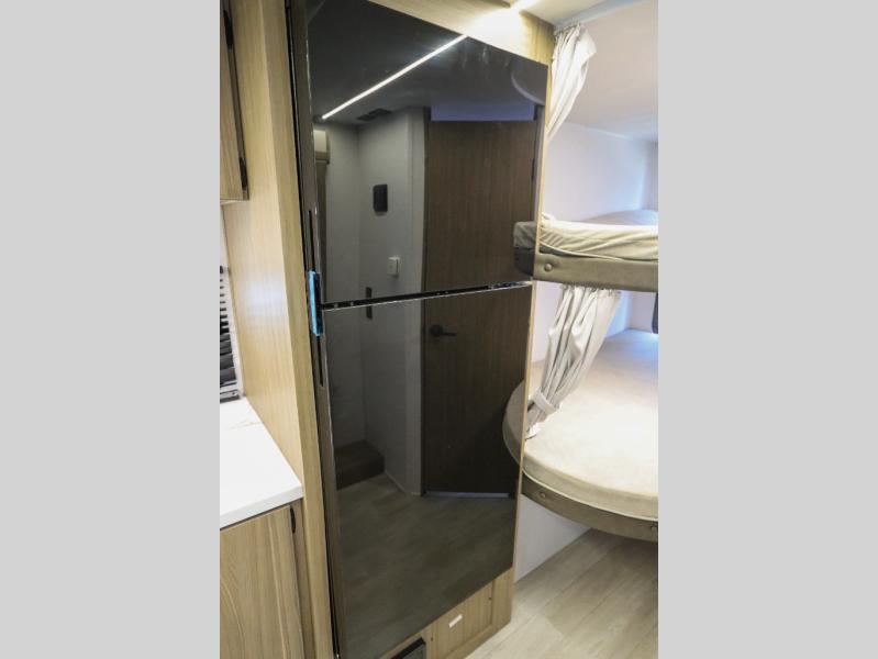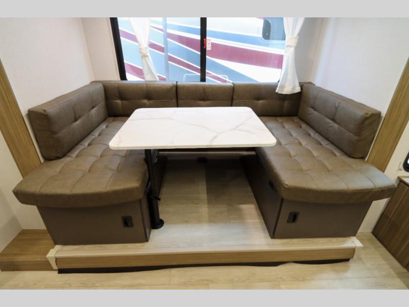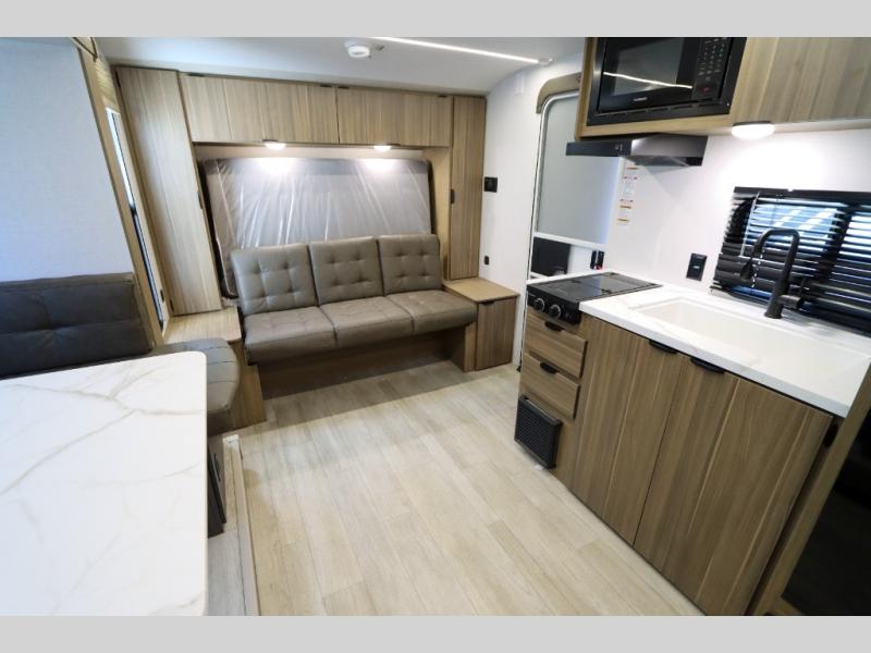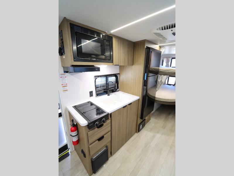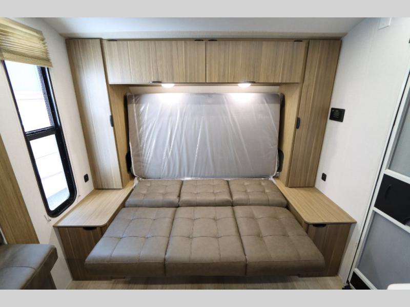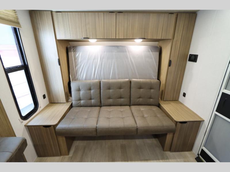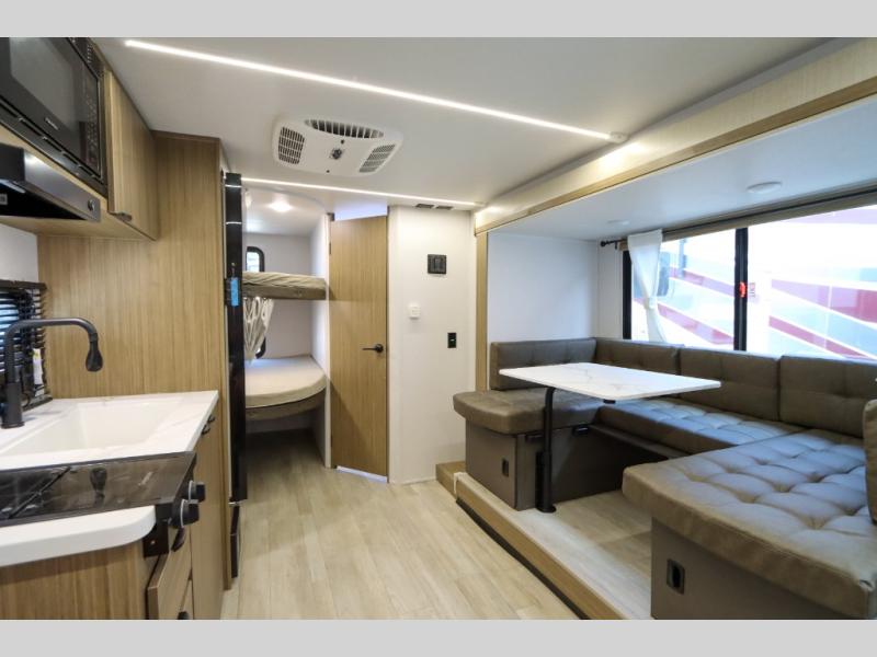 Start camping the right way in this travel trailer! It features a front Murphy bed that will double as your seating and sleeping space each day. The corner set of double-size bunk beds come with storage to keep things out of the way and are conveniently next to the rear corner bathroom with a shower with a skylight to freshen up in each morning. You can prepare your best home cooked meals indoors with the two burner cooktop or head to the outside kitchen to fry up some burgers while breathing in some fresh air. Enjoy your meals, play card games, and even sleep at the U-shaped dinette slide. You will also appreciate the outside shower and the exterior full pass-through storage for camp gear!