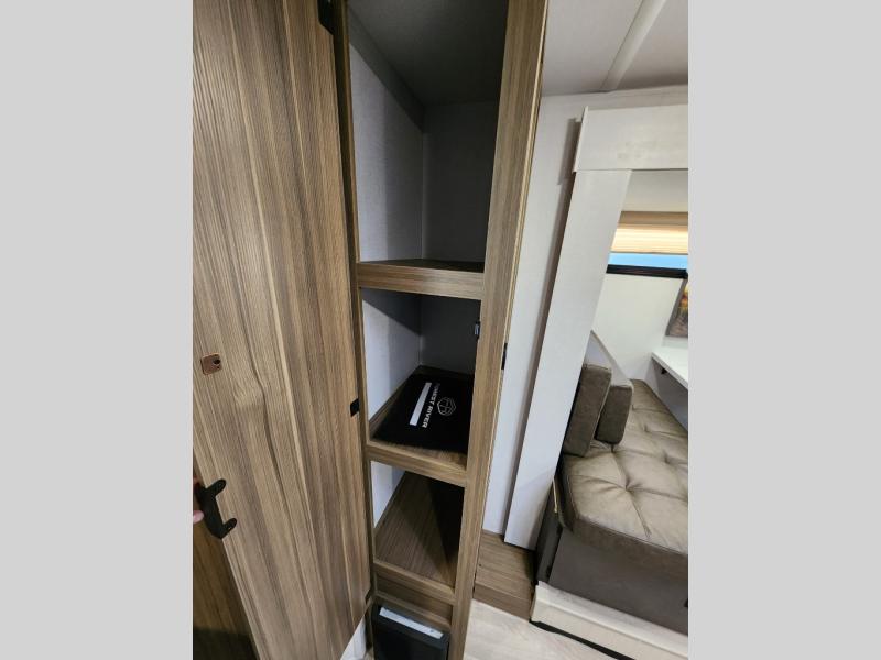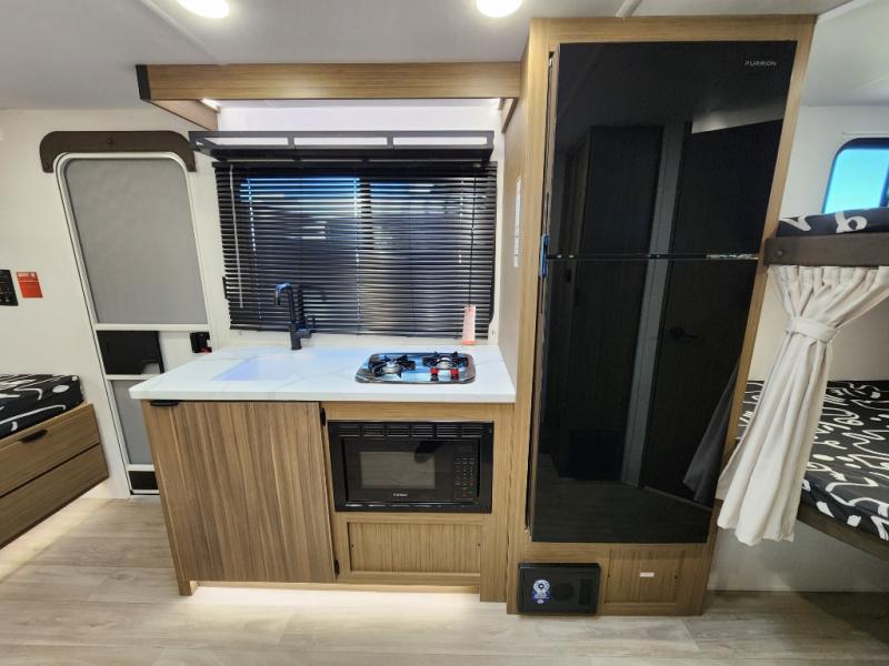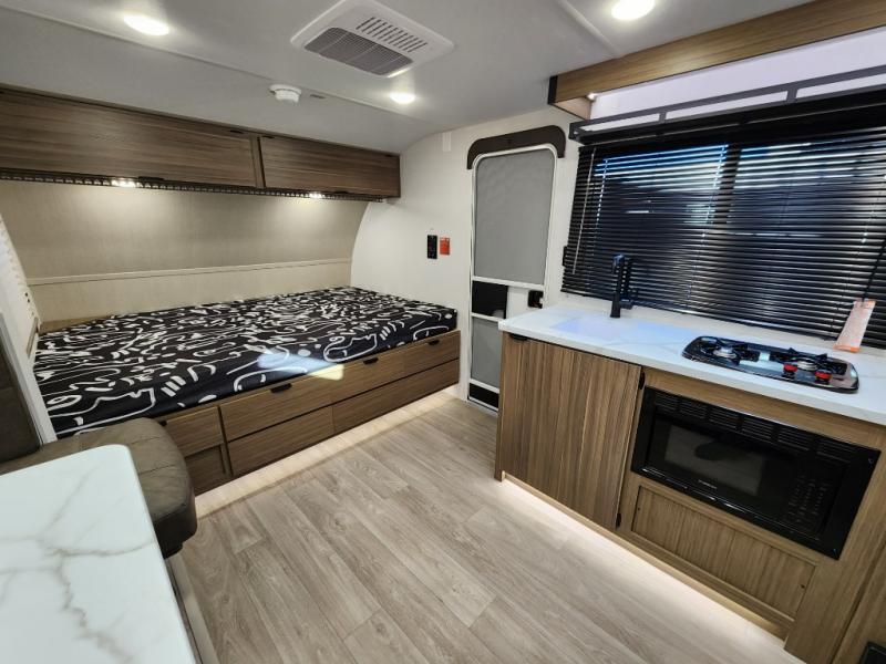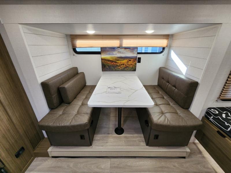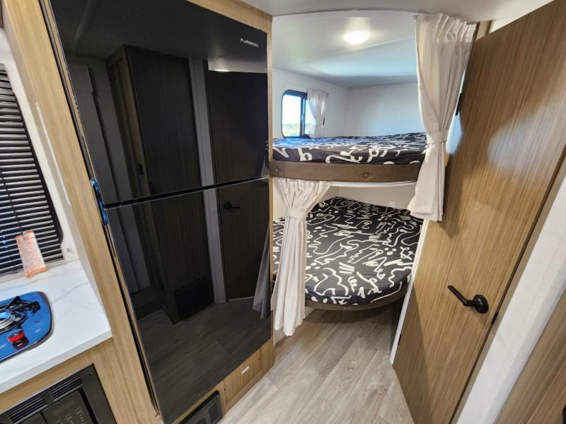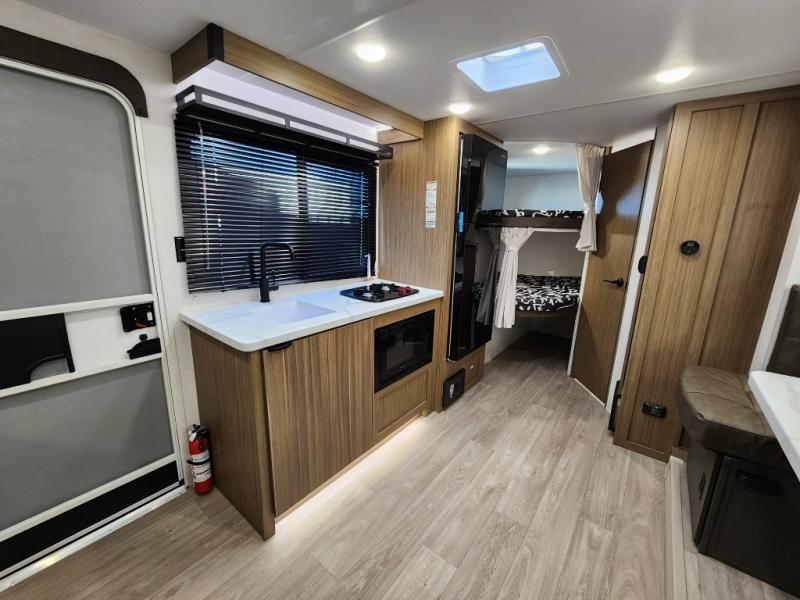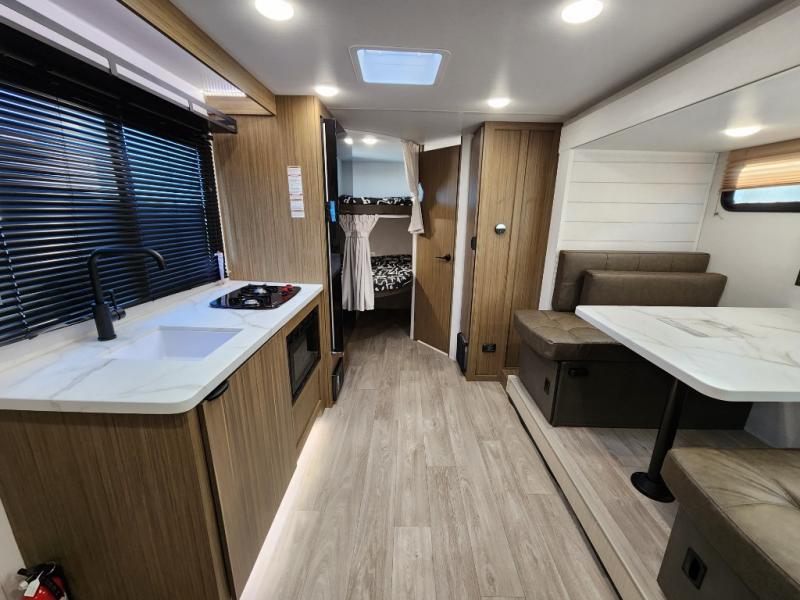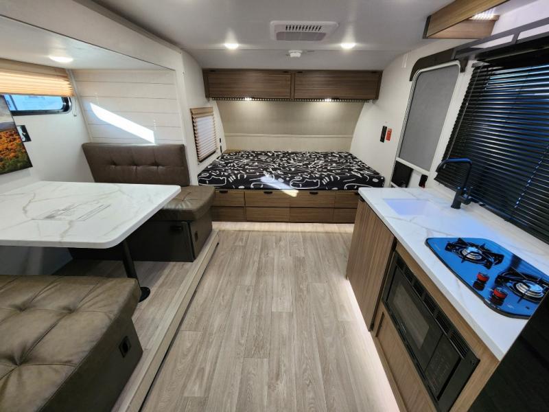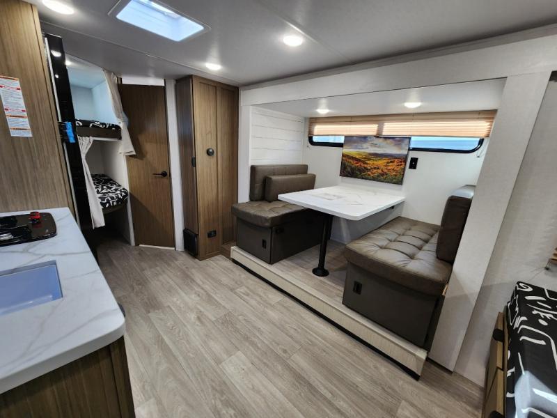 It will be so easy to enjoy time spent in this travel trailer for seven. The front queen bed provides a great night's rest, and there is an overhead cabinet to keep your things organized. Your guests or little ones can claim the double-size bunks for themselves, and there is a full bath adjacent to the bunks for easy nighttime use. A two-burner cooktop in the kitchen will let you make meals for your crew, and a refrigerator keeps leftovers fresh. You can dine at the booth dinette within the slide out or take your plate outdoors to sit under the 12' power awning.