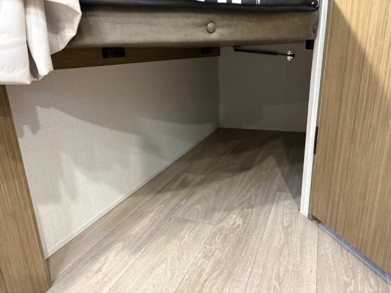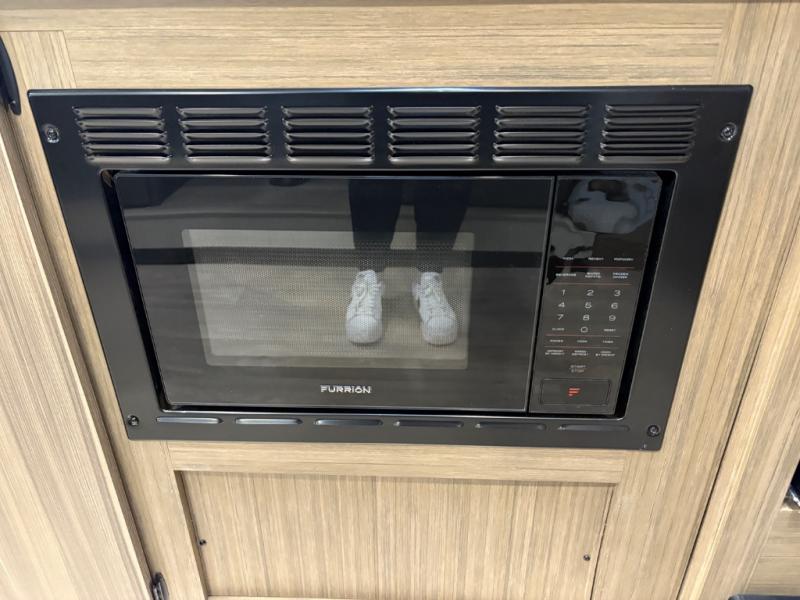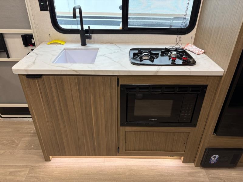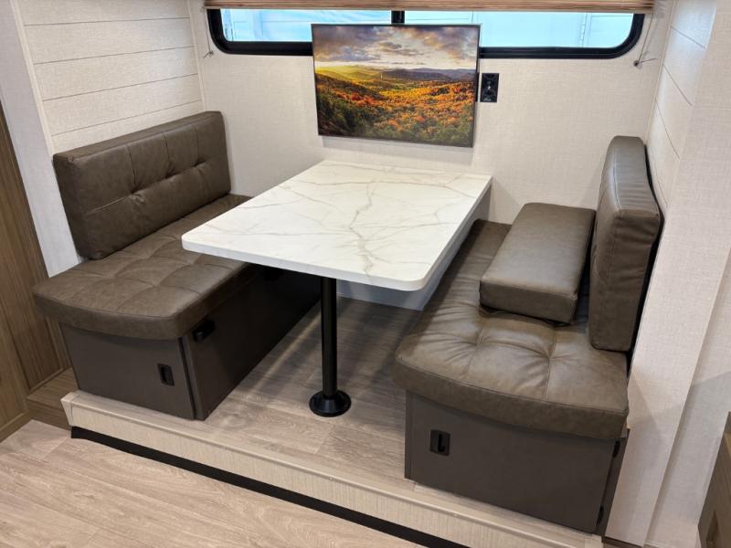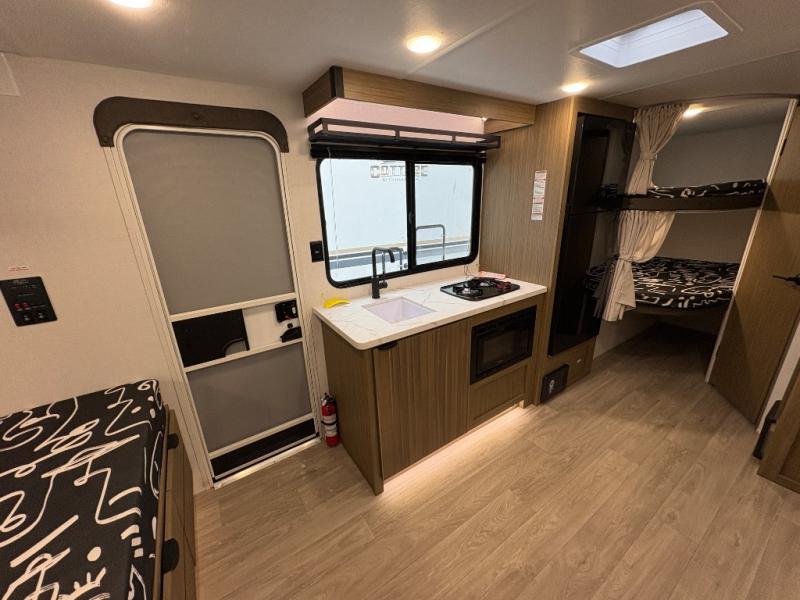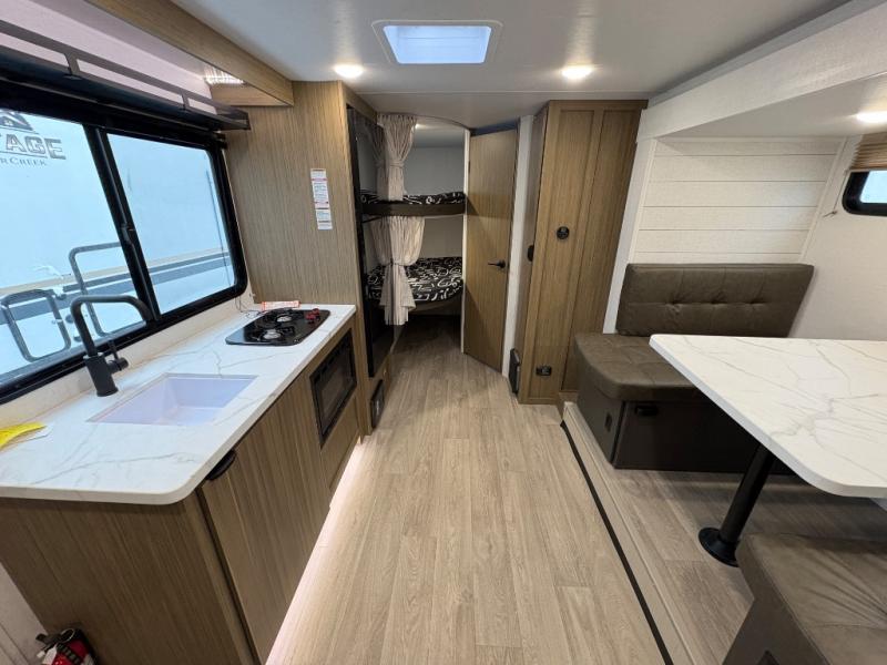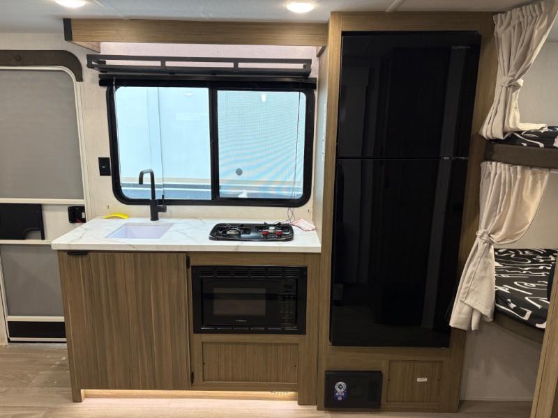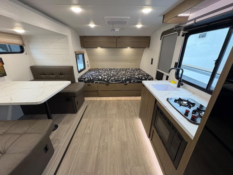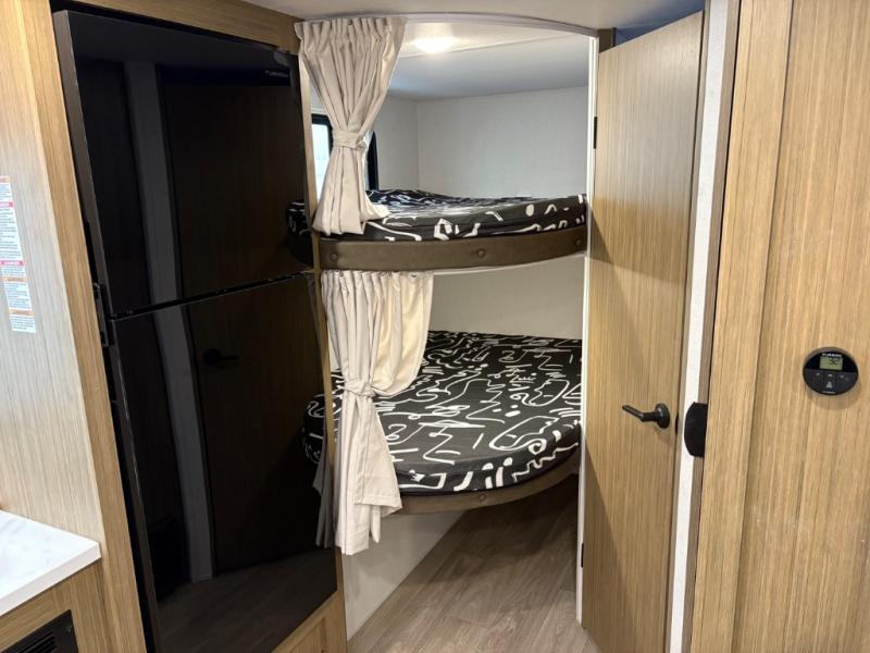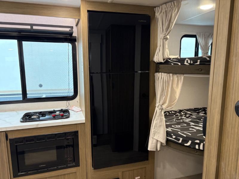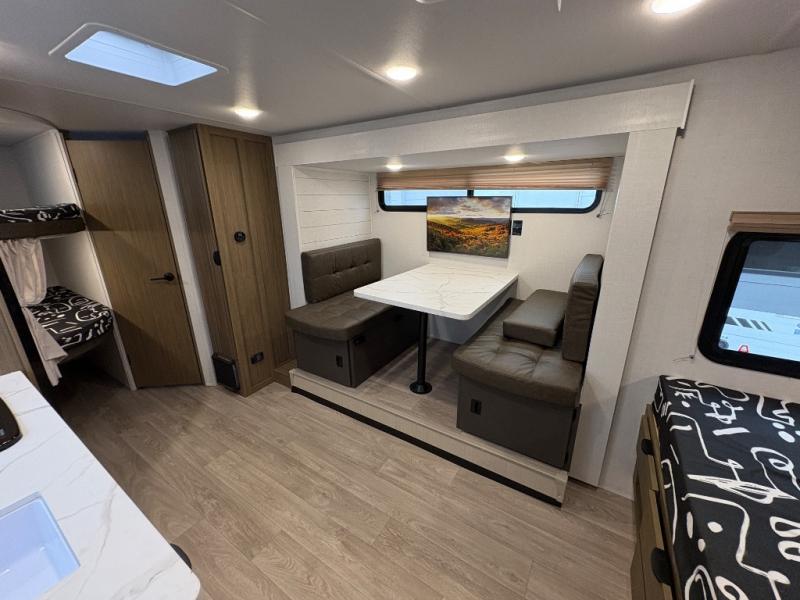 It will be so easy to enjoy time spent in this travel trailer for seven. The front queen bed provides a great night's rest, and there is an overhead cabinet to keep your things organized. Your guests or little ones can claim the double-size bunks for themselves, and there is a full bath adjacent to the bunks for easy nighttime use. A two-burner cooktop in the kitchen will let you make meals for your crew, and a refrigerator keeps leftovers fresh. You can dine at the booth dinette within the slide out or take your plate outdoors to sit under the 12' power awning.