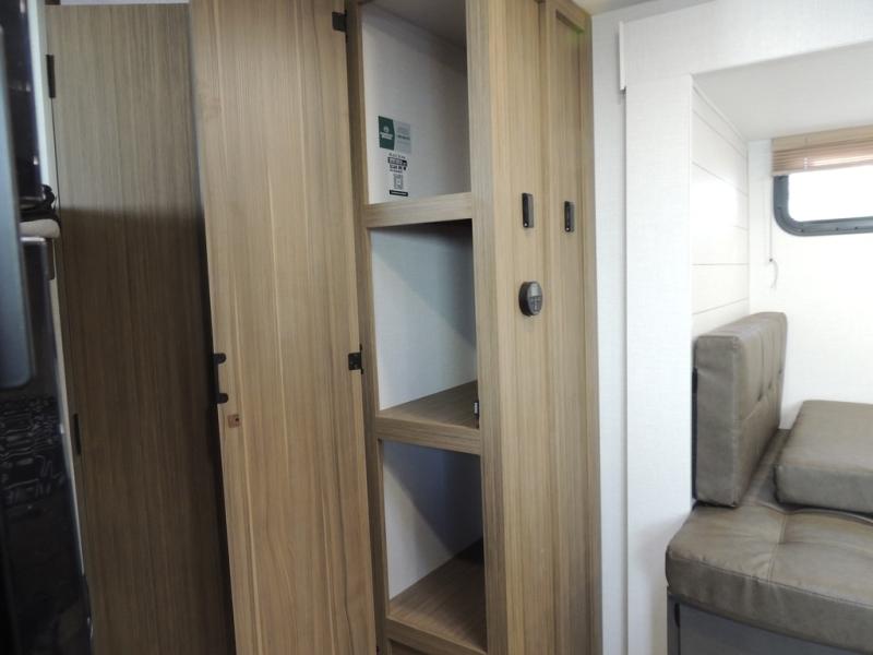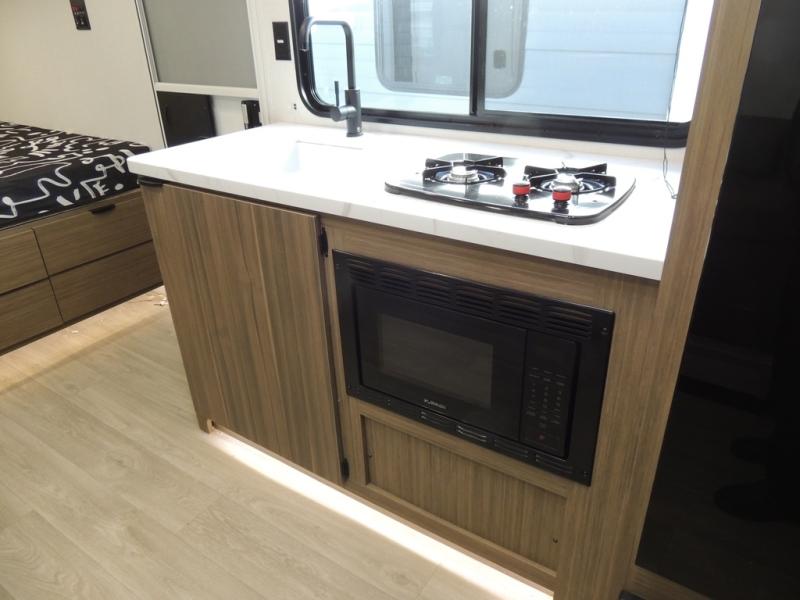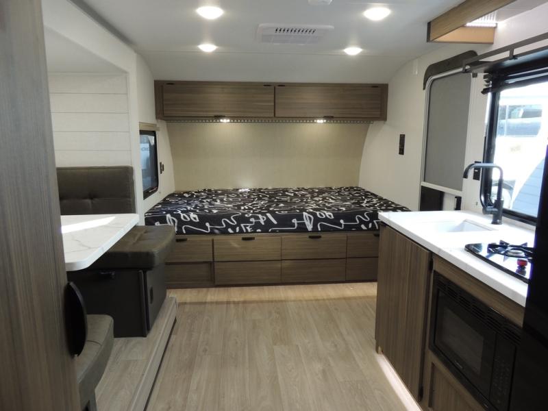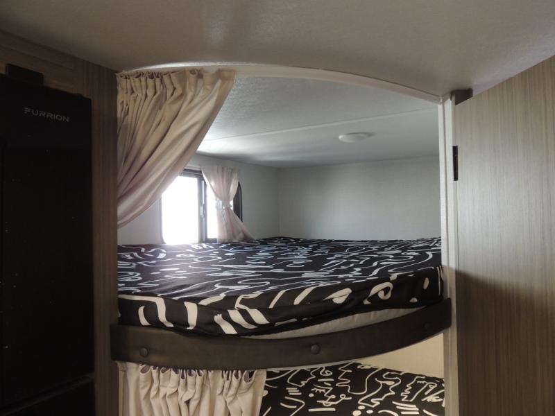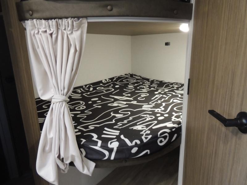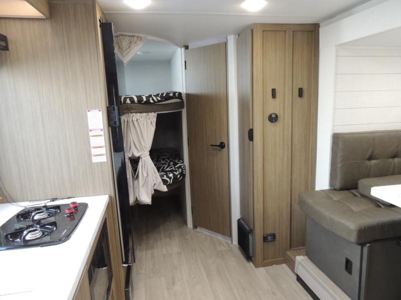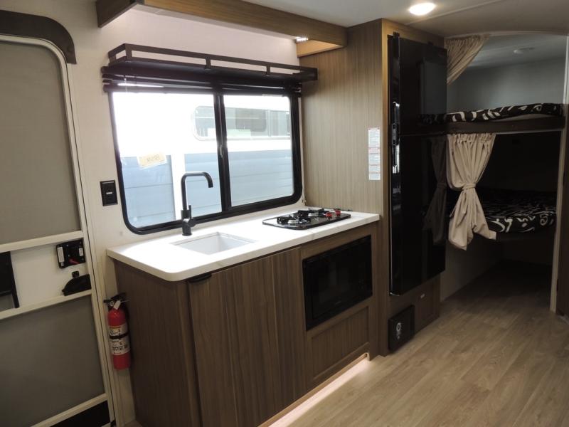 It will be so easy to enjoy time spent in this travel trailer for seven. The front queen bed provides a great night's rest, and there is an overhead cabinet to keep your things organized. Your guests or little ones can claim the double-size bunks for themselves, and there is a full bath adjacent to the bunks for easy nighttime use. A two-burner cooktop in the kitchen will let you make meals for your crew, and a refrigerator keeps leftovers fresh. You can dine at the booth dinette within the slide out or take your plate outdoors to sit under the 12' power awning.
