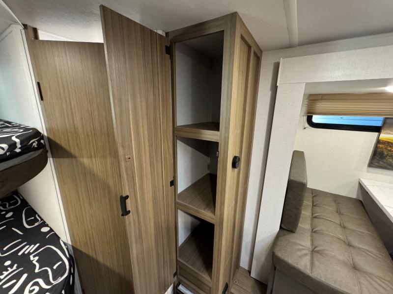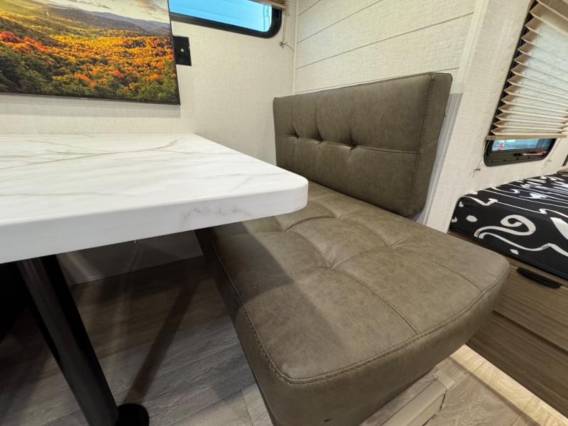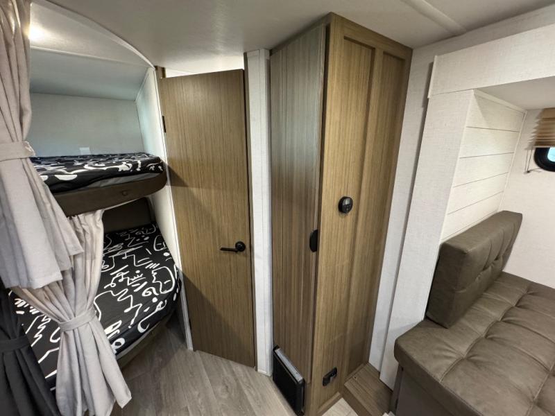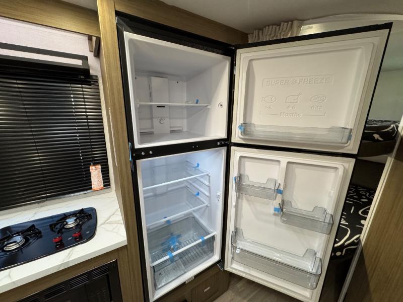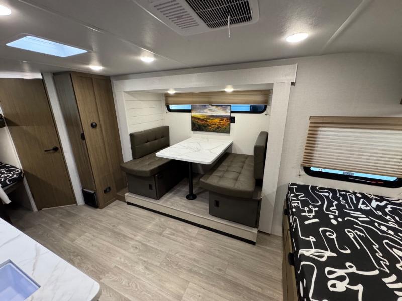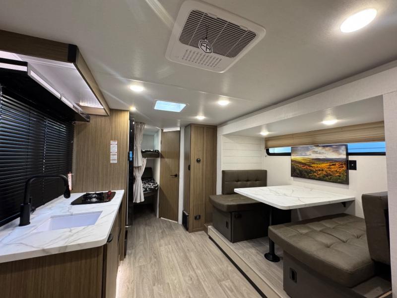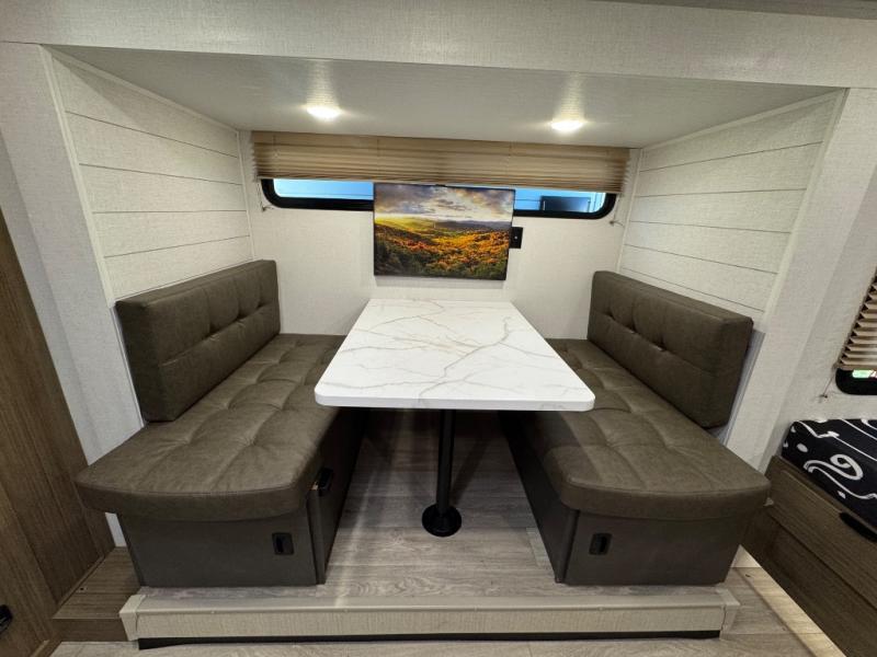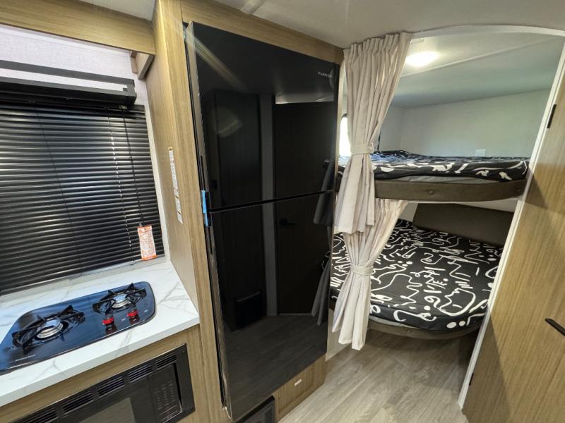 It will be so easy to enjoy time spent in this travel trailer for seven. The front queen bed provides a great night's rest, and there is an overhead cabinet to keep your things organized. Your guests or little ones can claim the double-size bunks for themselves, and there is a full bath adjacent to the bunks for easy nighttime use. A two-burner cooktop in the kitchen will let you make meals for your crew, and a refrigerator keeps leftovers fresh. You can dine at the booth dinette within the slide out or take your plate outdoors to sit under the 12' power awning.