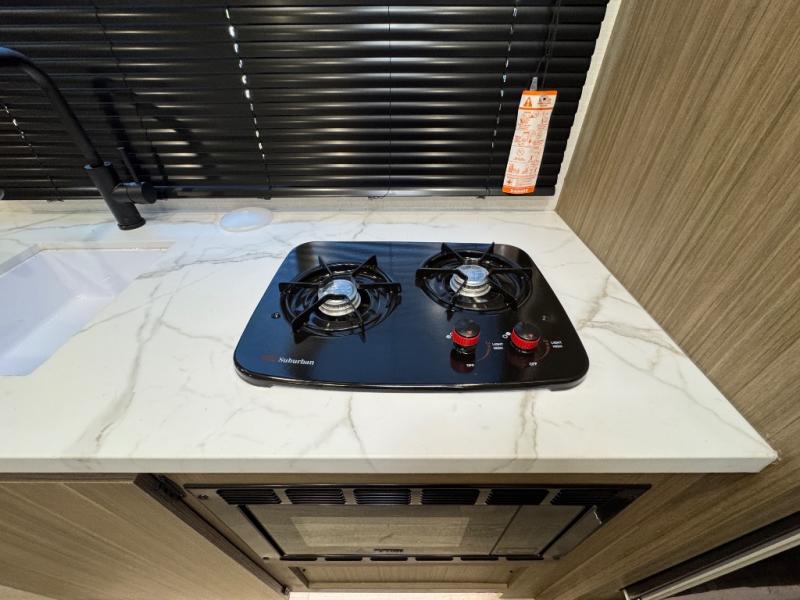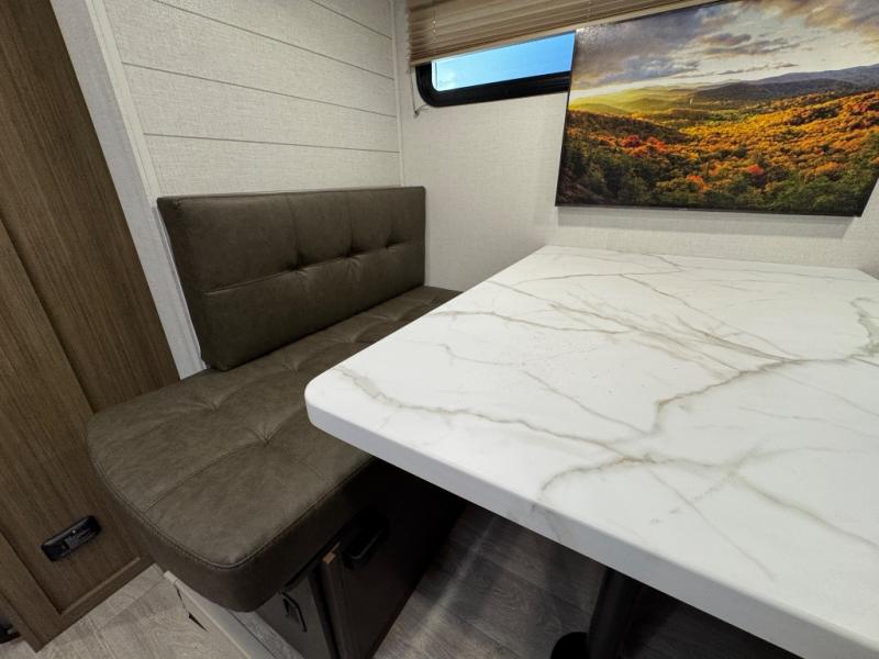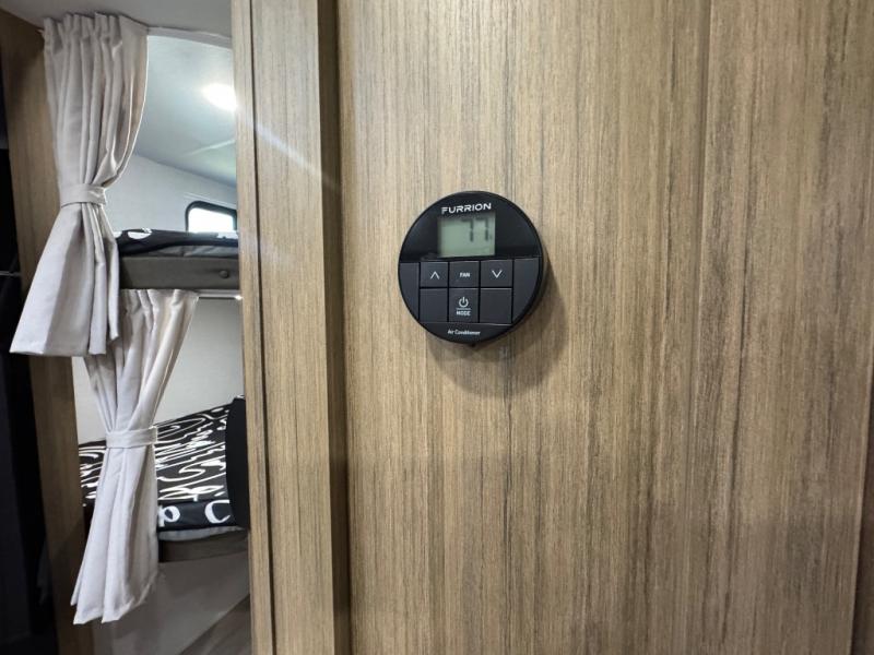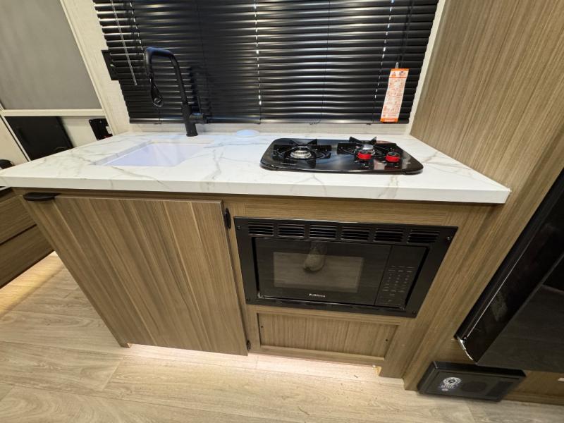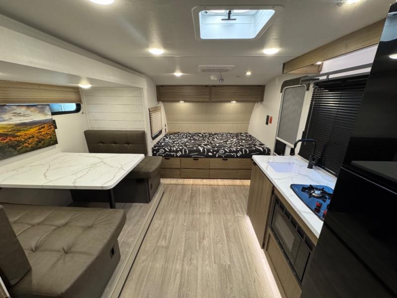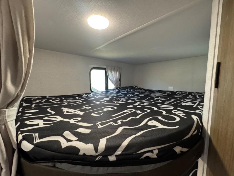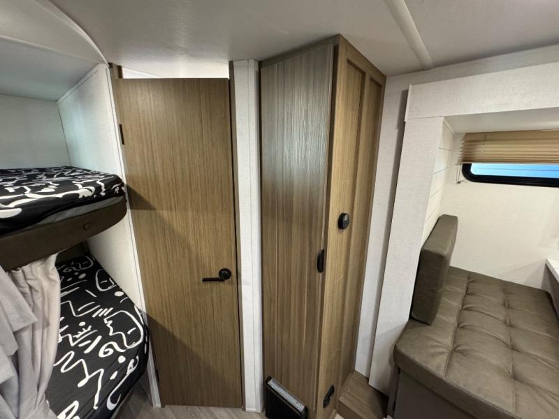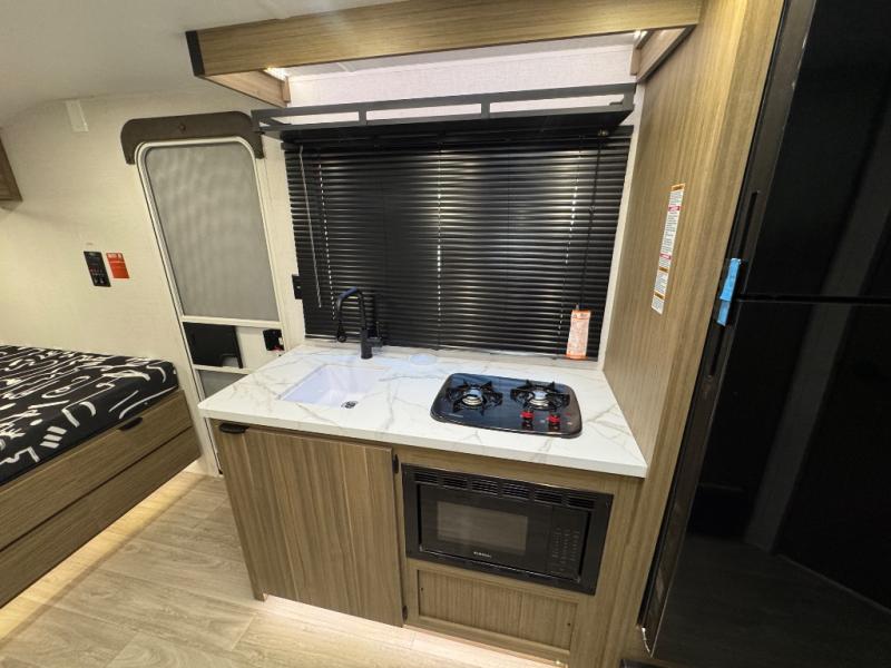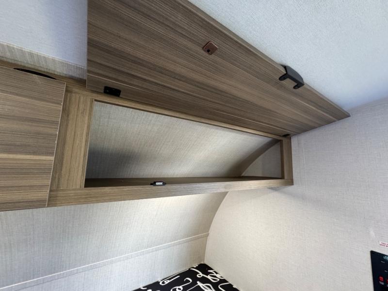 It will be so easy to enjoy time spent in this travel trailer for seven. The front queen bed provides a great night's rest, and there is an overhead cabinet to keep your things organized. Your guests or little ones can claim the double-size bunks for themselves, and there is a full bath adjacent to the bunks for easy nighttime use. A two-burner cooktop in the kitchen will let you make meals for your crew, and a refrigerator keeps leftovers fresh. You can dine at the booth dinette within the slide out or take your plate outdoors to sit under the 12' power awning.