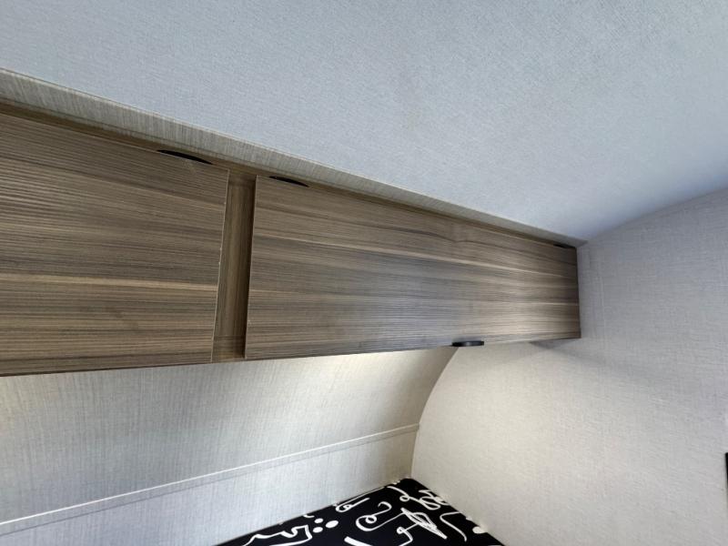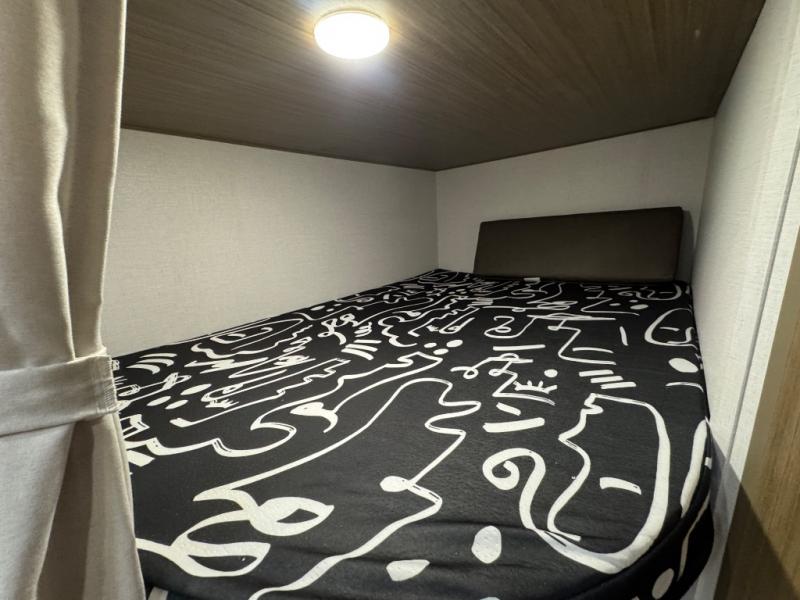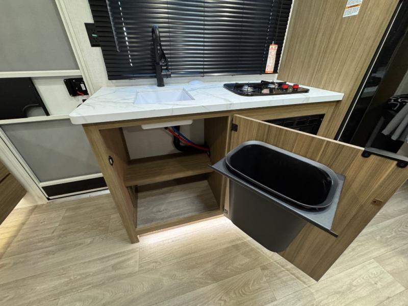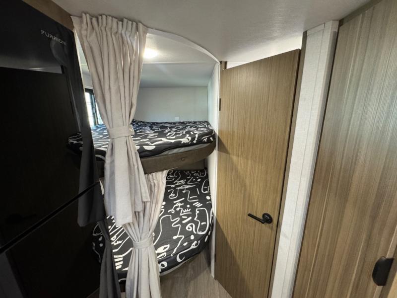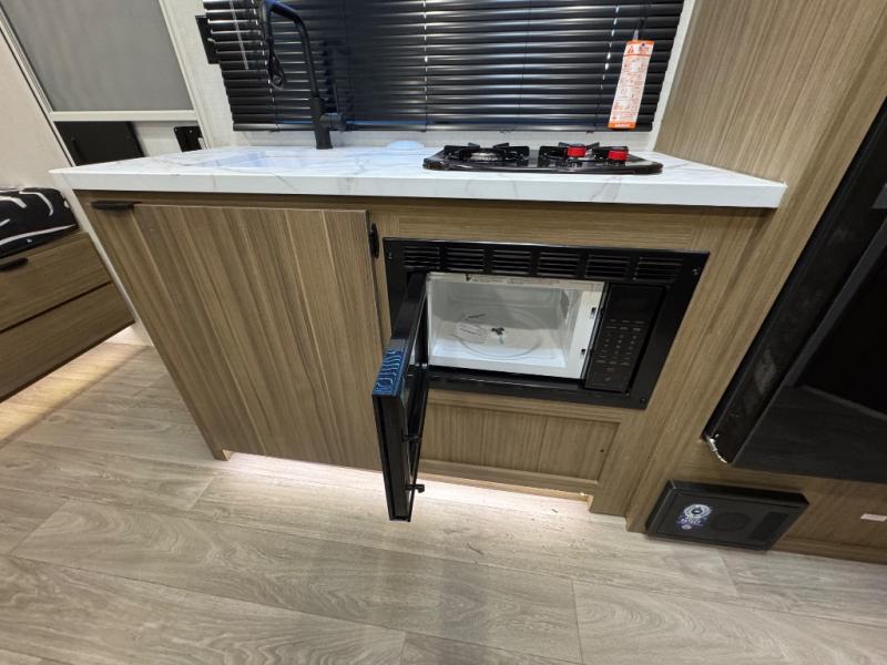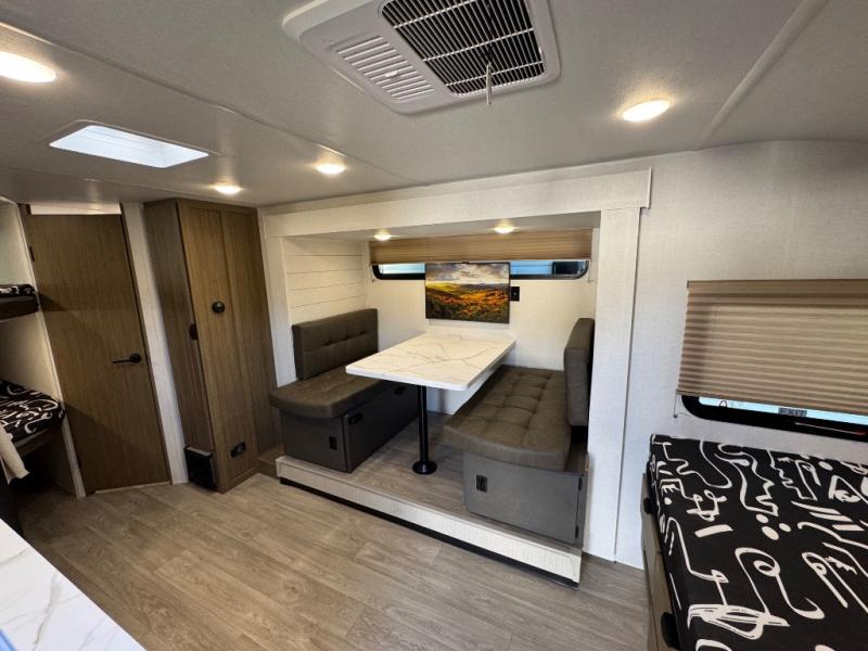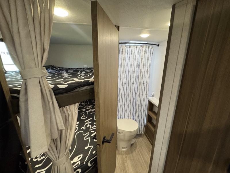 It will be so easy to enjoy time spent in this travel trailer for seven. The front queen bed provides a great night's rest, and there is an overhead cabinet to keep your things organized. Your guests or little ones can claim the double-size bunks for themselves, and there is a full bath adjacent to the bunks for easy nighttime use. A two-burner cooktop in the kitchen will let you make meals for your crew, and a refrigerator keeps leftovers fresh. You can dine at the booth dinette within the slide out or take your plate outdoors to sit under the 12' power awning.