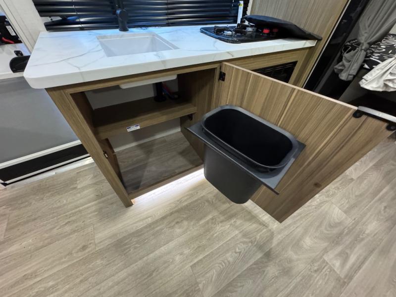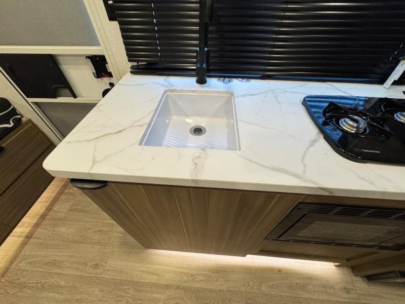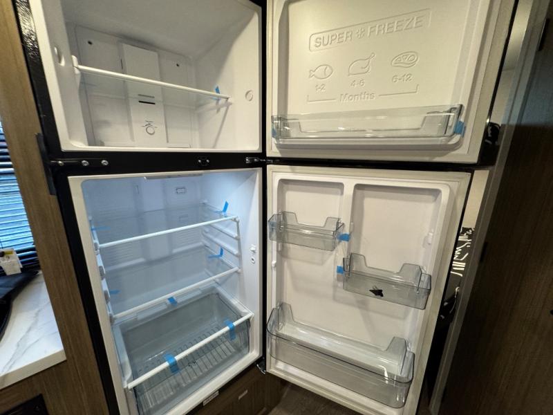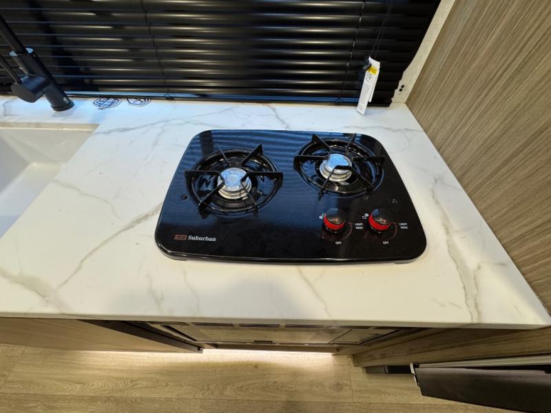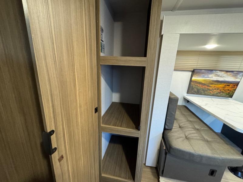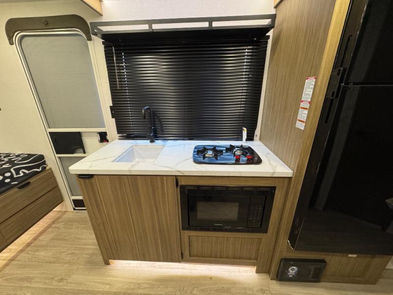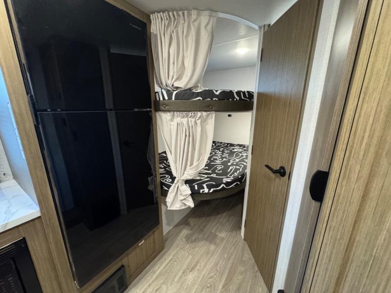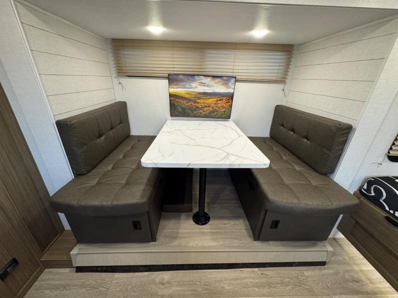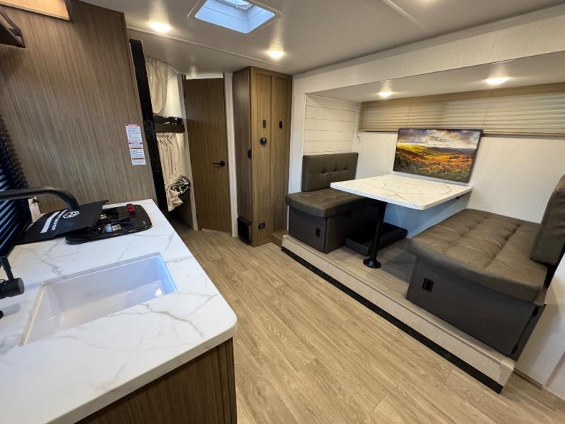 It will be so easy to enjoy time spent in this travel trailer for seven. The front queen bed provides a great night's rest, and there is an overhead cabinet to keep your things organized. Your guests or little ones can claim the double-size bunks for themselves, and there is a full bath adjacent to the bunks for easy nighttime use. A two-burner cooktop in the kitchen will let you make meals for your crew, and a refrigerator keeps leftovers fresh. You can dine at the booth dinette within the slide out or take your plate outdoors to sit under the 15' power awning.