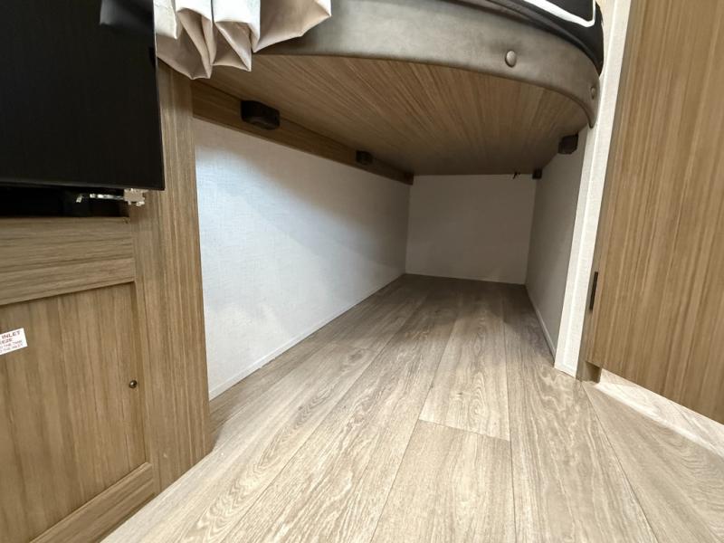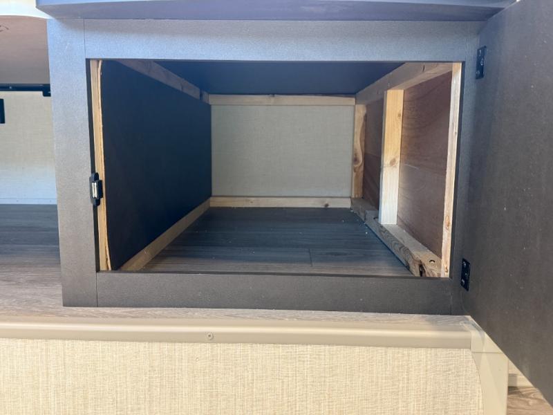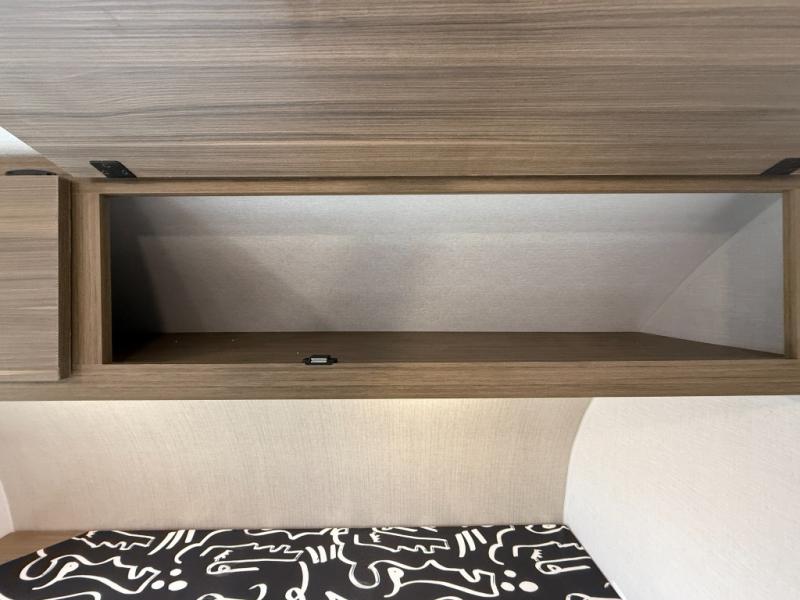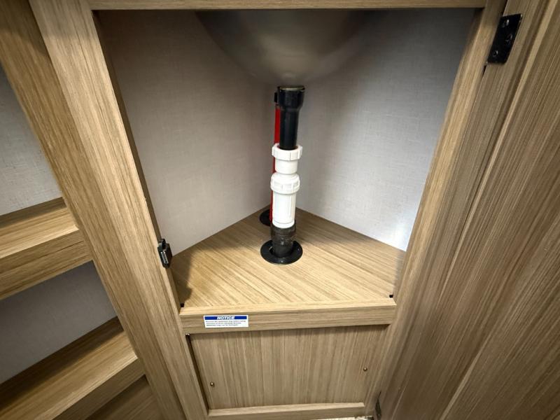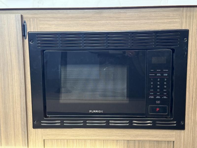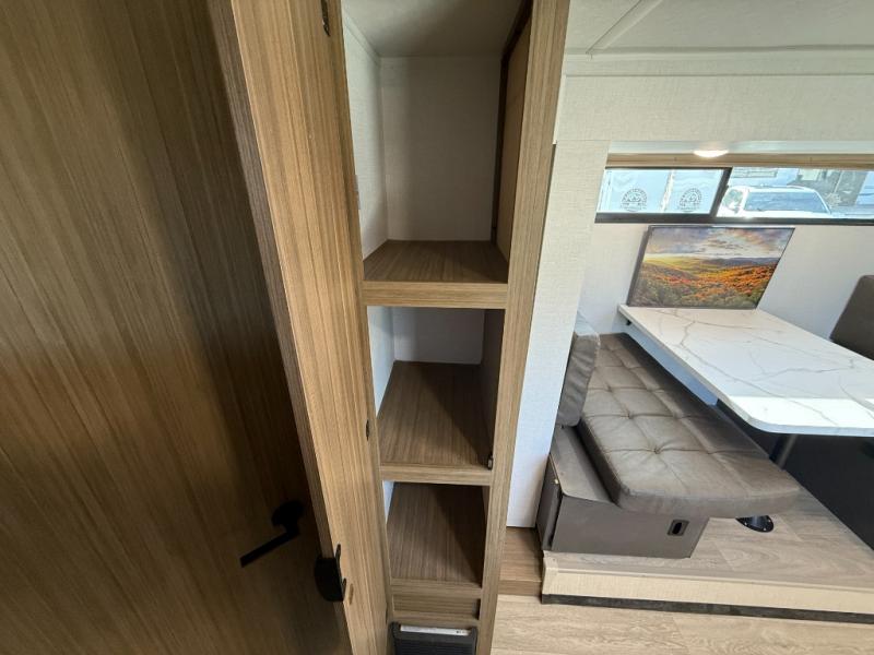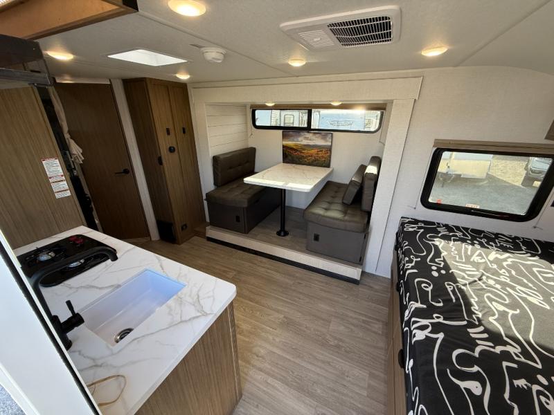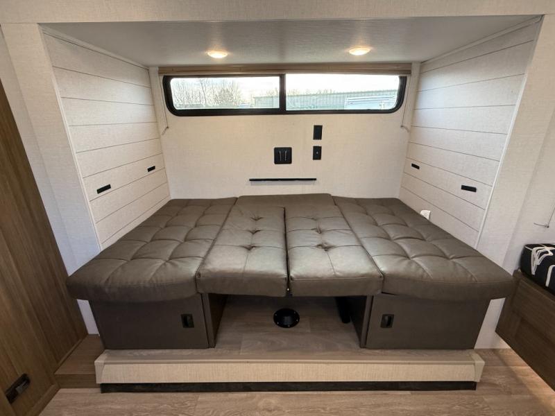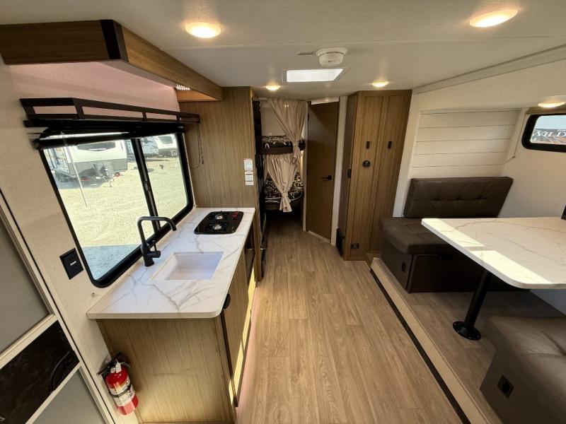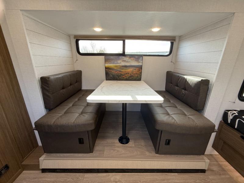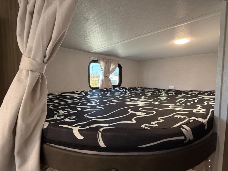 It will be so easy to enjoy time spent in this travel trailer for seven. The front queen bed provides a great night's rest, and there is an overhead cabinet to keep your things organized. Your guests or little ones can claim the double-size bunks for themselves, and there is a full bath adjacent to the bunks for easy nighttime use. A two-burner cooktop in the kitchen will let you make meals for your crew, and a refrigerator keeps leftovers fresh. You can dine at the booth dinette within the slide out or take your plate outdoors to sit under the 12' power awning.
