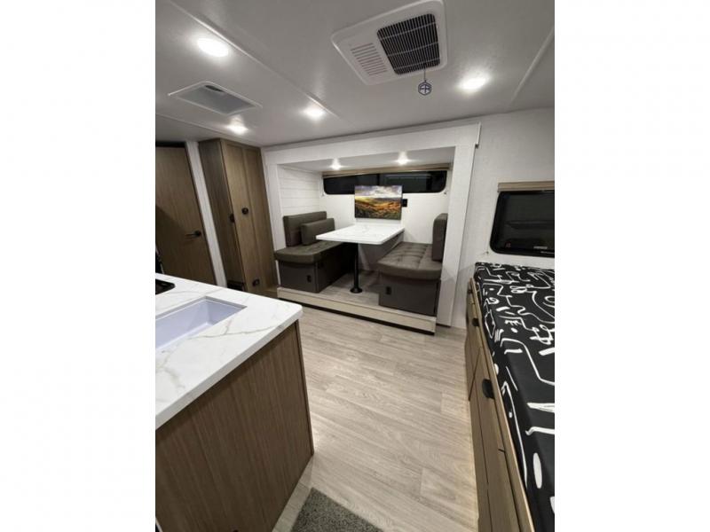 It will be so easy to enjoy time spent in this travel trailer for seven. The front queen bed provides a great night's rest, and there is an overhead cabinet to keep your things organized. Your guests or little ones can claim the double-size bunks for themselves, and there is a full bath adjacent to the bunks for easy nighttime use. A two-burner cooktop in the kitchen will let you make meals for your crew, and a refrigerator keeps leftovers fresh. You can dine at the booth dinette within the slide out or take your plate outdoors to sit under the 15' power awning.