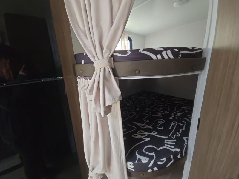 It will be so easy to enjoy time spent in this travel trailer for seven. The front queen bed provides a great night's rest, and there is an overhead cabinet to keep your things organized. Your guests or little ones can claim the double-size bunks for themselves, and there is a full bath adjacent to the bunks for easy nighttime use. A two-burner cooktop in the kitchen will let you make meals for your crew, and a refrigerator keeps leftovers fresh. You can dine at the booth dinette within the slide out or take your plate outdoors to sit under the 15' power awning.