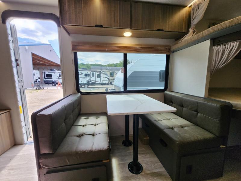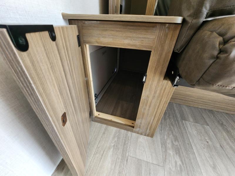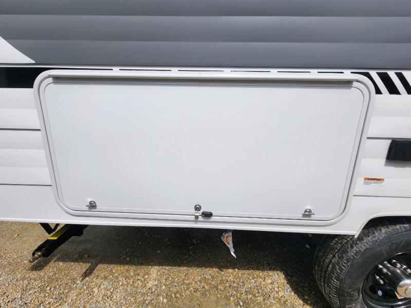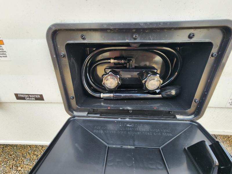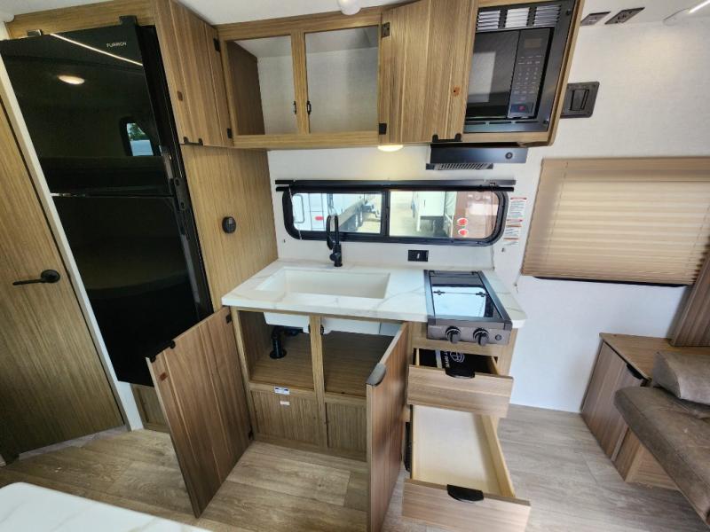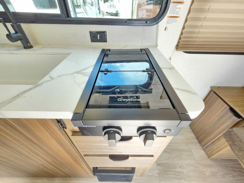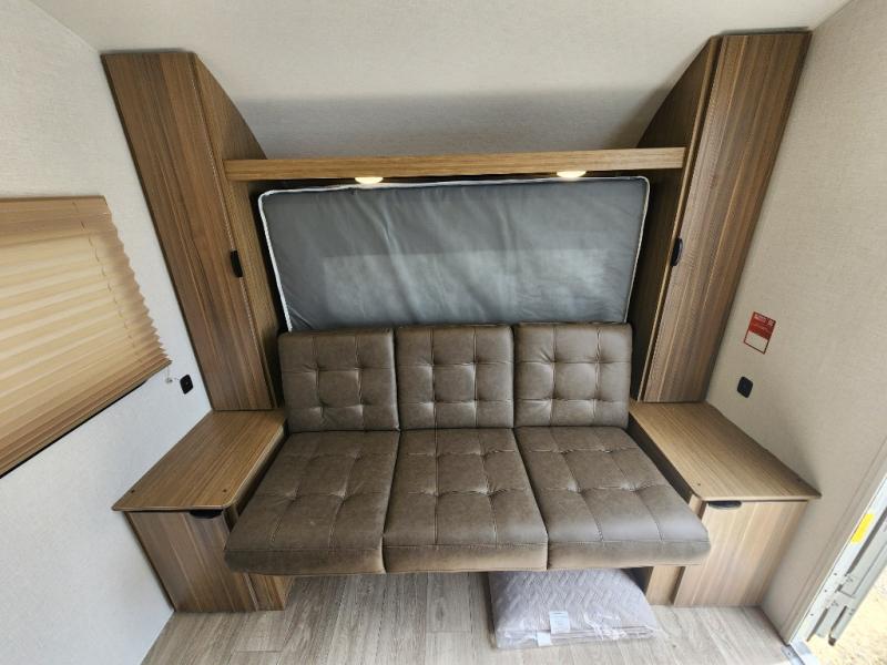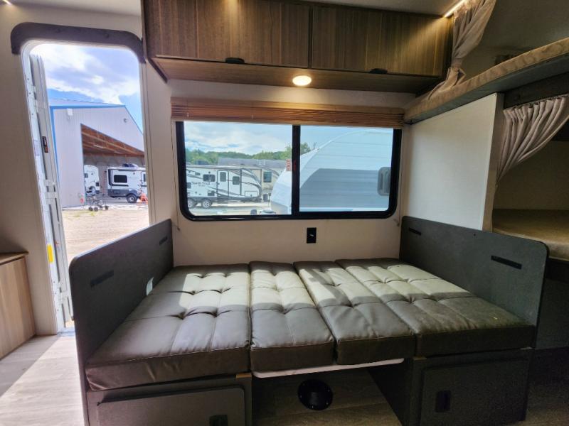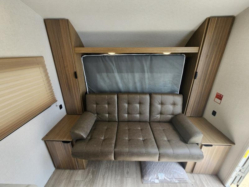 No need will go unmet with this travel trailer! It features a front Murphy bed that will double as seating and sleeping space, double-size bunk beds with storage, plus a booth dinette. You can prepare your best home cooked meals indoors with the two burner cooktop or head to the outside kitchen to fry up some burgers while breathing in some fresh air. You will also appreciate the outside shower and the front exterior full pass-through storage area for all your outdoor gear.