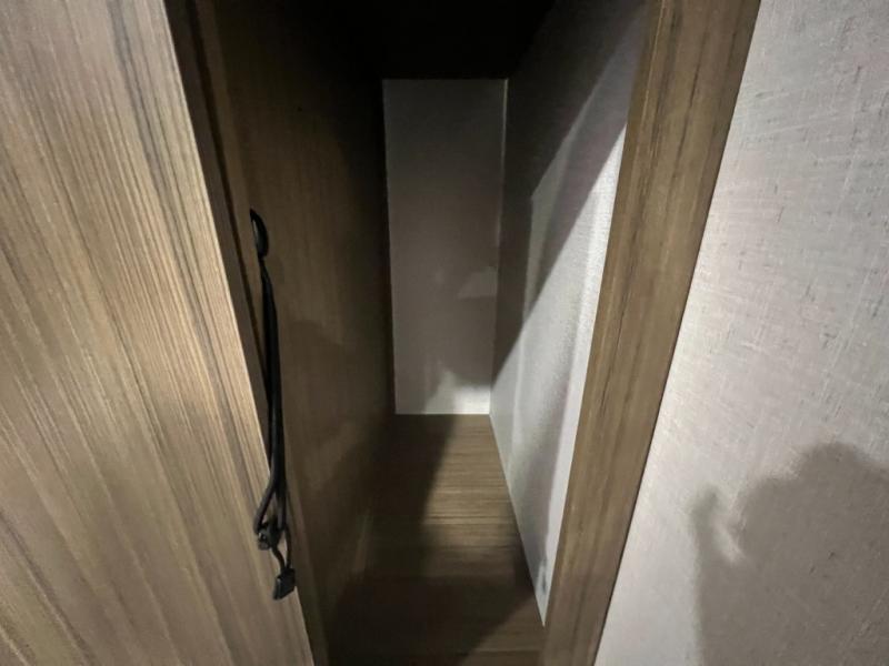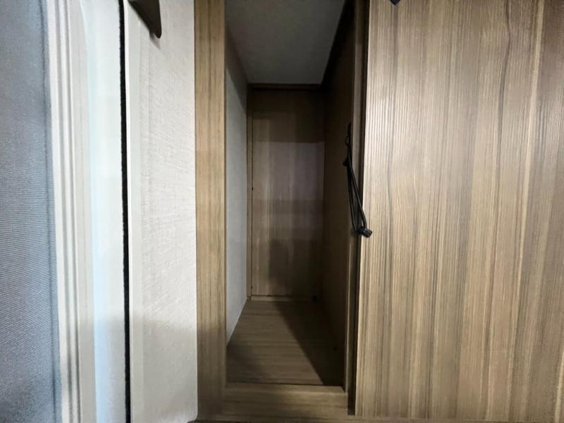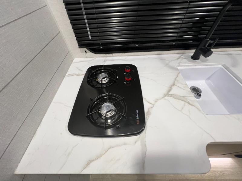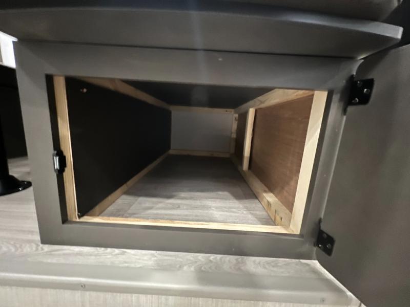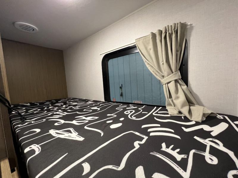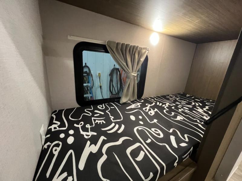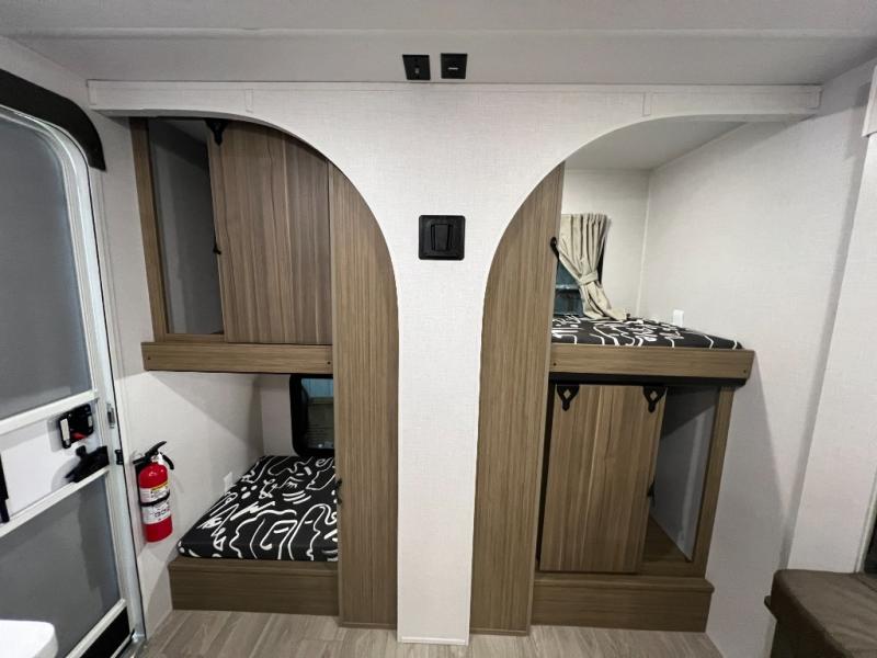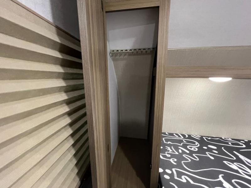 Your guest or little ones will love the bunk beds on this model since each bunk includes a private door which can be shut for privacy! You'll find the front 60" x 72" platform bed to be cozy and convenient since there are overhead cabinets and a closet for your things. Once you've made lunch on the two-burner cooktop, you can dine at the booth dinette slide out. There is also a 12V refrigerator here and shelves for more storage!