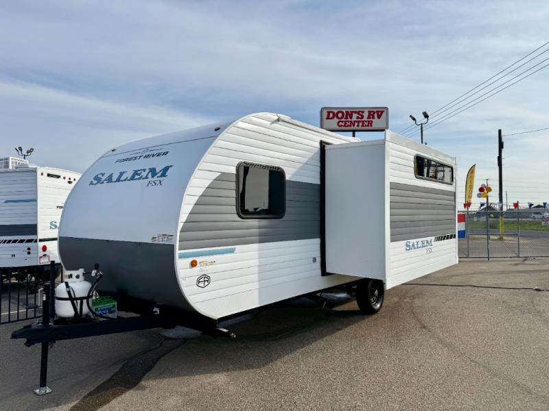 The Forest River Salem FSX travel trailers and toy hauler travel trailers are ultra comfortable and lightweight, perfect for first time or seasoned campers alike! You will love how easy it will be to relax with residential features that will make your space feel just like home, and the durable construction means you can enjoy your RV for years to come. There are a wide variety of floorplans to choose from, including couple's trailers, bunk models, and toy haulers, all with full bath and kitchen amenities and plenty of storage for all your gear!