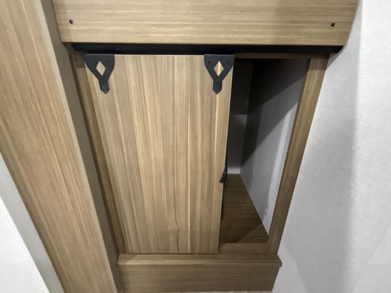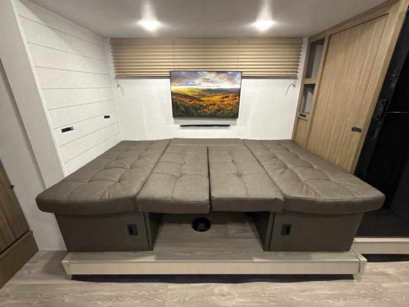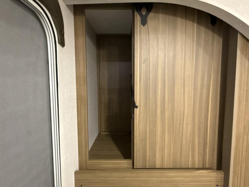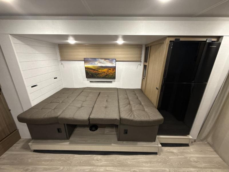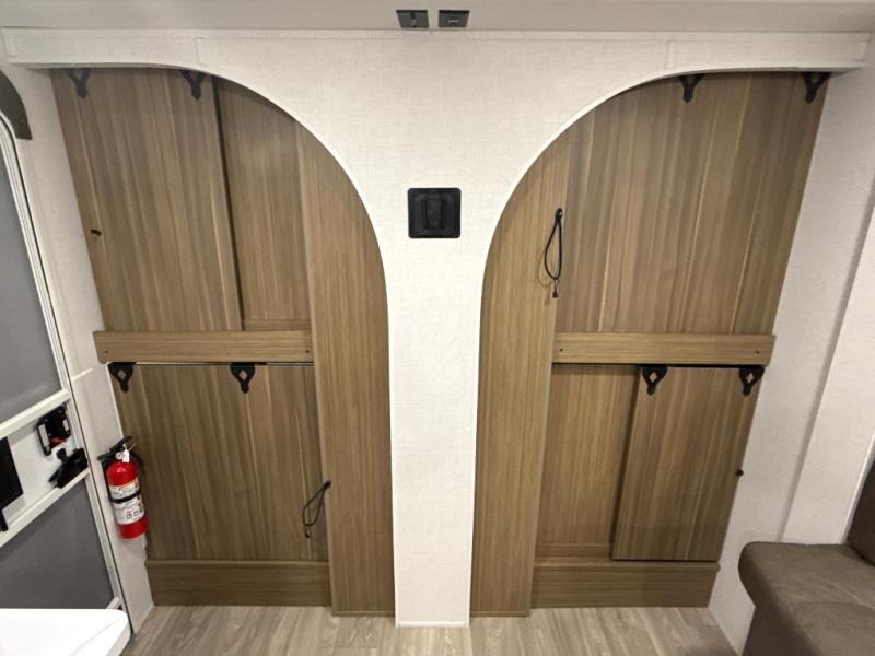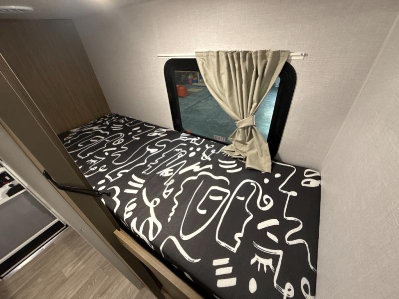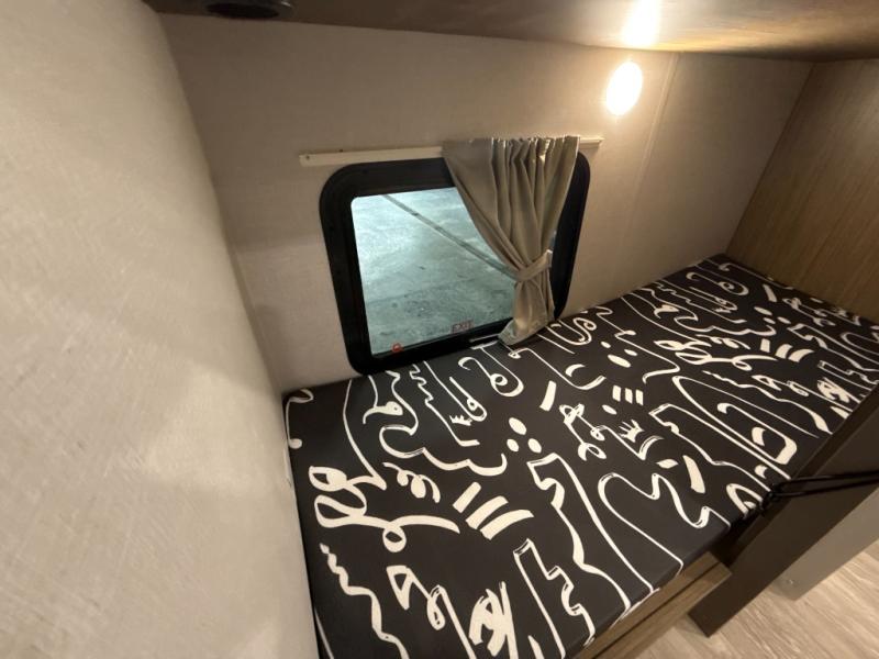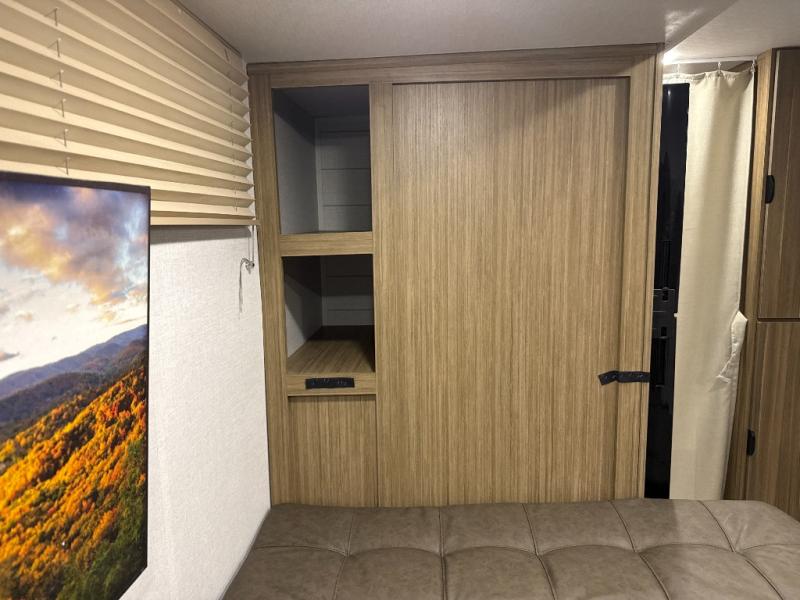 Your guest or little ones will love the bunk beds on this model since each bunk includes a private door which can be shut for privacy! You'll find the front 60" x 72" platform bed to be cozy and convenient since there are overhead cabinets and a closet for your things. Once you've made lunch on the two-burner cooktop, you can dine at the booth dinette slide out. There is also a 12V refrigerator here and shelves for more storage!