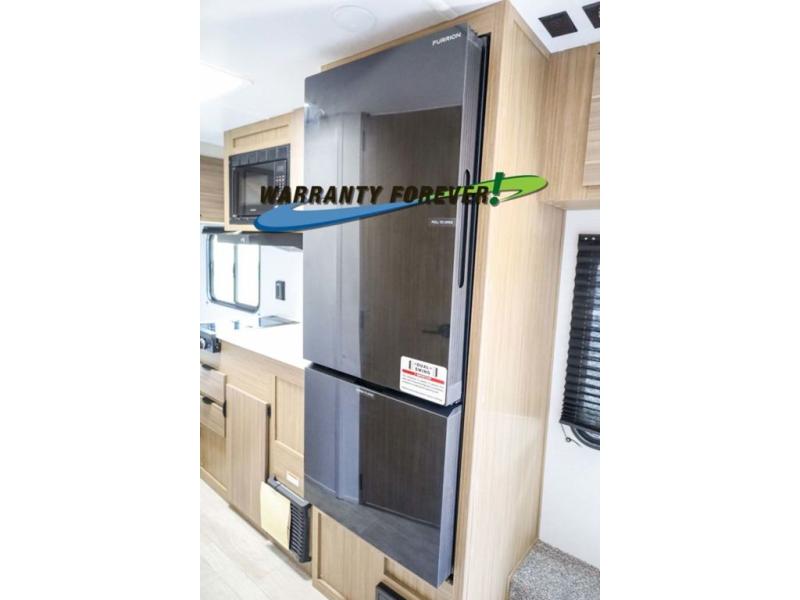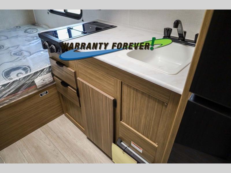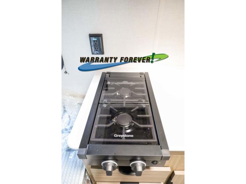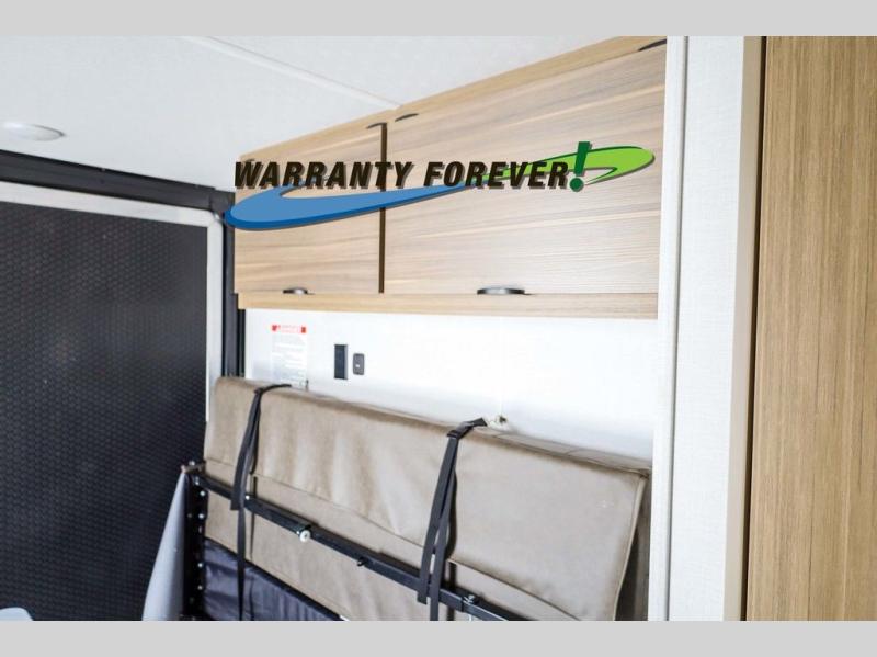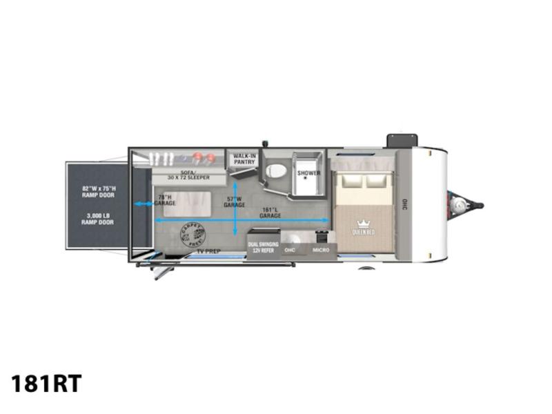 You don't have to leave your favorite off-road toys home with this toy hauler! They can easily be loaded with the 82" x 75" 3,000 lb. ramp door, and stored in the 13' 5" total garage length when you utilize the space to the front bed. Once you have arrived, you can set up the flip down sofa with removable table, unpack the pass-through storage, and grab a snack from the walk-in pantry. The private bathroom has a shower to freshen up in each morning. Prepare your best meals with the two burner cooktop and store any leftovers in the refrigerator. Get a good night's rest on the front queen bed, and store your belongings in the overhead cabinet.