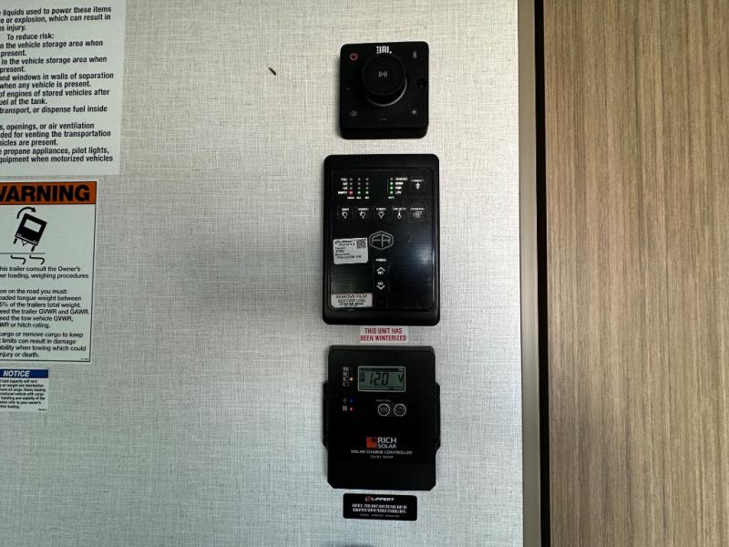 There is plenty of room in this toy hauler for your off-road toys and to comfortably live at the campsite! The 3,000 lb. ramp door makes it easy to load your toys, the 1,500 lb. tie downs will keep them securely in place, and the party patio with 1,500 lb. max weight capacity is the perfect place to socialize together and share stories. Keep your bellies full with the two burner cooktop and your perishables fresh with the 12V refrigerator. Everyone will have a comfortable place to sleep between the two 30" x 72" sofa sleepers and the front queen bed with a shelf above and wardrobe to keep your clothes looking nice, plus there are USB ports to keep your electronics at 100%. Freshen up each morning in the full bathroom with the shower with a skylight above for natural lighting!