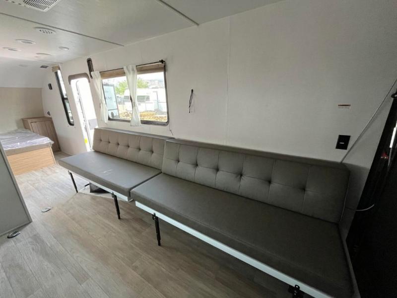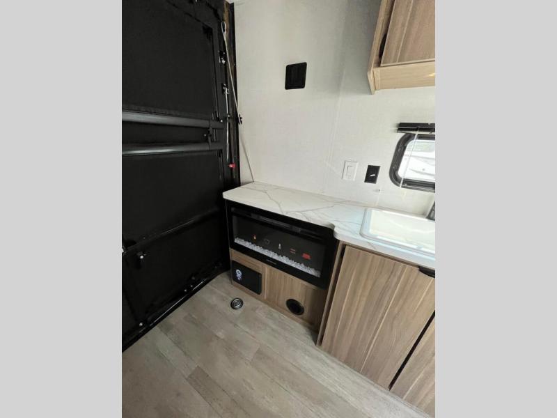 Be ready for anything with this toy hauler in tow! After you've unloaded your toys from the 3,000 lb. ramp door, enjoy the 1,500 lb. capacity patio with a cold drink in hand. There are two sofas inside the garage, plus a fireplace for those chilly nights. The chef of your group will have a full kitchen, complete with a microwave oven and a 12V refrigerator. The full bath includes a shower skylight that will not only let natural light in, but also provide more standing space. And check out the front bedroom with a queen bed and storage space for your belongings.