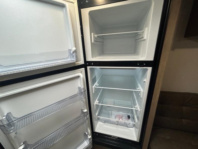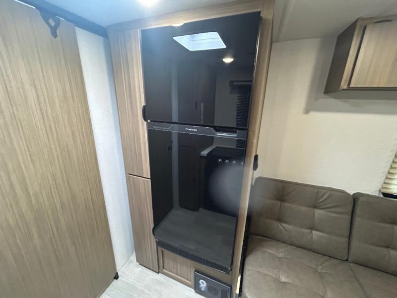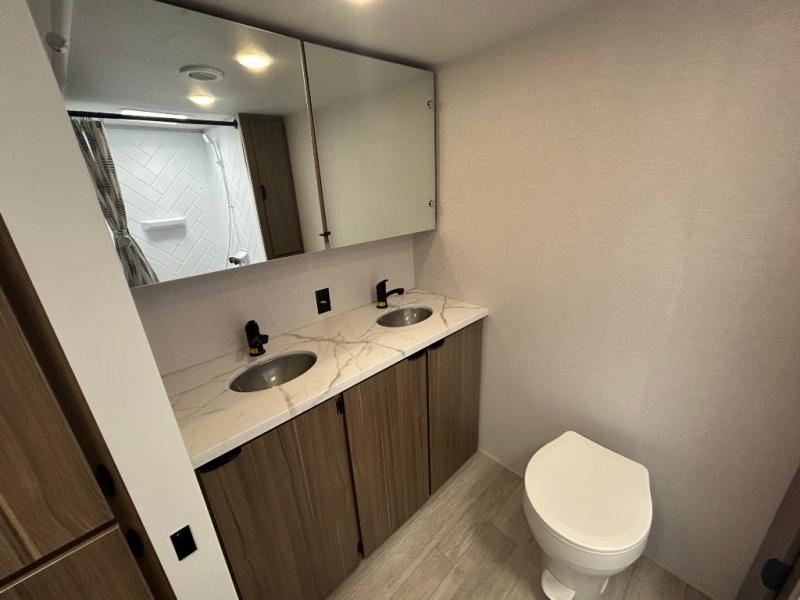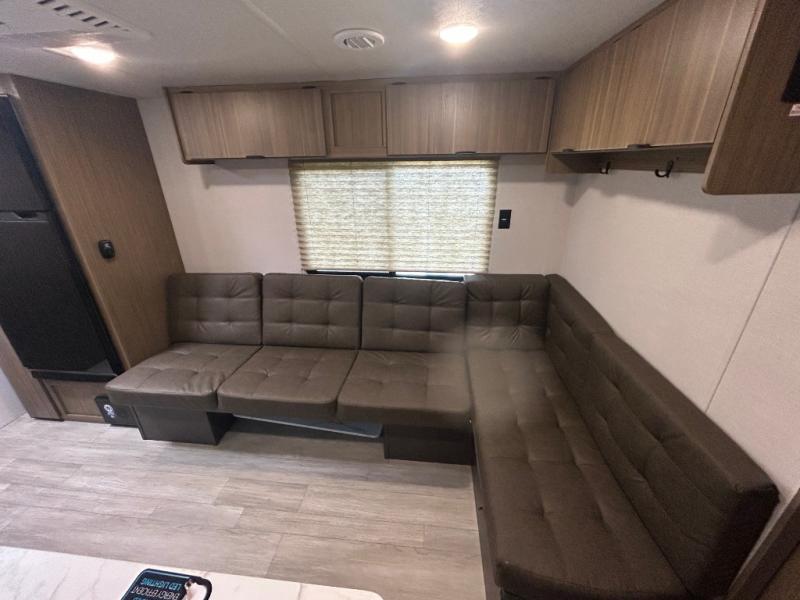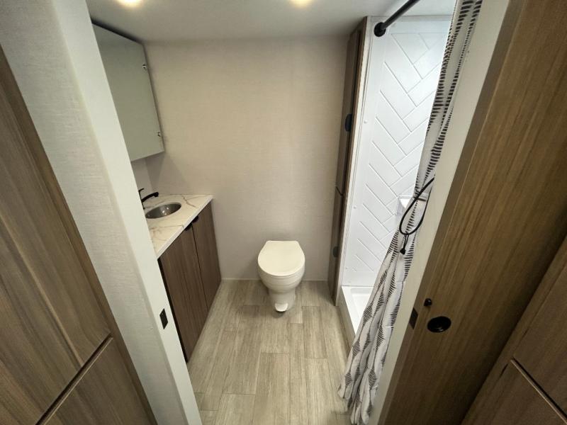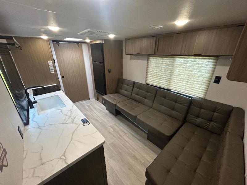 Camping is made easy in this travel trailer with at-home comforts! You'll have the front private bedroom with a king bed all to yourselves, and there are dual bedroom wardrobes to keep your space neat and clean. Any additional guests can sleep on the super lounge with a removable table. You will appreciate the full rear bath complete with a linen closet and dual bath sinks so you both can get ready for bed at once. And a full kitchen lets you whip up your best meals!