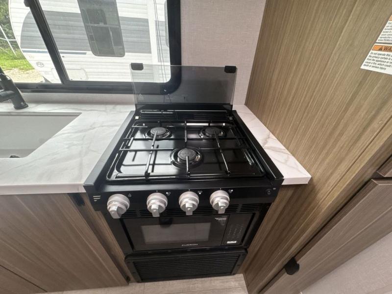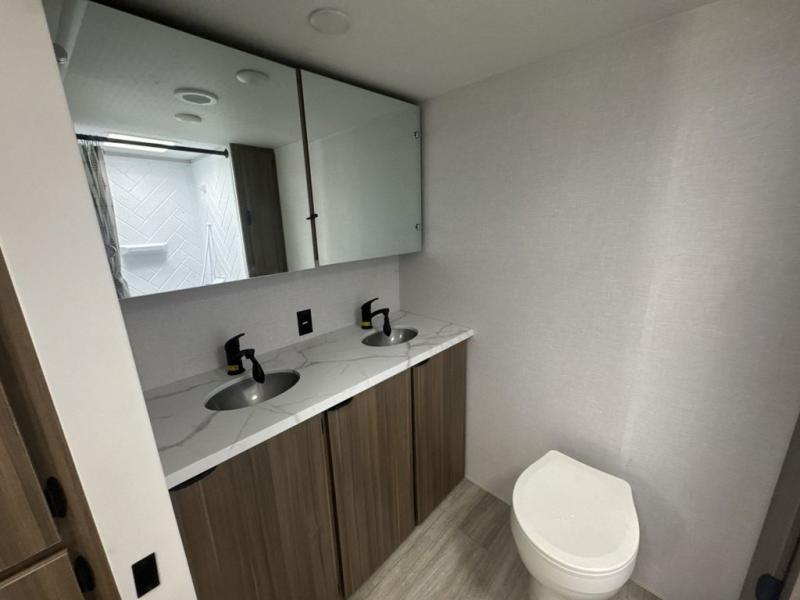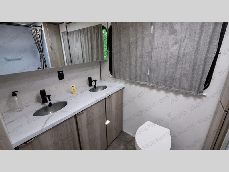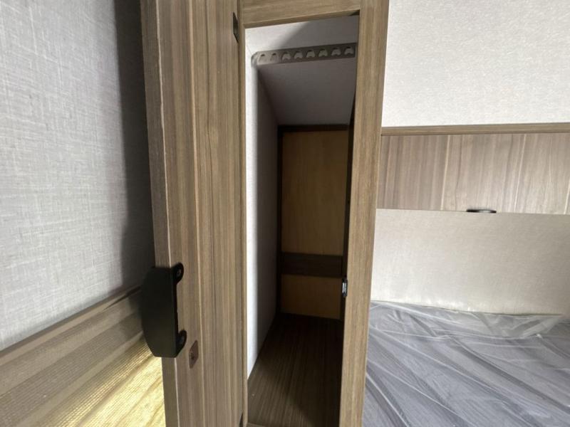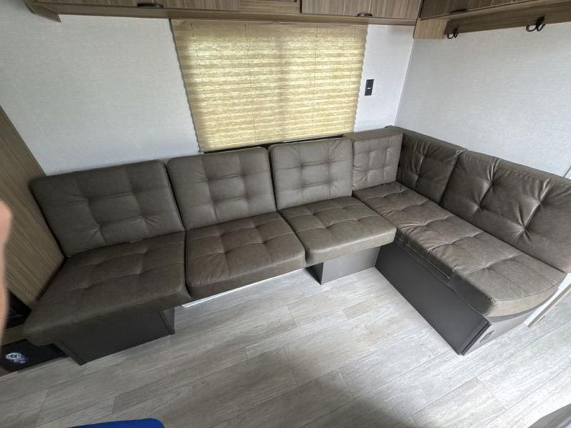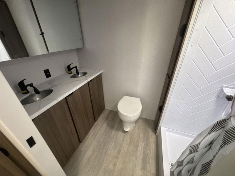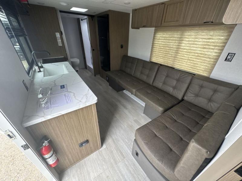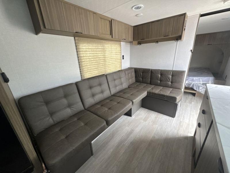 Camping is made easy in this travel trailer with at-home comforts! You'll have the front private bedroom with a king bed all to yourselves, and there are dual bedroom wardrobes to keep your space neat and clean. Any additional guests can sleep on the super lounge with a removable table. You will appreciate the full rear bath complete with a linen closet and dual bath sinks so you both can get ready for bed at once. And a full kitchen lets you whip up your best meals!