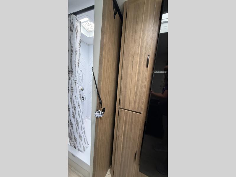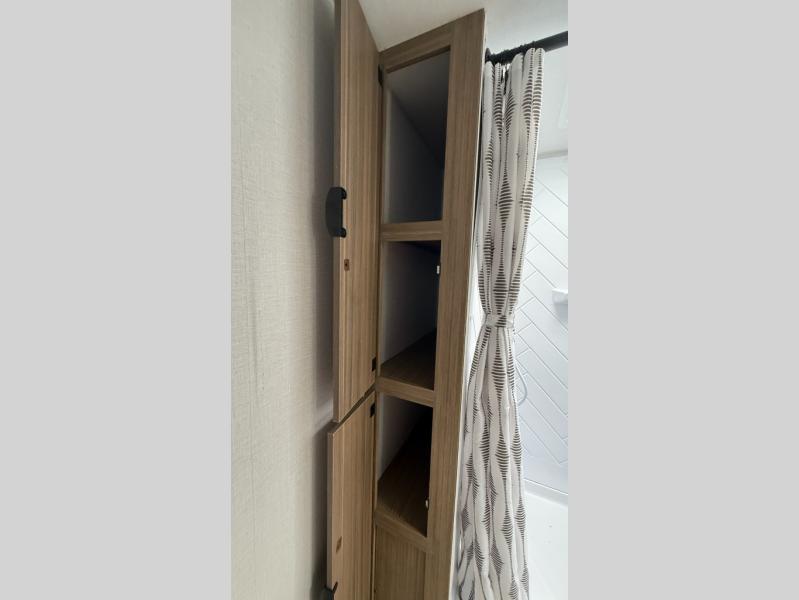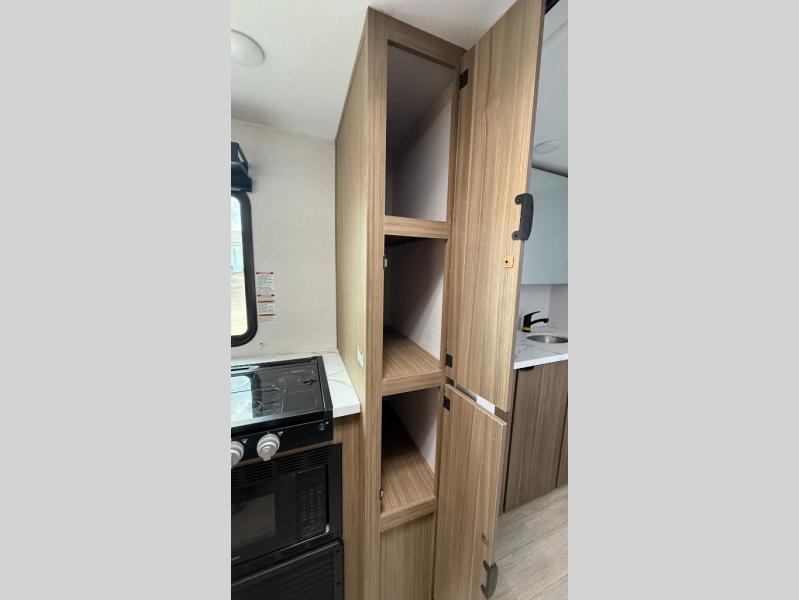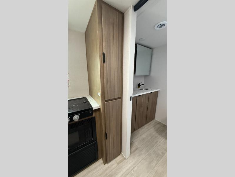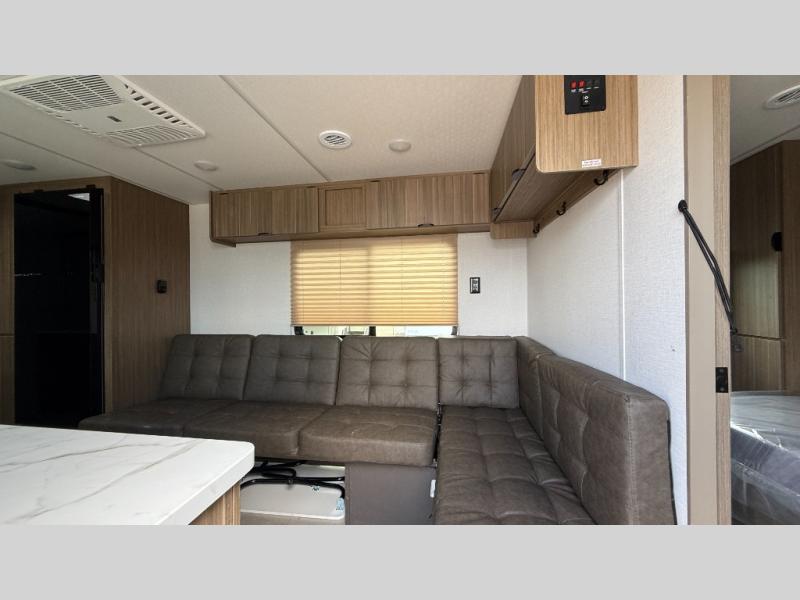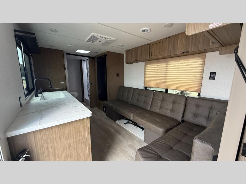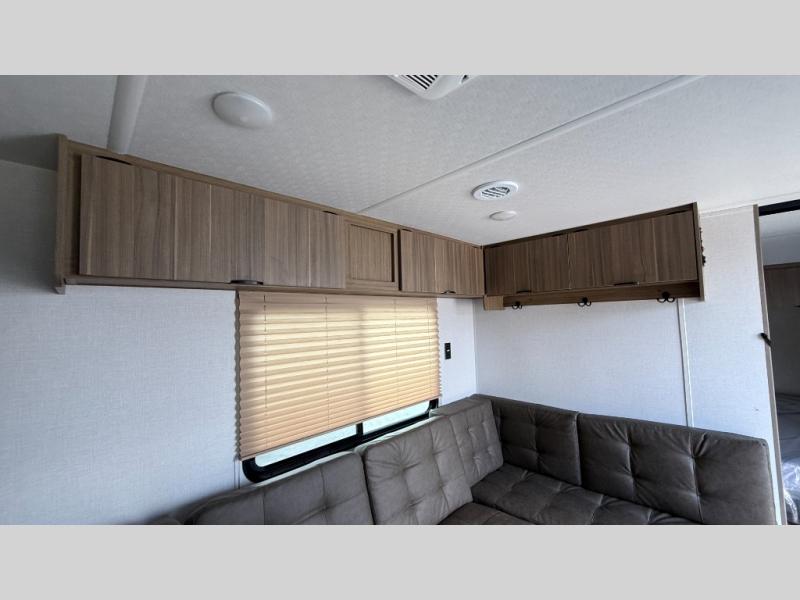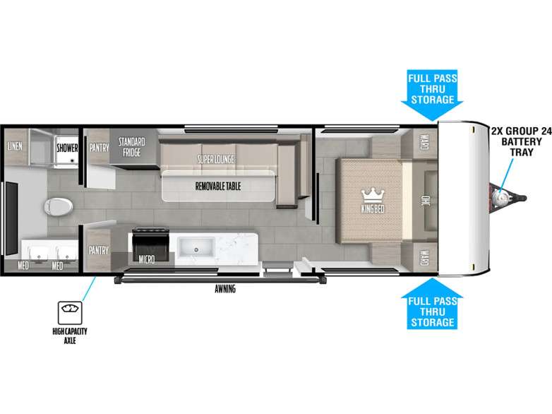 Camping is made easy in this travel trailer with at-home comforts! You'll have the front private bedroom with a king bed all to yourselves, and there are dual bedroom wardrobes to keep your space neat and clean. Any additional guests can sleep on the super lounge with a removable table. You will appreciate the full rear bath complete with a linen closet and dual bath sinks so you both can get ready for bed at once. And a full kitchen lets you whip up your best meals!