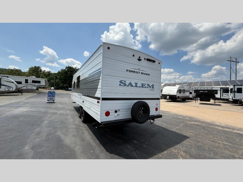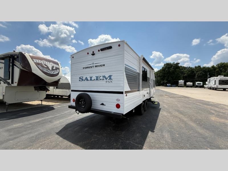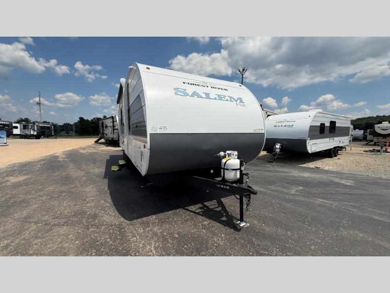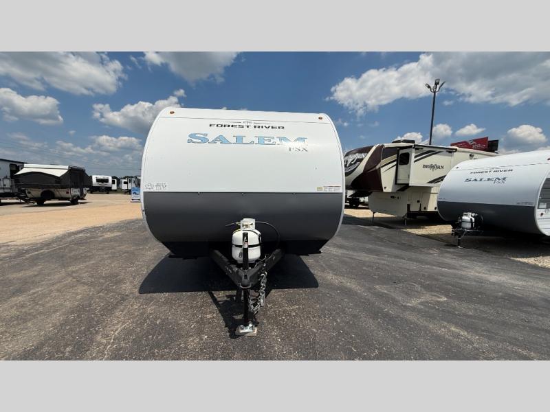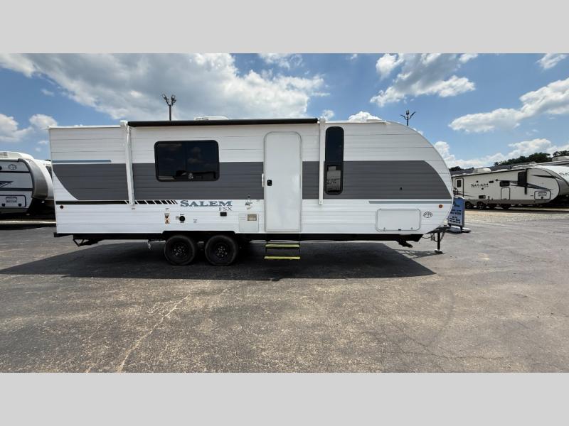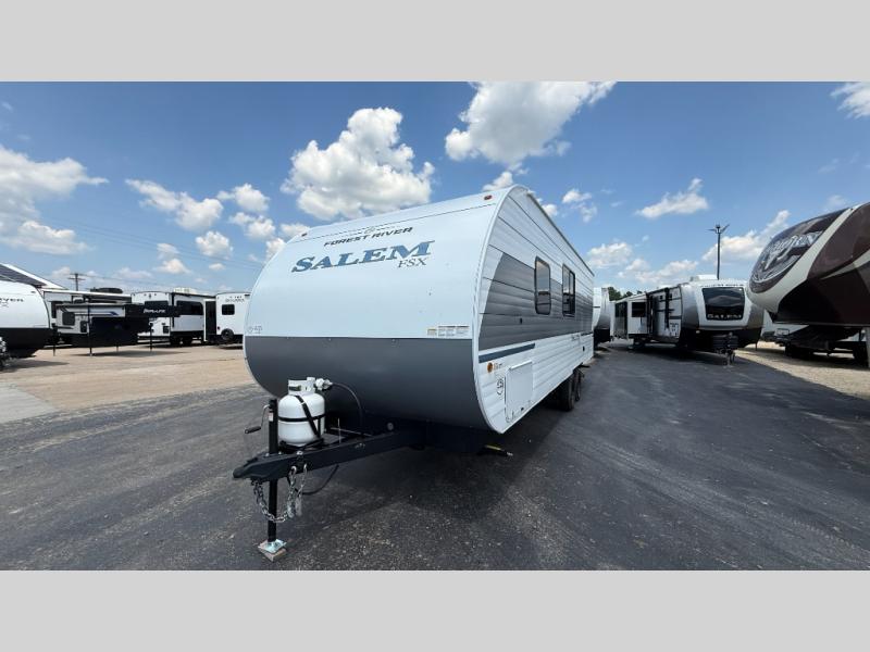 The Forest River Salem FSX travel trailers and toy hauler travel trailers are ultra comfortable and lightweight, perfect for first time or seasoned campers alike! You will love how easy it will be to relax with residential features that will make your space feel just like home, and the durable construction means you can enjoy your RV for years to come. There are a wide variety of floorplans to choose from, including couple's trailers, bunk models, and toy haulers, all with full bath and kitchen amenities and plenty of storage for all your gear!