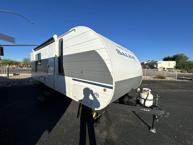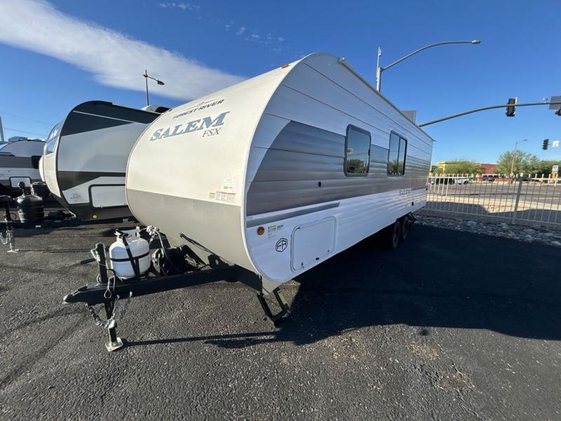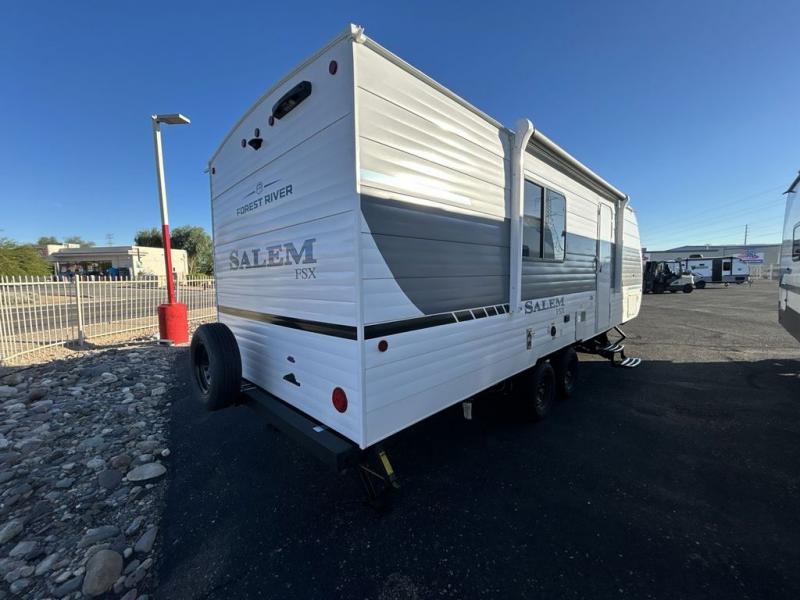 The Forest River Salem FSX travel trailers and toy hauler travel trailers are ultra comfortable and lightweight, perfect for first time or seasoned campers alike! You will love how easy it will be to relax with residential features that will make your space feel just like home, and the durable construction means you can enjoy your RV for years to come. There are a wide variety of floorplans to choose from, including couple's trailers, bunk models, and toy haulers, all with full bath and kitchen amenities and plenty of storage for all your gear!
