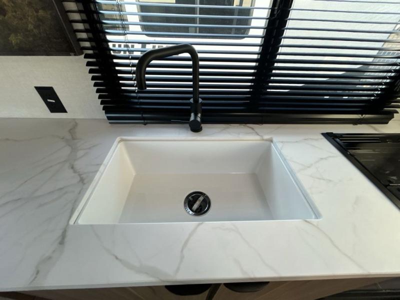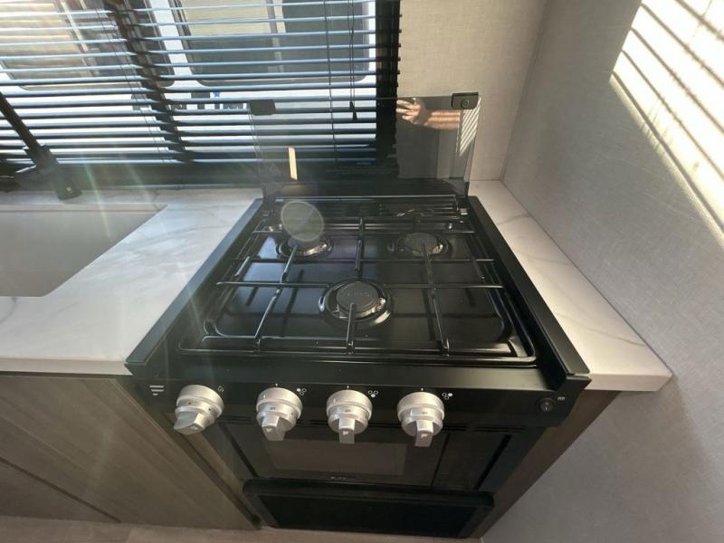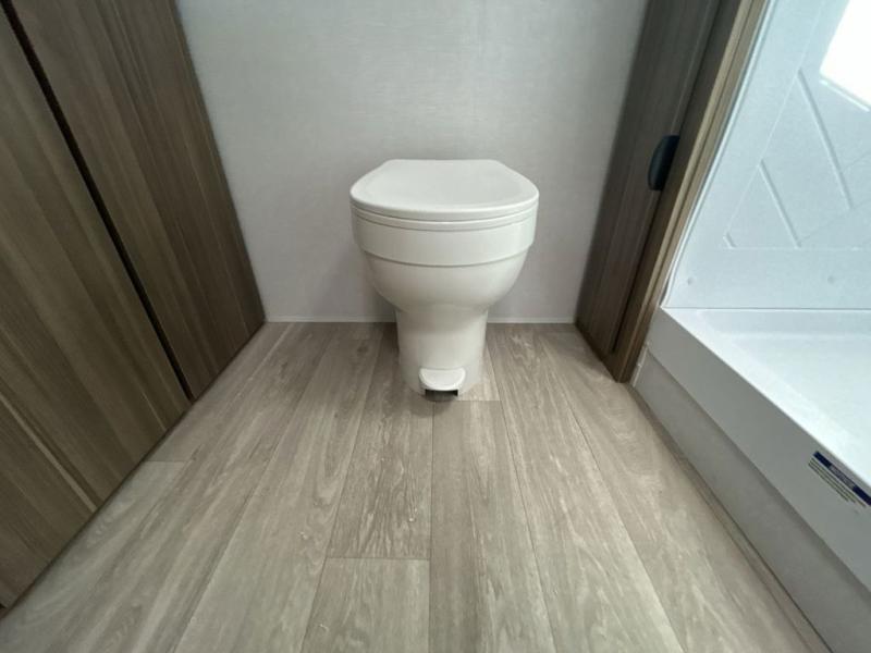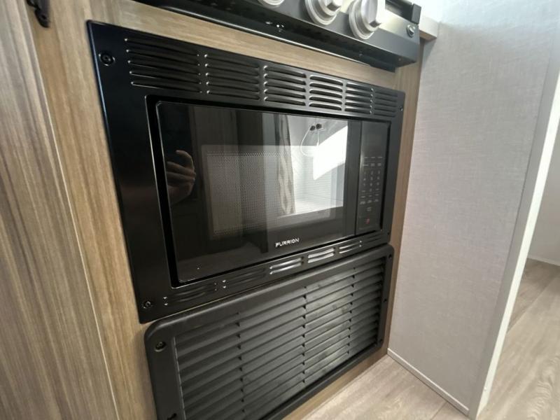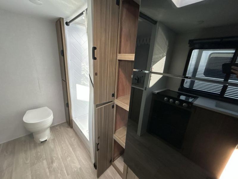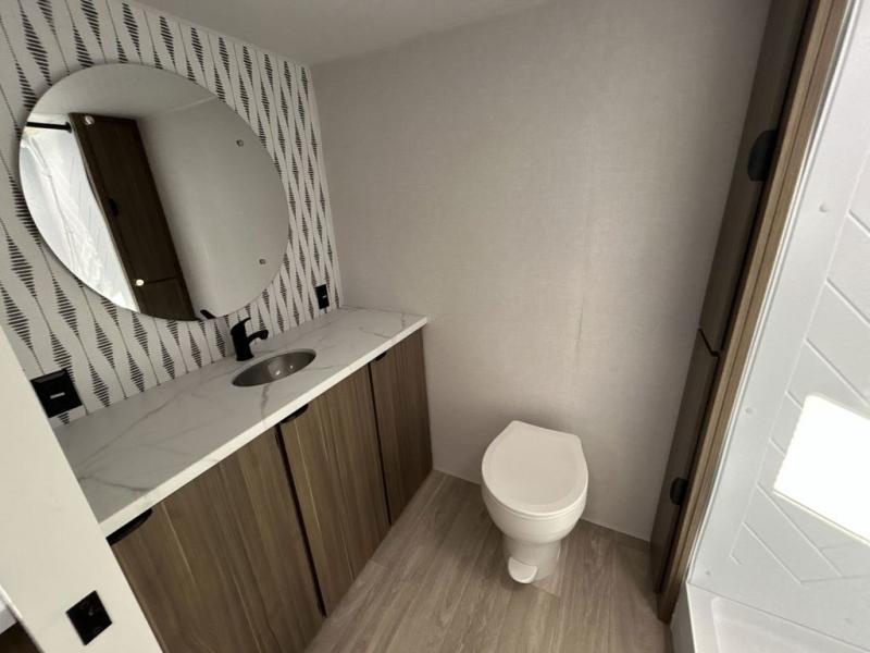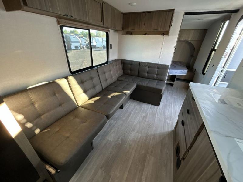Camping is made easy in this travel trailer with at-home comforts! You'll have the front private bedroom with a king bed all to yourselves, and there are dual bedroom wardrobes to keep your space neat and clean. Any additional guests can sleep on the super lounge with a removable table. You will appreciate the full rear bath complete with a linen closet and dual bath sinks so you both can get ready for bed at once. And a full kitchen lets you whip up your best meals!