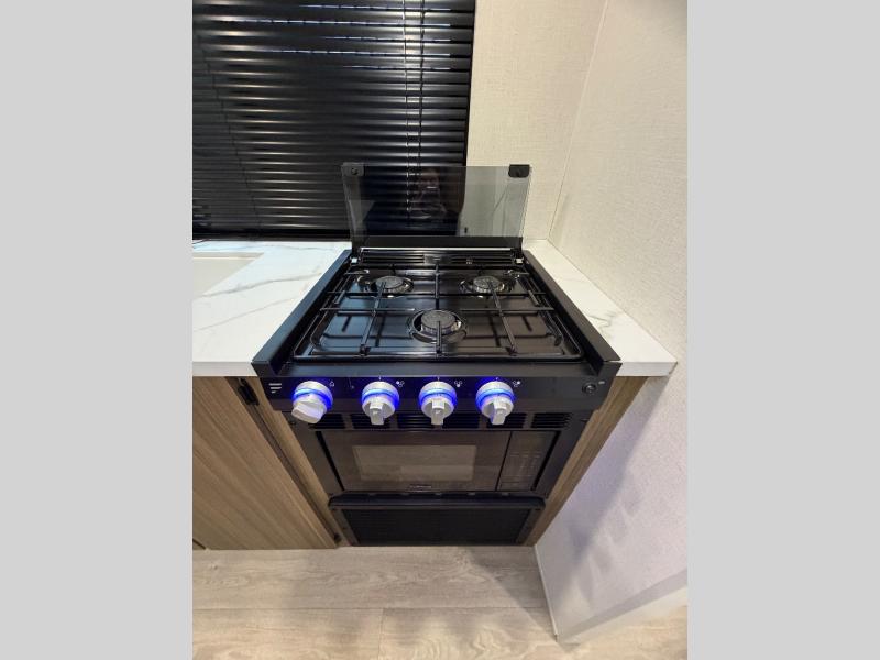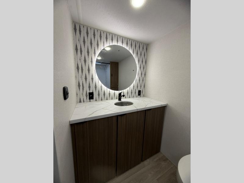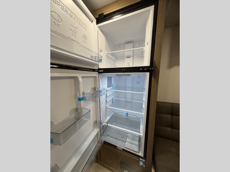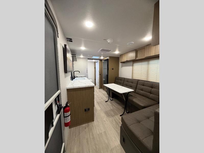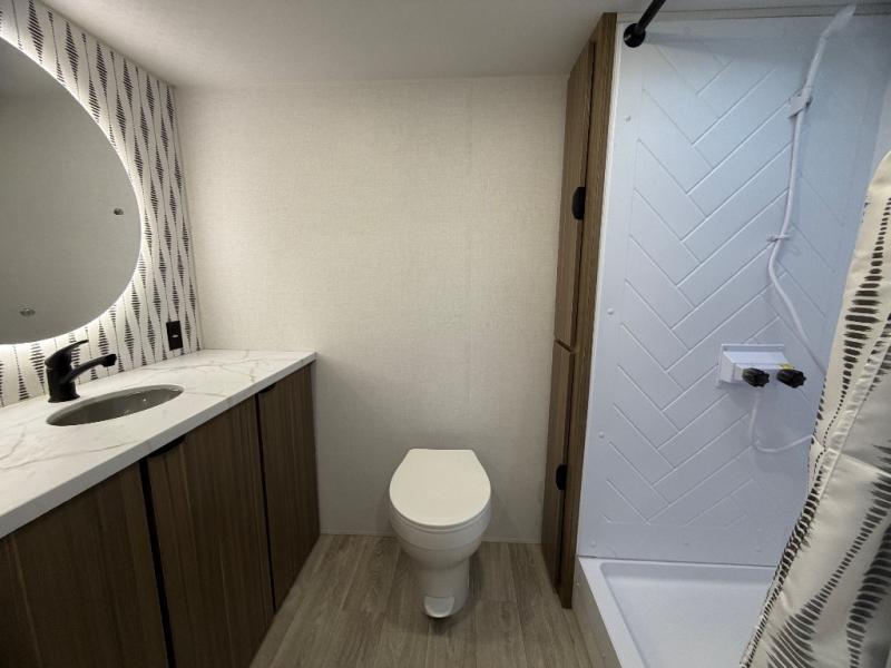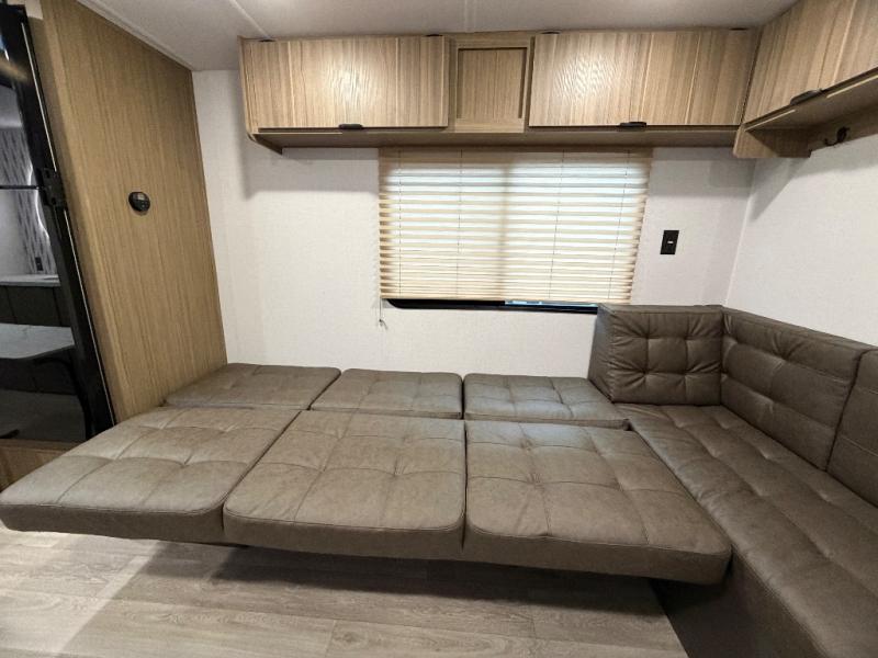 Camping is made easy in this travel trailer with at-home comforts! You'll have the front private bedroom with a king bed all to yourselves, and there are dual bedroom wardrobes to keep your space neat and clean. Any additional guests can sleep on the super lounge with a removable table. You will appreciate the full rear bath complete with a linen closet and dual bath sinks so you both can get ready for bed at once. And a full kitchen lets you whip up your best meals!