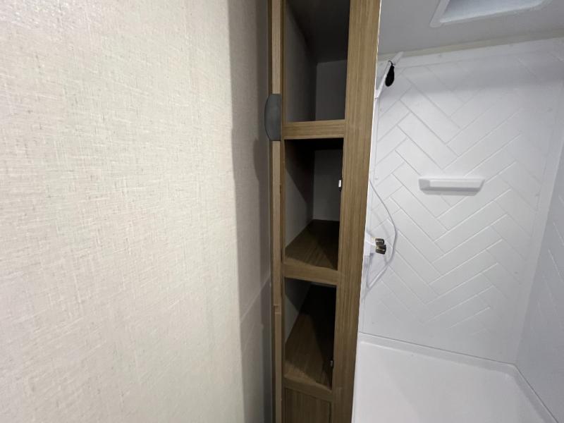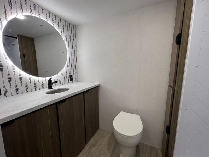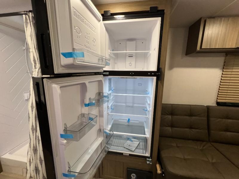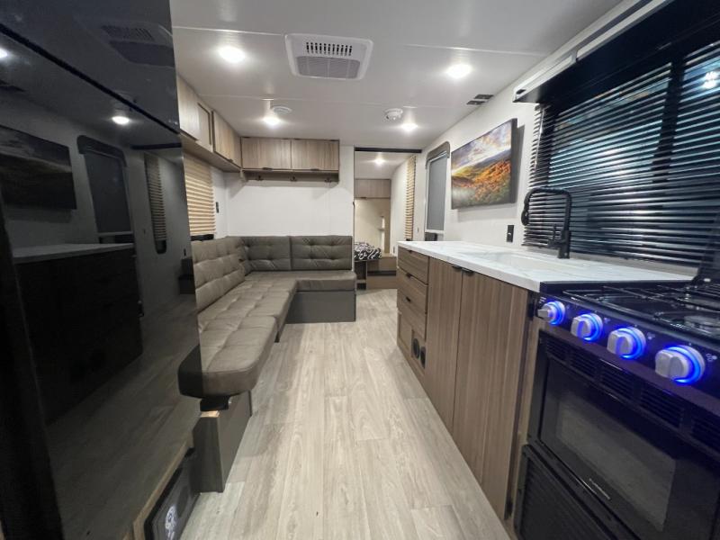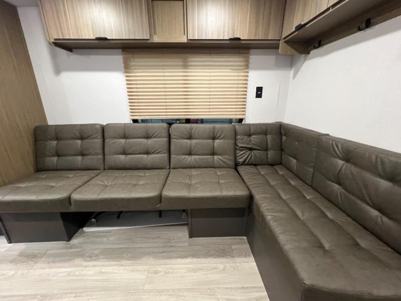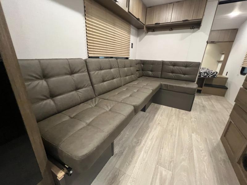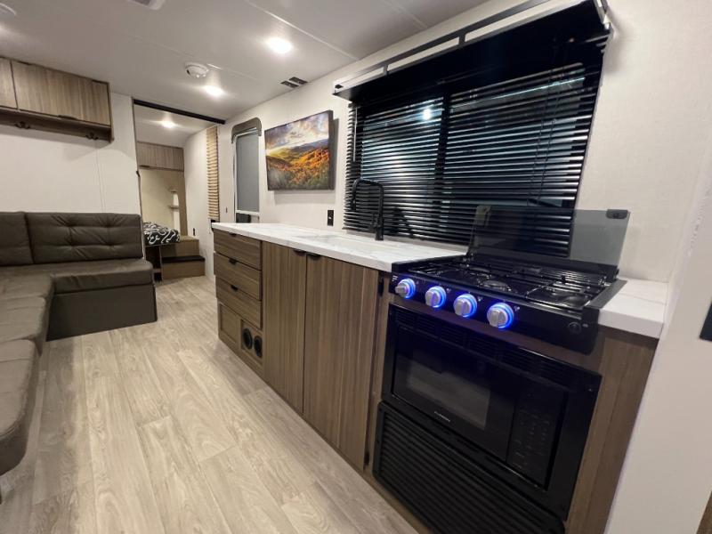 Camping is made easy in this travel trailer with at-home comforts! You'll have the front private bedroom with a king bed all to yourselves, and there are dual bedroom wardrobes to keep your space neat and clean. Any additional guests can sleep on the super lounge with a removable table. You will appreciate the full rear bath complete with a linen closet and dual bath sinks so you both can get ready for bed at once. And a full kitchen lets you whip up your best meals!