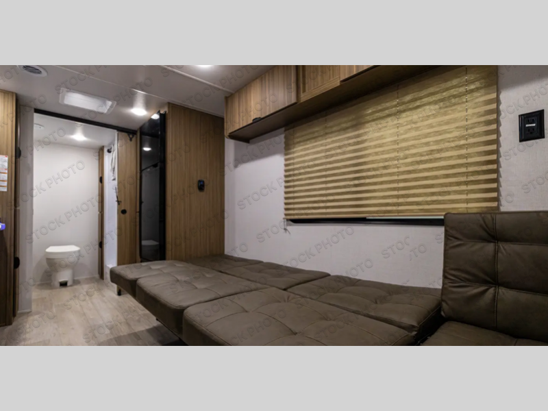 Camping is made easy in this travel trailer with at-home comforts! You'll have the front private bedroom with a king bed all to yourselves, and there are dual bedroom wardrobes to keep your space neat and clean. Any additional guests can sleep on the super lounge with a removable table. You will appreciate the full rear bath complete with a linen closet and dual bath sinks so you both can get ready for bed at once. And a full kitchen lets you whip up your best meals!