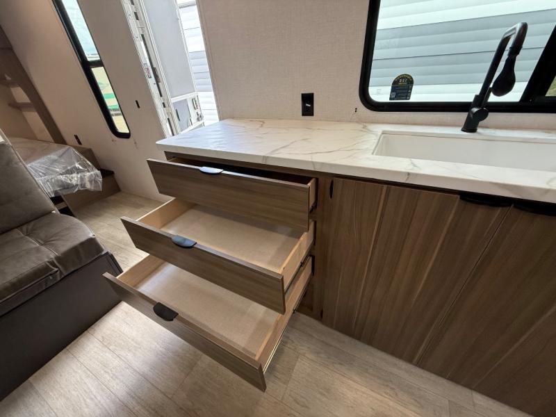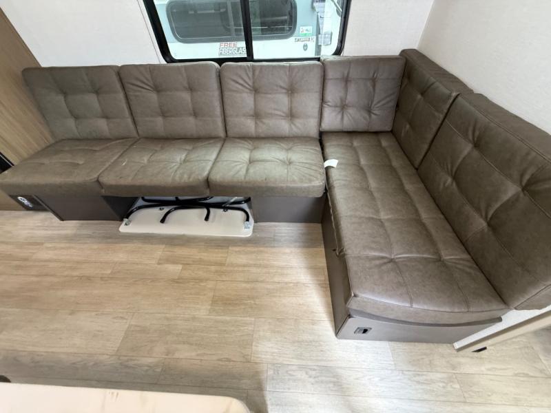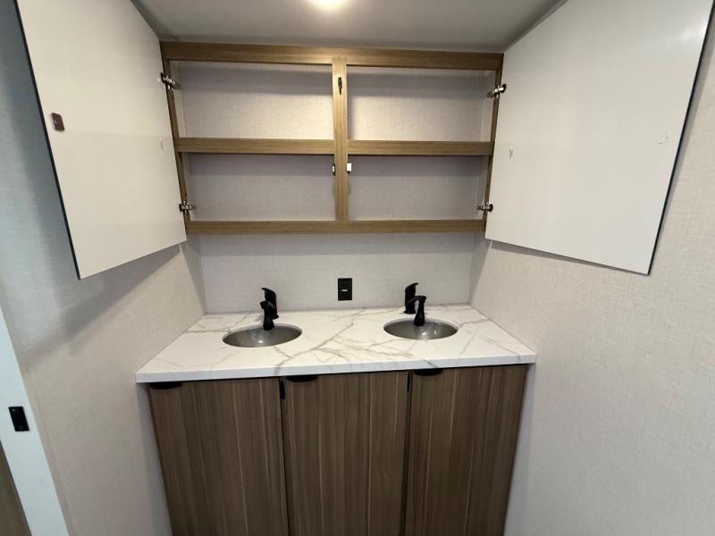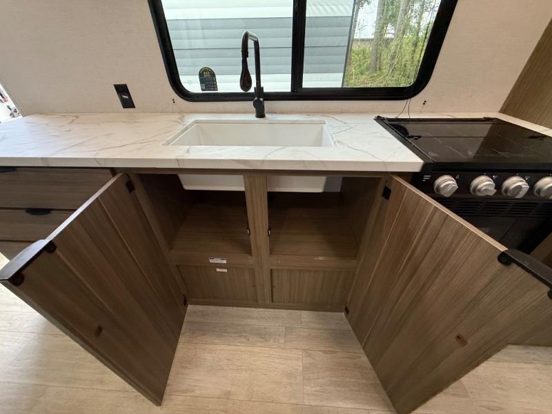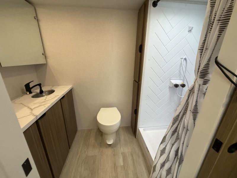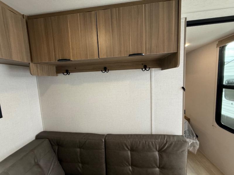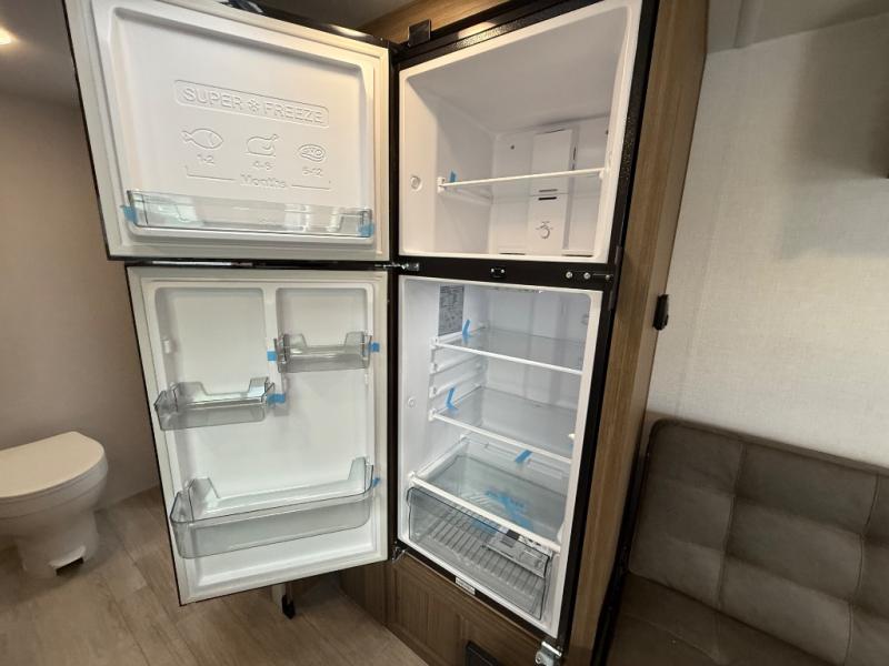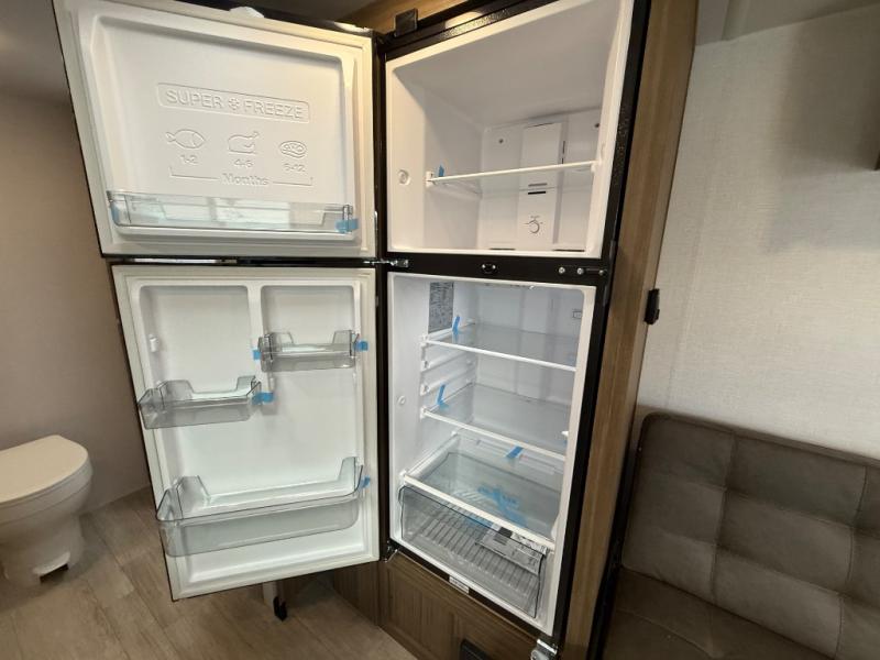 Camping is made easy in this travel trailer with at-home comforts! You'll have the front private bedroom with a king bed all to yourselves, and there are dual bedroom wardrobes to keep your space neat and clean. Any additional guests can sleep on the super lounge with a removable table. You will appreciate the full rear bath complete with a linen closet and dual bath sinks so you both can get ready for bed at once. And a full kitchen lets you whip up your best meals!