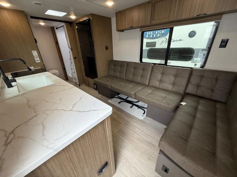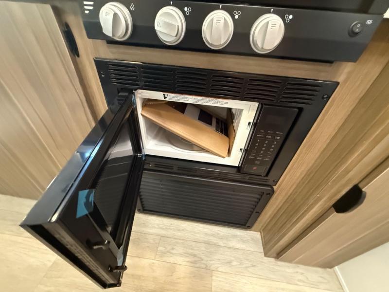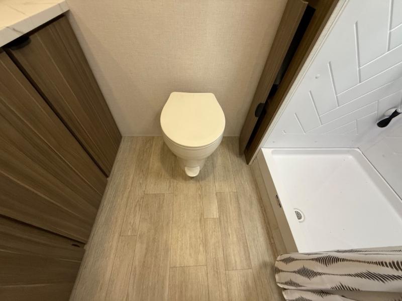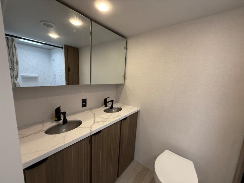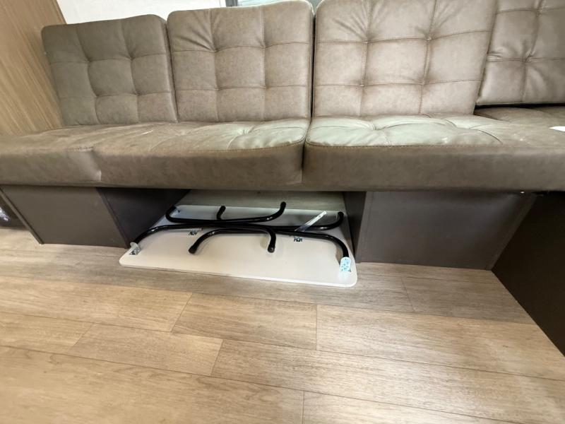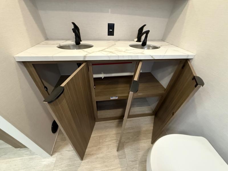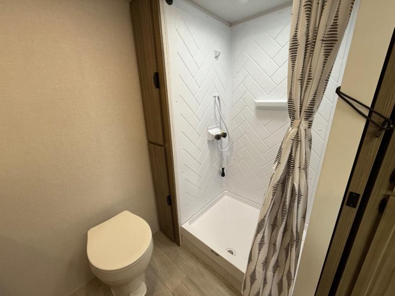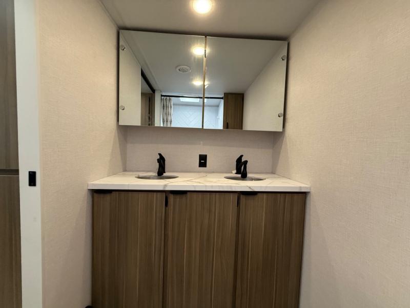 Camping is made easy in this travel trailer with at-home comforts! You'll have the front private bedroom with a king bed all to yourselves, and there are dual bedroom wardrobes to keep your space neat and clean. Any additional guests can sleep on the super lounge with a removable table. You will appreciate the full rear bath complete with a linen closet and dual bath sinks so you both can get ready for bed at once. And a full kitchen lets you whip up your best meals!