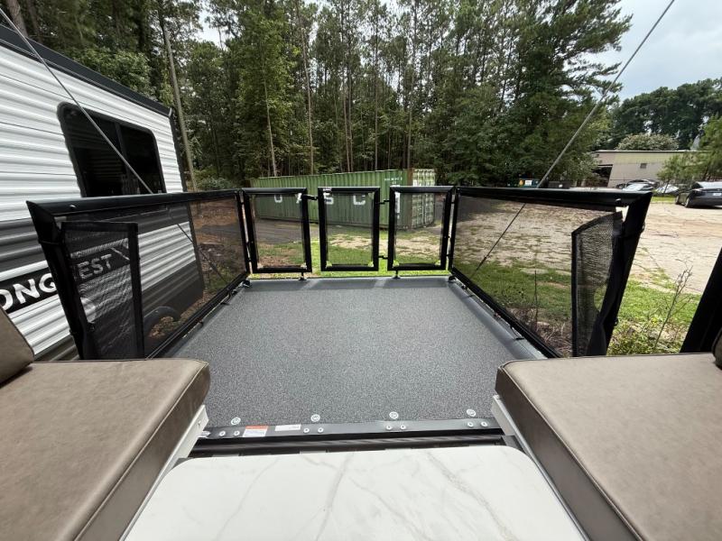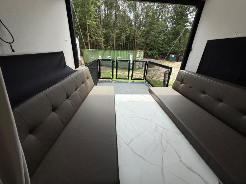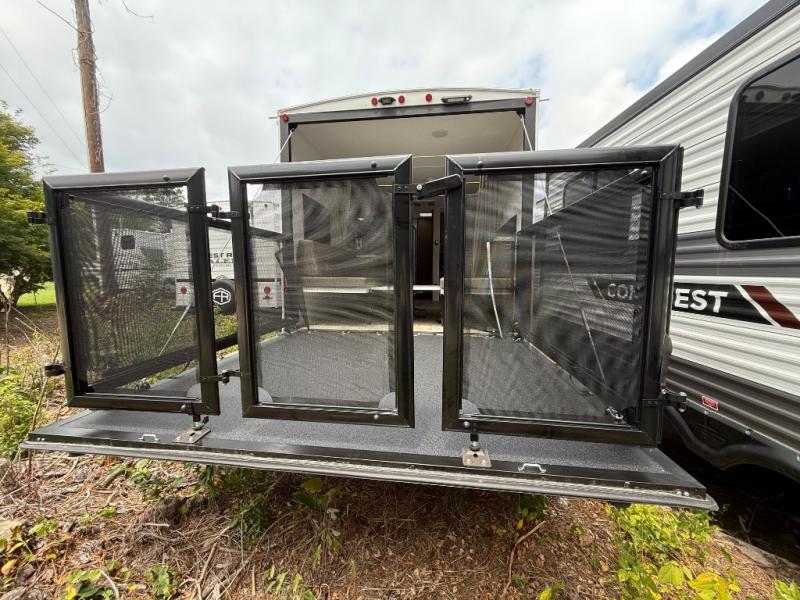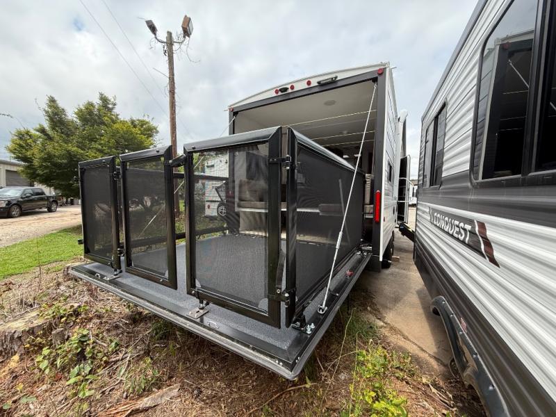 You will feel right at home in this toy hauler! The front private bedroom has a king bed to lay your head on at night with wardrobes on either side of it for your clothes. You even have access to the walk-through bathroom which has a neo-angled shower. Prepare your best home cooked meals with the 3-in-1 cooker with a convection oven and three burner cooktop, enjoy them at the opposing 30" x 72" sofa sleepers with a table in between, and store any leftovers in the 12V refrigerator. The 90" x 75", 3,000 lb. ramp door doubles as a party patio with a 1,500 lb. max weight capacity so you can invite your neighboring campers to join in on the fun!