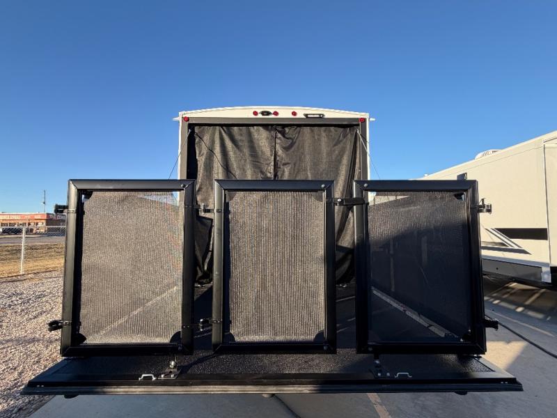 You will feel right at home in this toy hauler! The front private bedroom has a king bed to lay your head on at night with wardrobes on either side of it for your clothes. You even have access to the walk-through bathroom which has a neo-angled shower. Prepare your best home cooked meals with the 3-in-1 cooker with a convection oven and three burner cooktop, enjoy them at the opposing 30" x 72" sofa sleepers with a table in between, and store any leftovers in the 12V refrigerator. The 90" x 75", 3,000 lb. ramp door doubles as a party patio with a 1,500 lb. max weight capacity so you can invite your neighboring campers to join in on the fun!