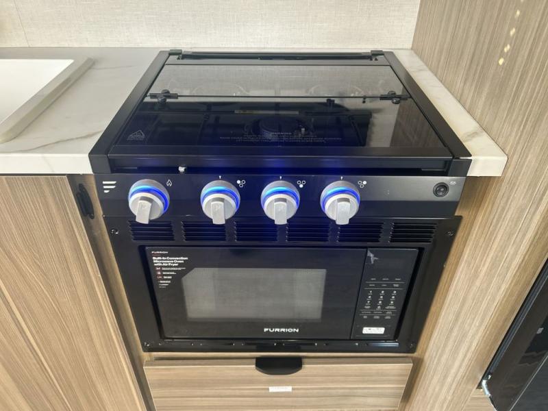 You will feel right at home in this toy hauler! The front private bedroom has a custom king bed to lay your head on at night with wardrobes on either side of it for your clothes. You even have access to the walk-through bathroom which has a neo-angled shower. Prepare your best home cooked meals with the 3-in-1 cooker with a convection oven and three burner cooktop, enjoy them at the opposing 30" x 72" sofa sleepers with a table in between, and store any leftovers in the 12V refrigerator. The 90" x 75", ramp door doubles as a party patio with a 1,500 lb. max weight capacity so you can invite your neighboring campers to join in on the fun!