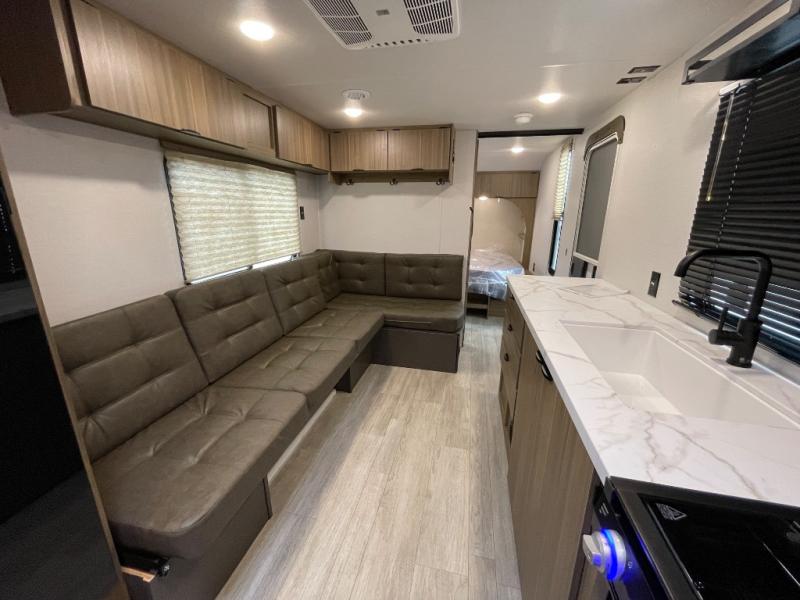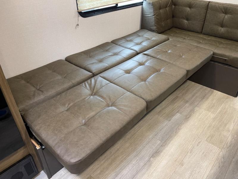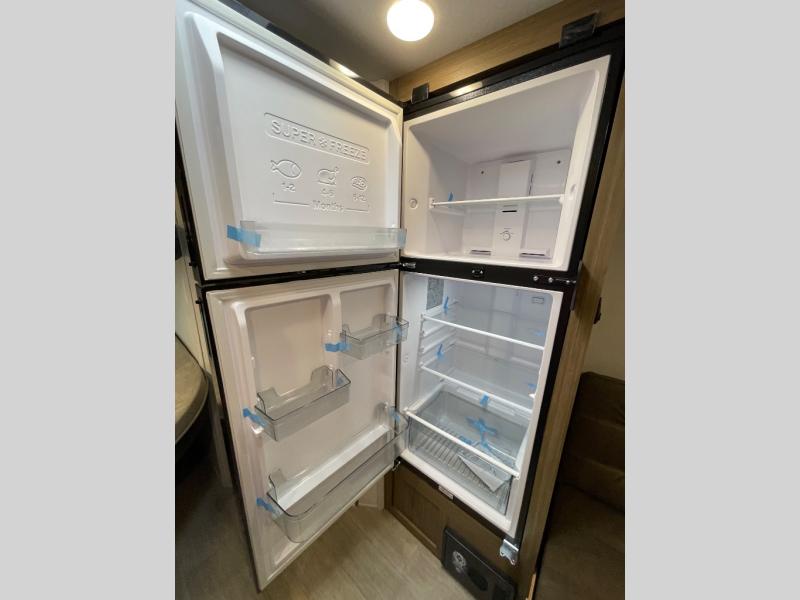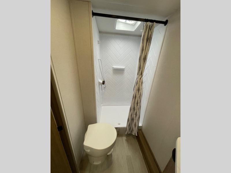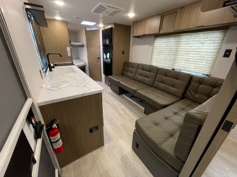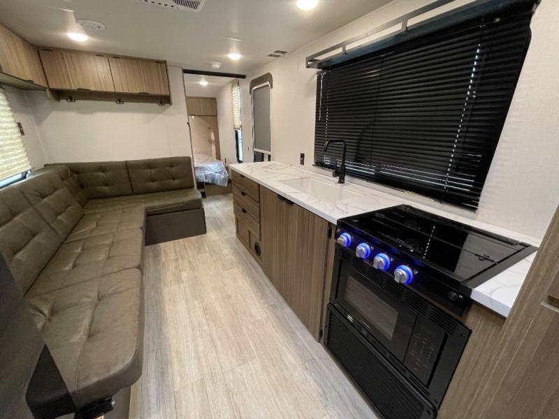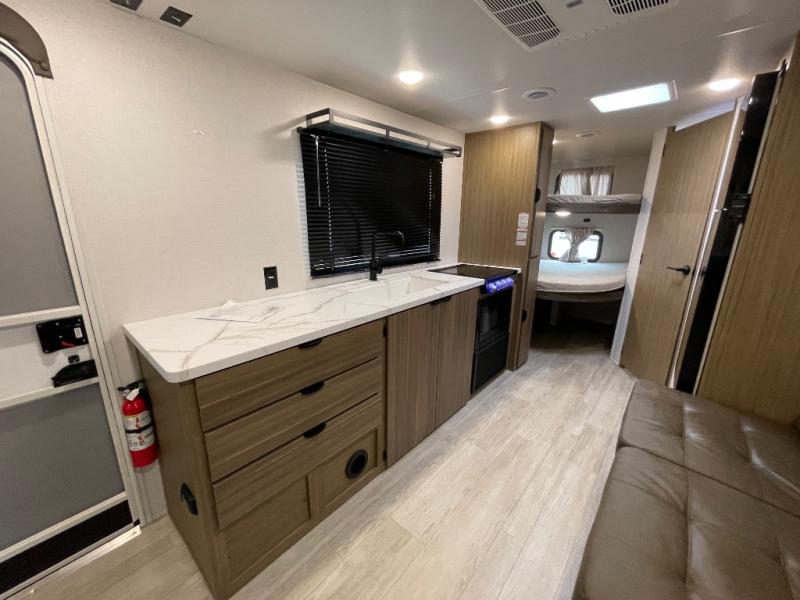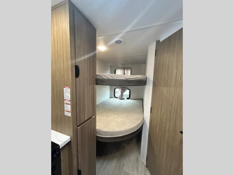 Camping is made easy in this travel trailer with more sleeping space and lots of comforts! The kids or your guests will enjoy the double-size bunks in the back, along with the full bath close by for easy nighttime use. You'll have the front private bedroom with a king bed all to yourselves, and there are dual bedroom wardrobes to keep your space neat and clean. Everyone can meet in the combined kitchen and living room to relax on the super U-lounge with a removable table while the chef of your group makes breakfast on the two burner cooktop. There is also a microwave oven for quick meals, plus a pantry and refrigerator for food storage!