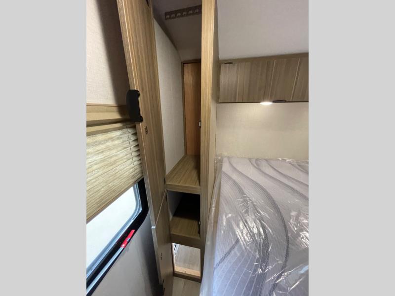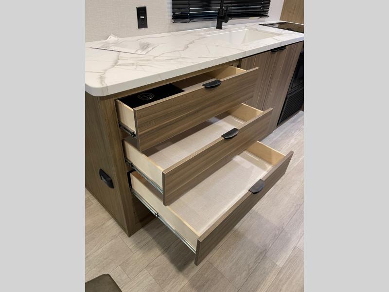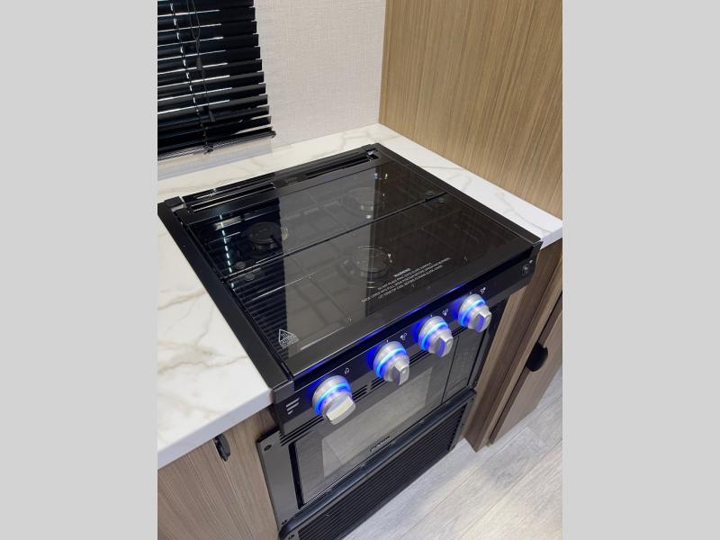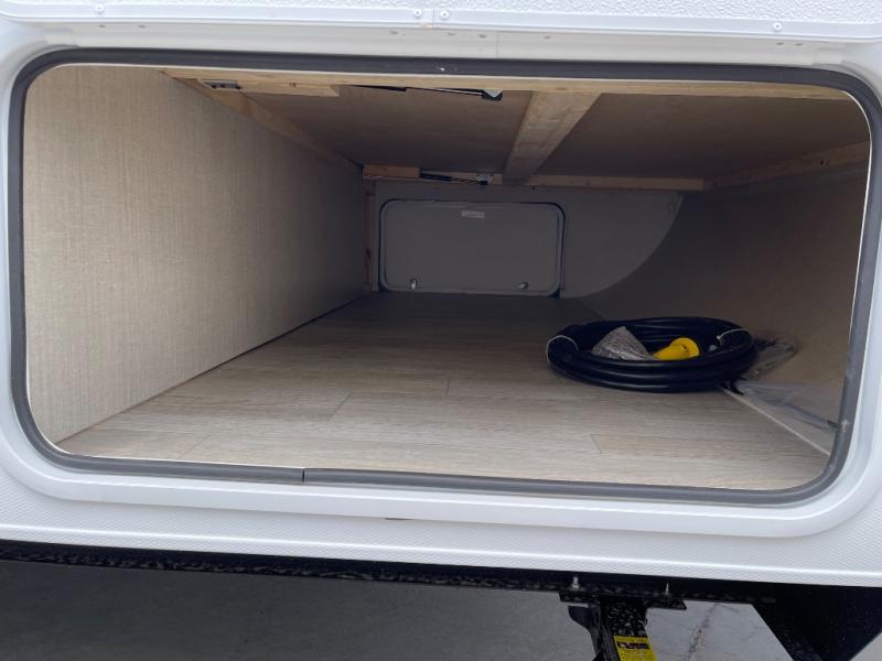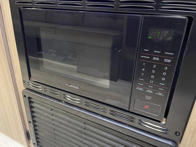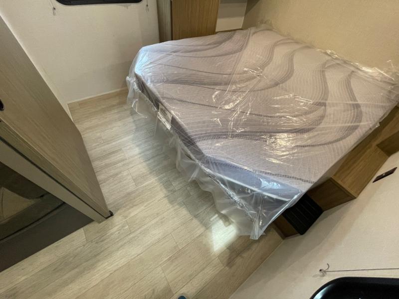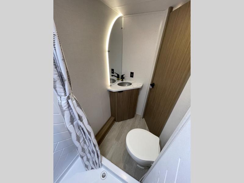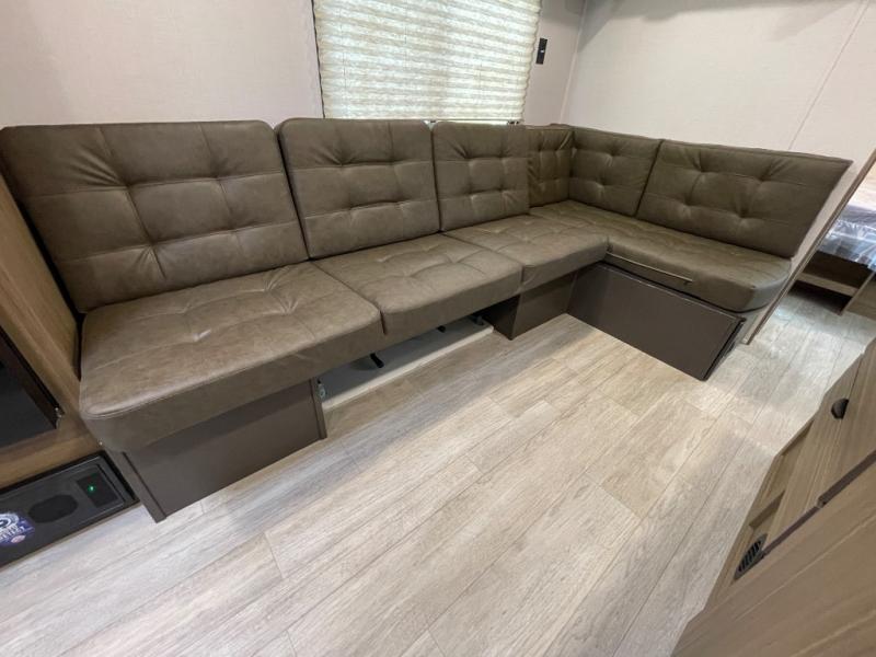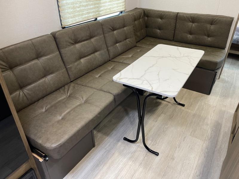 Camping is made easy in this travel trailer with more sleeping space and lots of comforts! The kids or your guests will enjoy the double-size bunks in the back, along with the full bath close by for easy nighttime use. You'll have the front private bedroom with a king bed all to yourselves, and there are dual bedroom wardrobes to keep your space neat and clean. Everyone can meet in the combined kitchen and living room to relax on the super U-lounge with a removable table while the chef of your group makes breakfast on the two burner cooktop. There is also a microwave oven for quick meals, plus a pantry and refrigerator for food storage!