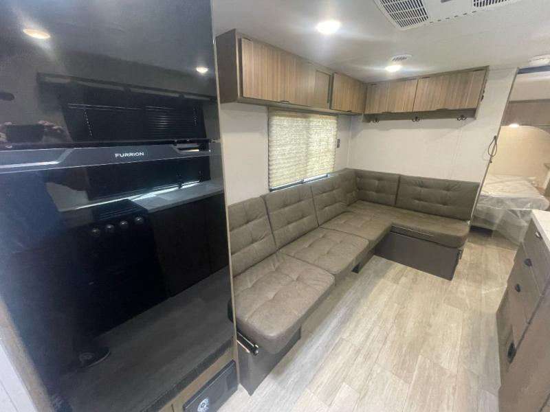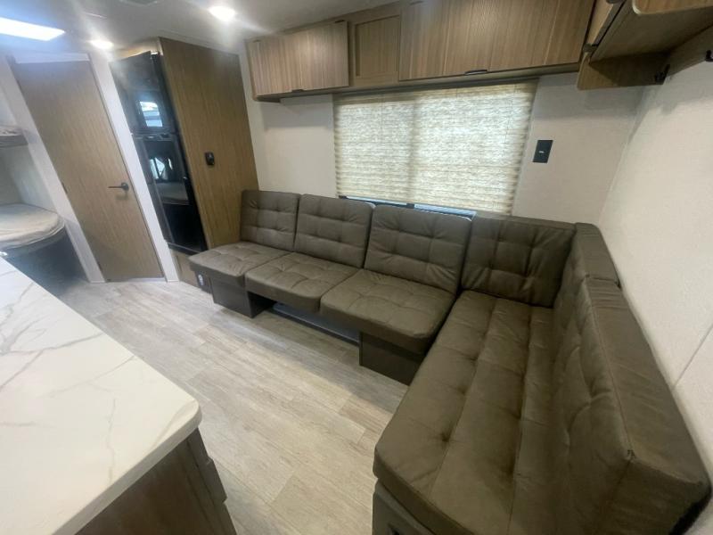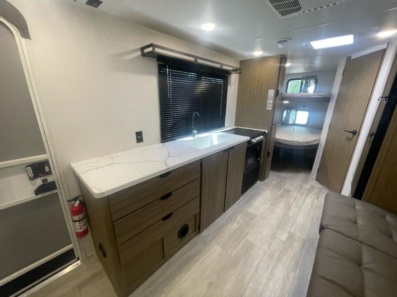 Camping is made easy in this travel trailer with more sleeping space and lots of comforts! The kids or your guests will enjoy the double-size bunks in the back, along with the full bath close by for easy nighttime use. You'll have the front private bedroom with a king bed all to yourselves, and there are dual bedroom wardrobes to keep your space neat and clean. Everyone can meet in the combined kitchen and living room to relax on the super U-lounge with a removable table while the chef of your group makes breakfast on the two burner cooktop. There is also a microwave oven for quick meals, plus a pantry and refrigerator for food storage!