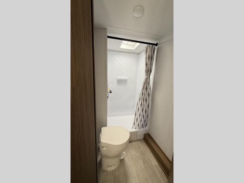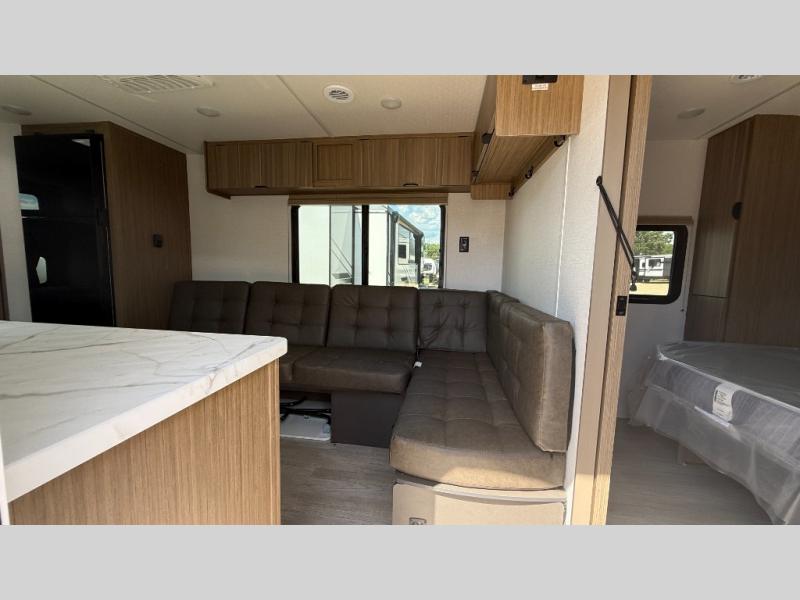 Camping is made easy in this travel trailer with more sleeping space and lots of comforts! The kids or your guests will enjoy the double-size bunks in the back, along with the full bath close by for easy nighttime use. You'll have the front private bedroom with a king bed all to yourselves, and there are dual bedroom wardrobes to keep your space neat and clean. Everyone can meet in the combined kitchen and living room to relax on the super U-lounge with a removable table while the chef of your group makes breakfast on the two burner cooktop. There is also a microwave oven for quick meals, plus a pantry and large under counter refrigerator for food storage!