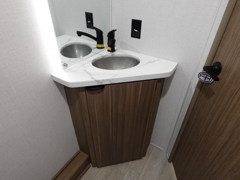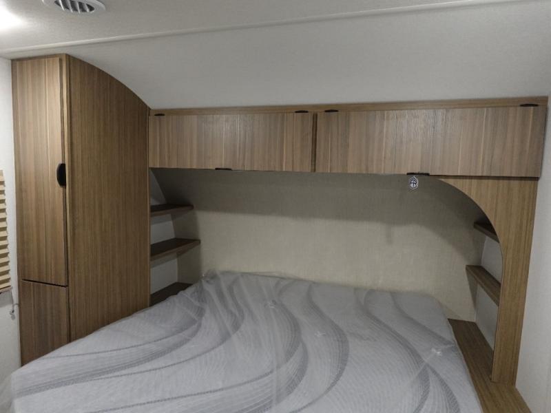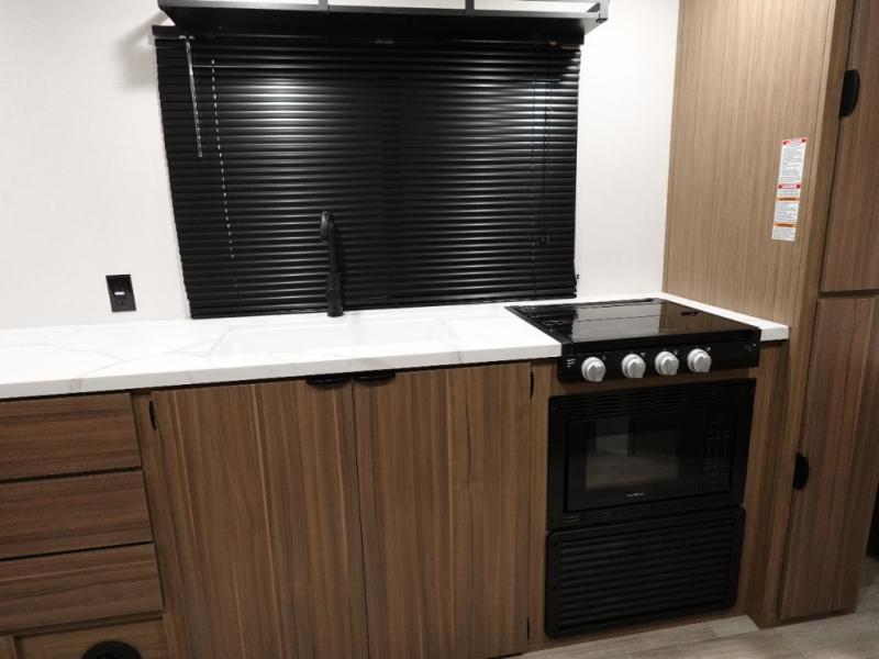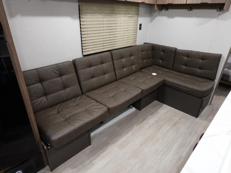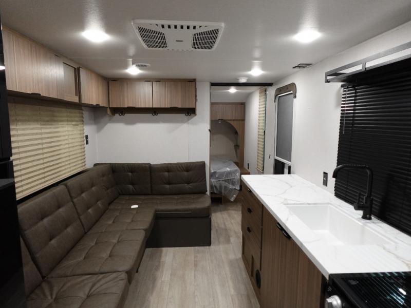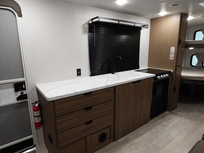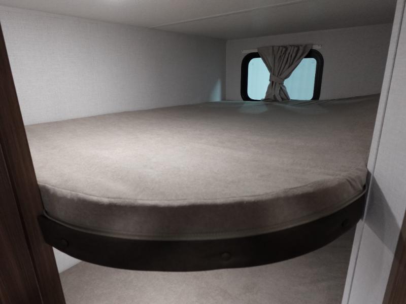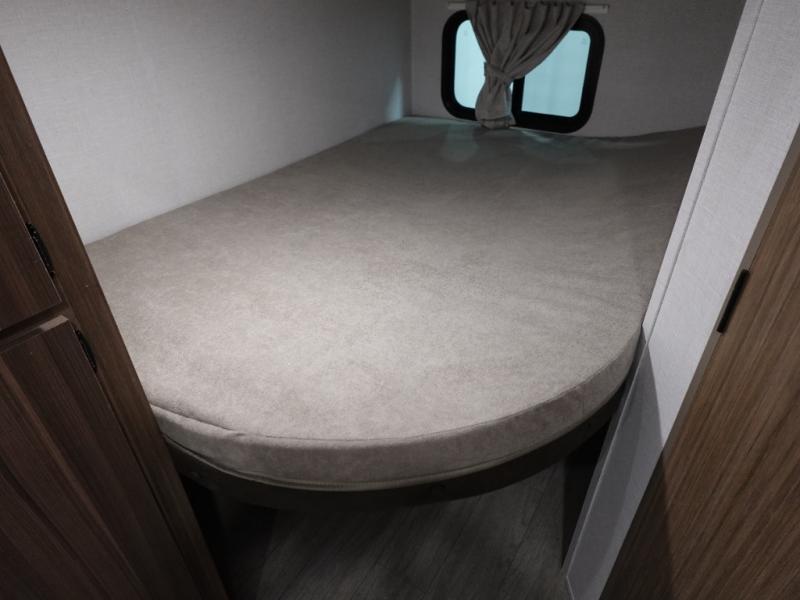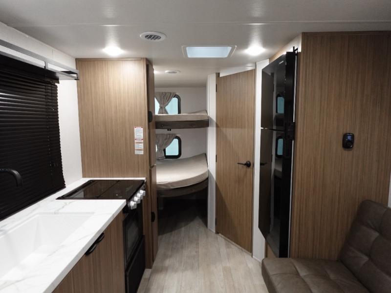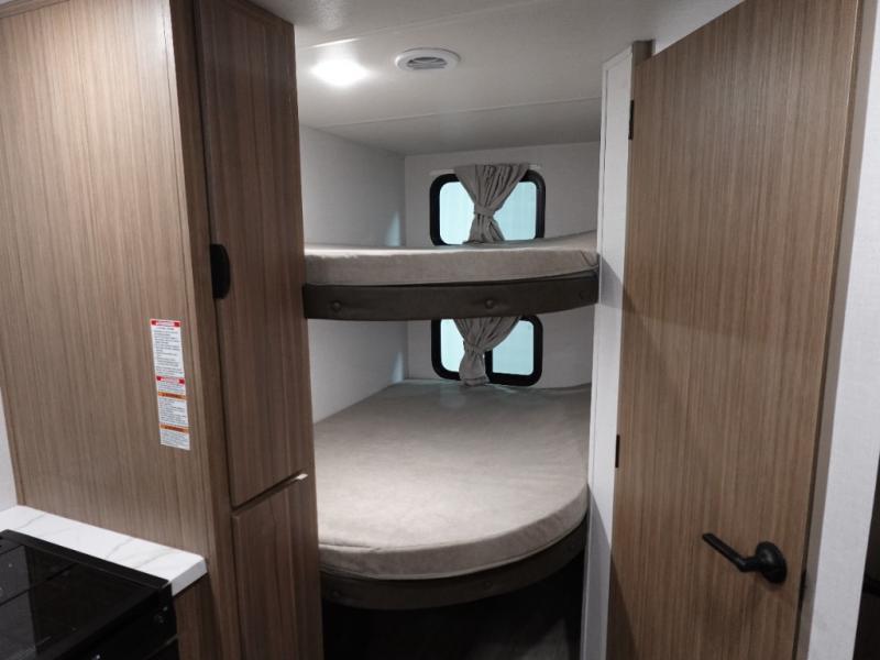 Camping is made easy in this travel trailer with more sleeping space and lots of comforts! The kids or your guests will enjoy the double-size bunks in the back, along with the full bath close by for easy nighttime use. You'll have the front private bedroom with a king bed all to yourselves, and there are dual bedroom wardrobes to keep your space neat and clean. Everyone can meet in the combined kitchen and living room to relax on the super U-lounge with a removable table while the chef of your group makes breakfast on the two burner cooktop. There is also a microwave oven for quick meals, plus a pantry and refrigerator for food storage!