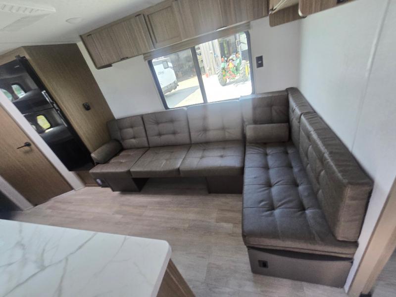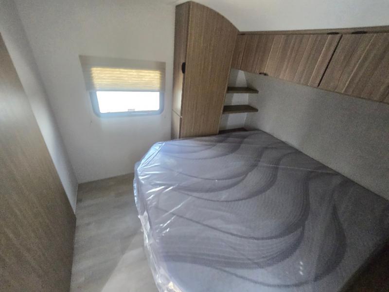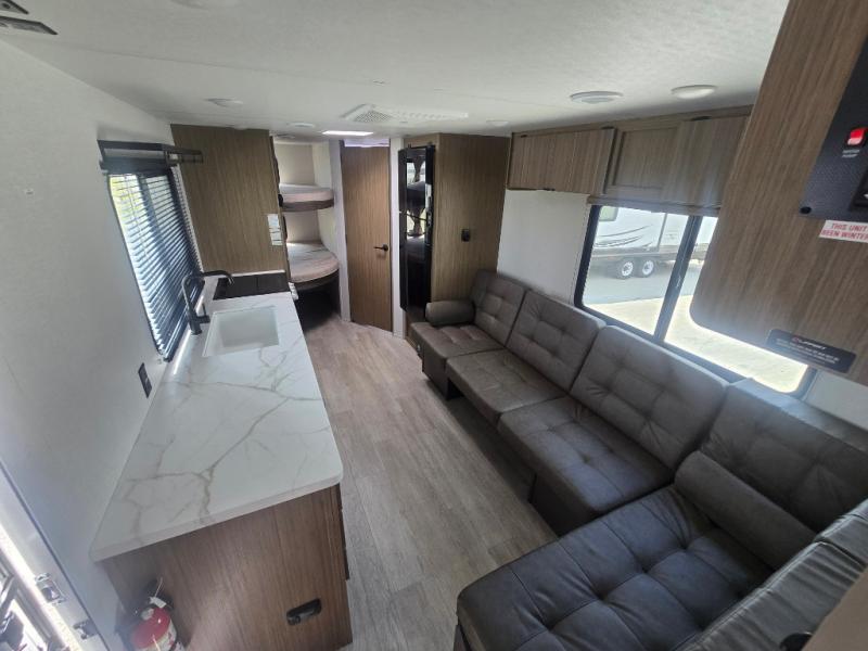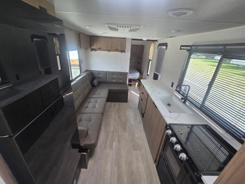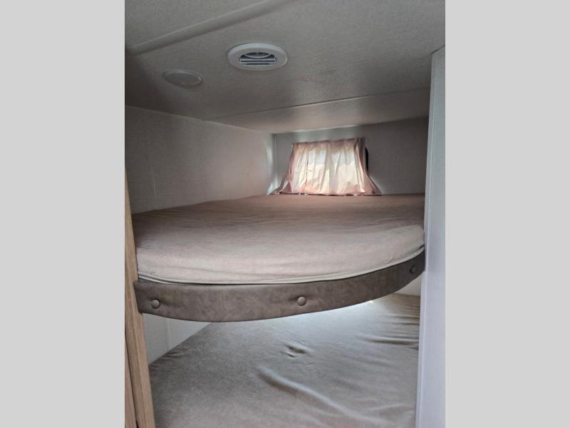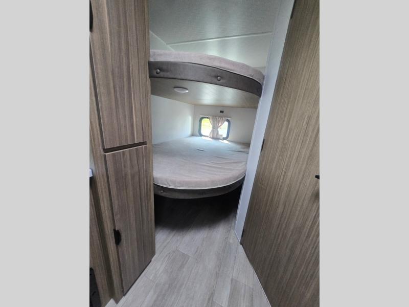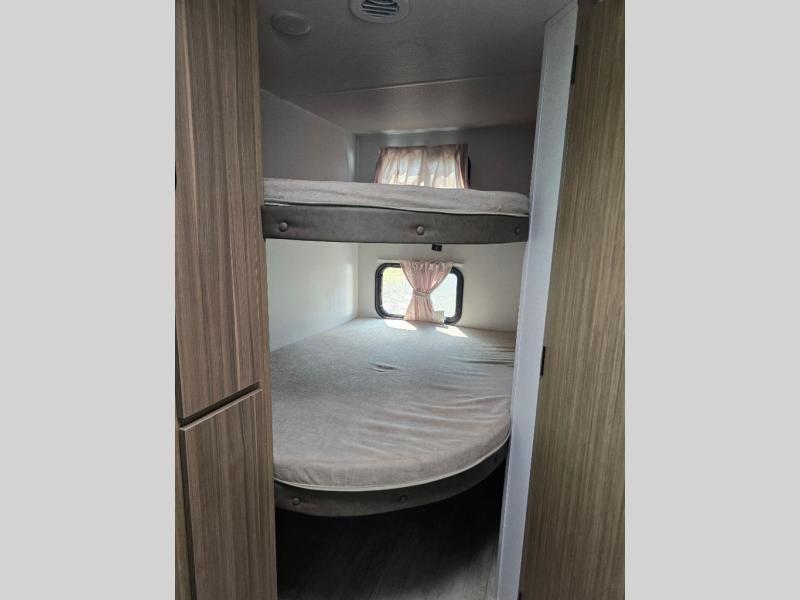 Camping is made easy in this travel trailer with more sleeping space and lots of comforts! The kids or your guests will enjoy the double-size bunks in the back, along with the full bath close by for easy nighttime use. You'll have the front private bedroom with a king bed all to yourselves, and there are dual bedroom wardrobes to keep your space neat and clean. Everyone can meet in the combined kitchen and living room to relax on the super U-lounge with a removable table while the chef of your group makes breakfast on the two burner cooktop. There is also a microwave oven for quick meals, plus a pantry and large under counter refrigerator for food storage!