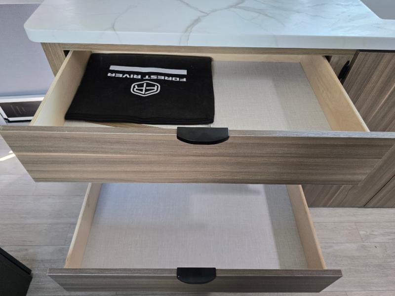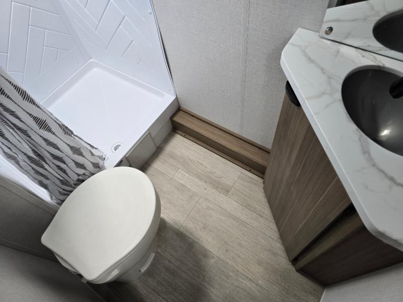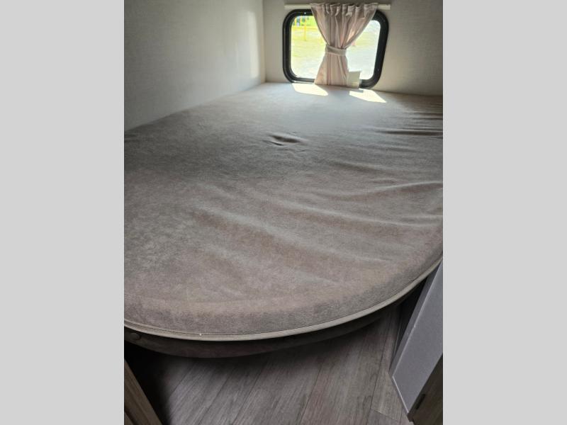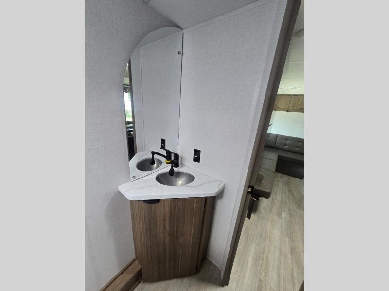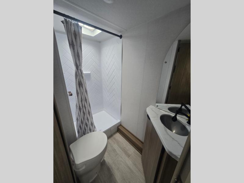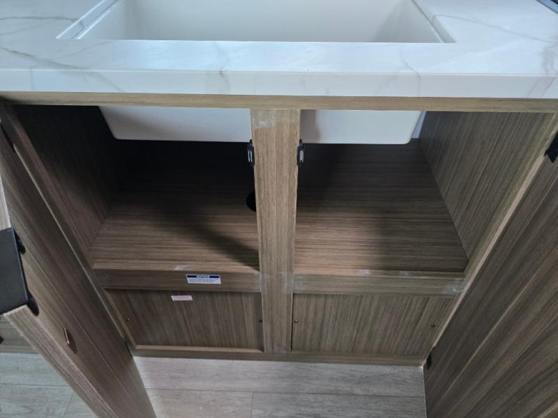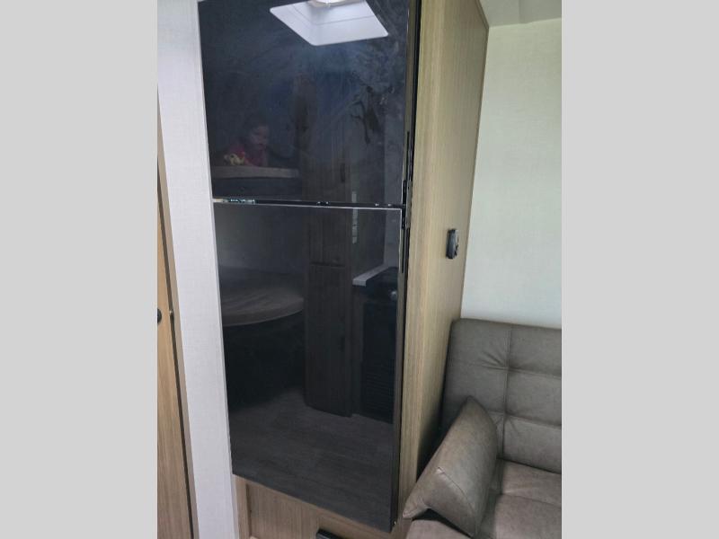 Camping is made easy in this travel trailer with more sleeping space and lots of comforts! The kids or your guests will enjoy the double-size bunks in the back, along with the full bath close by for easy nighttime use. You'll have the front private bedroom with a king bed all to yourselves, and there are dual bedroom wardrobes to keep your space neat and clean. Everyone can meet in the combined kitchen and living room to relax on the super U-lounge with a removable table while the chef of your group makes breakfast on the two burner cooktop. There is also a microwave oven for quick meals, plus a pantry and large under counter refrigerator for food storage!