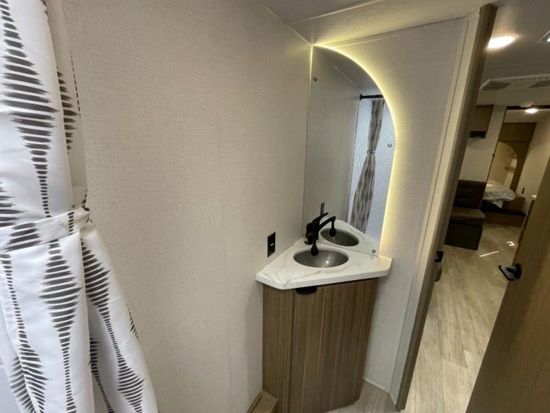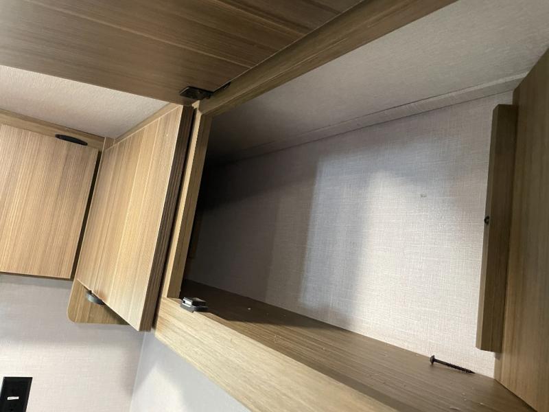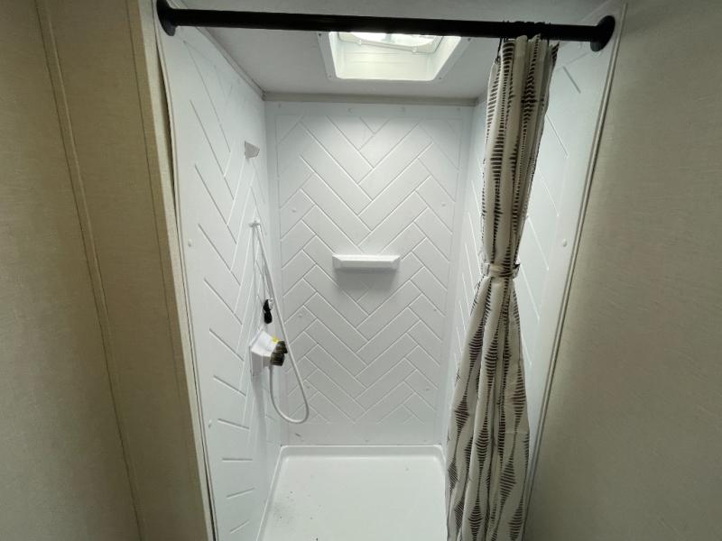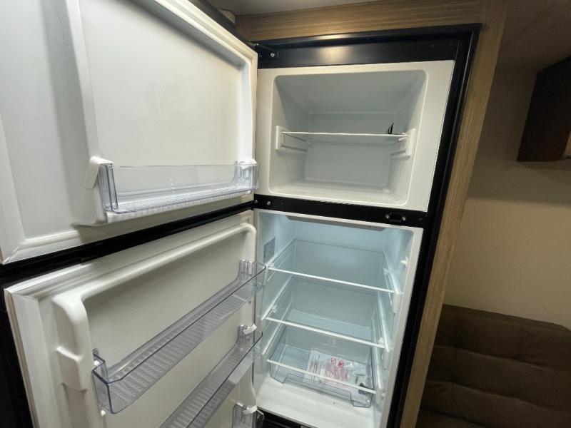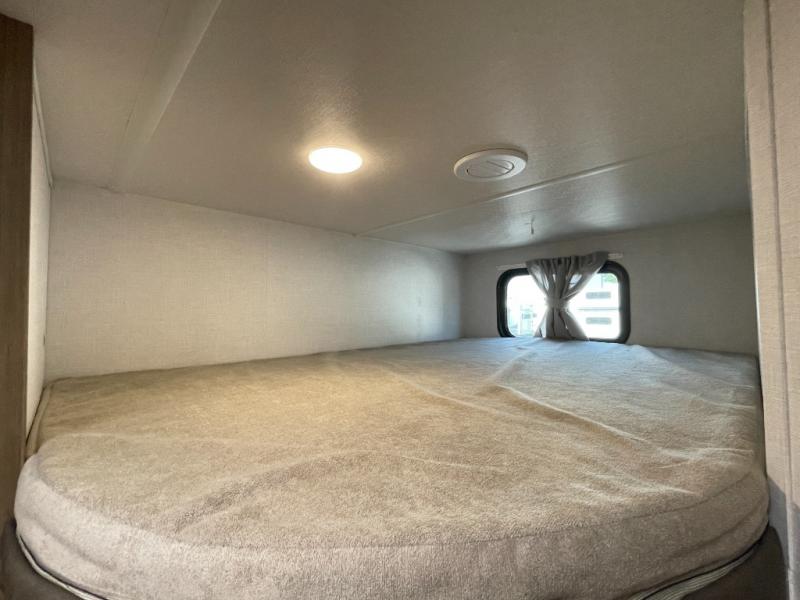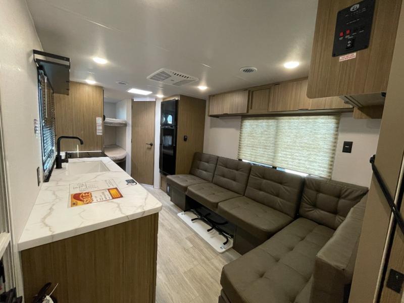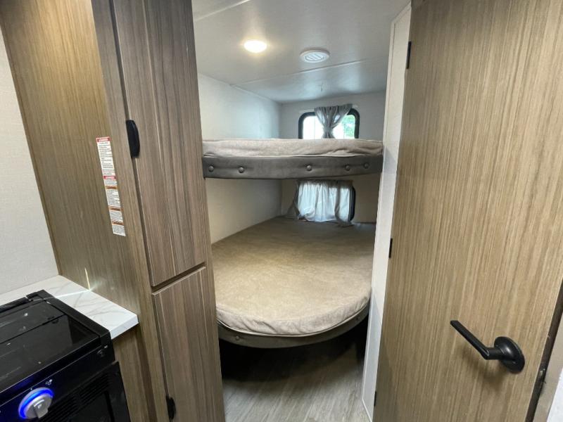 Camping is made easy in this travel trailer with more sleeping space and lots of comforts! The kids or your guests will enjoy the double-size bunks in the back, along with the full bath close by for easy nighttime use. You'll have the front private bedroom with a custom king bed all to yourselves, and there are dual bedroom wardrobes to keep your space neat and clean. Everyone can meet in the combined kitchen and living room to relax on the super U-lounge with a removable table while the chef of your group makes breakfast on the two-burner cooktop. There is also a microwave oven for quick meals, plus a pantry and refrigerator for food storage!