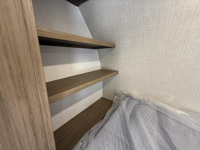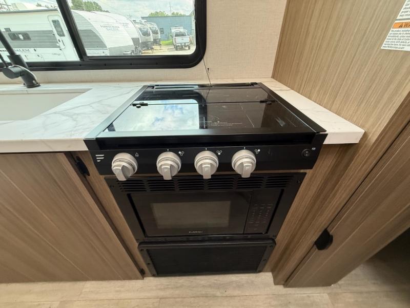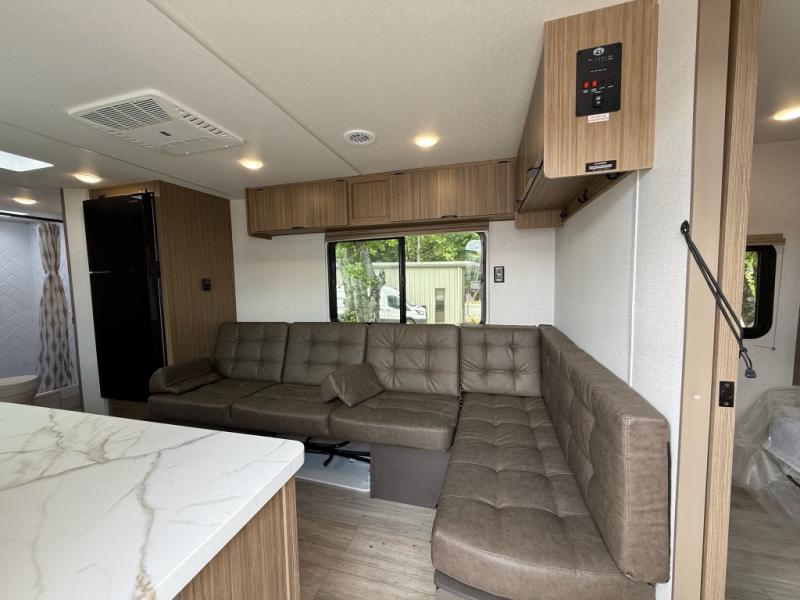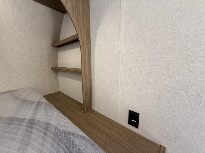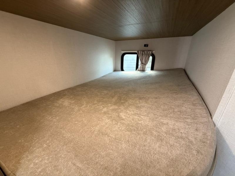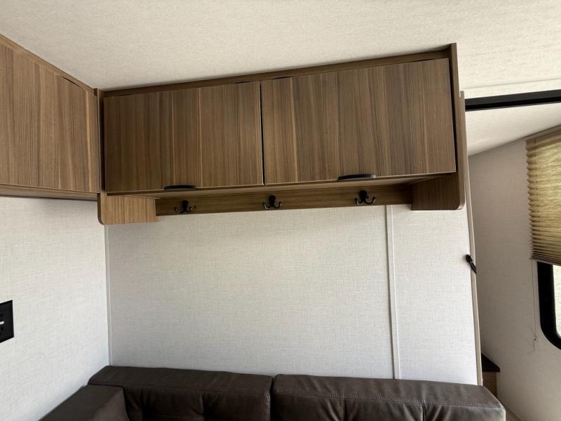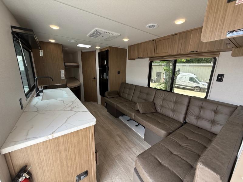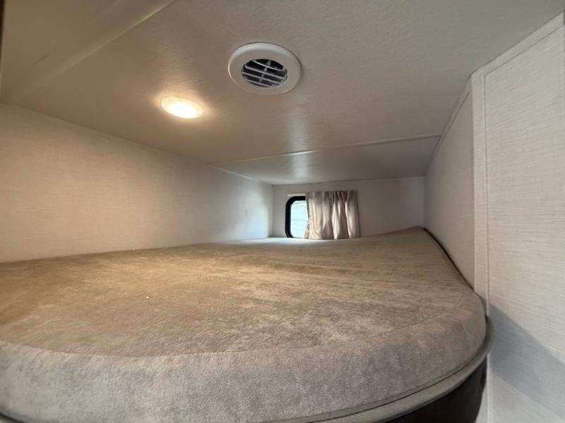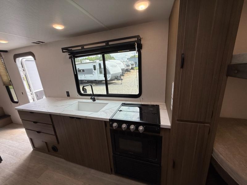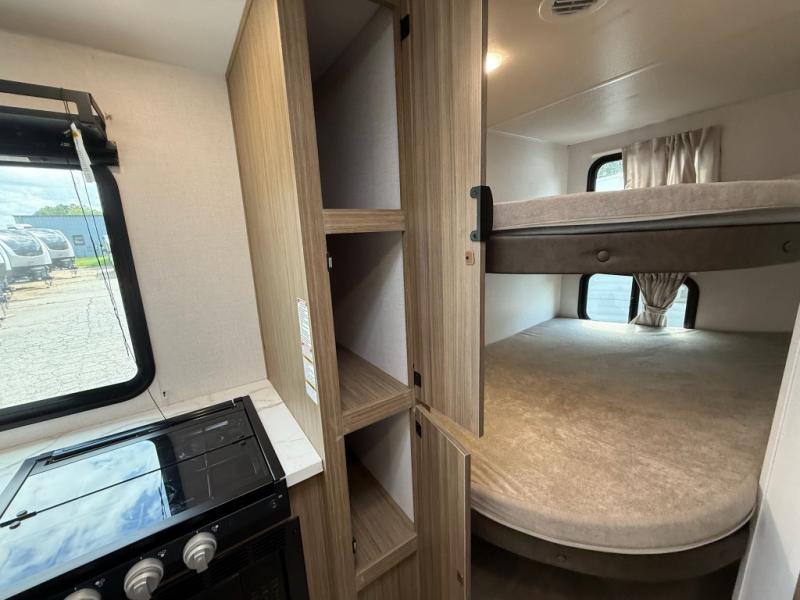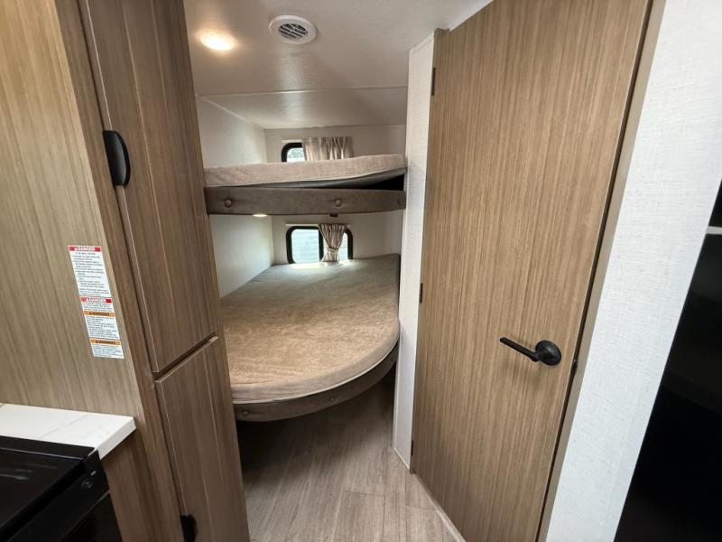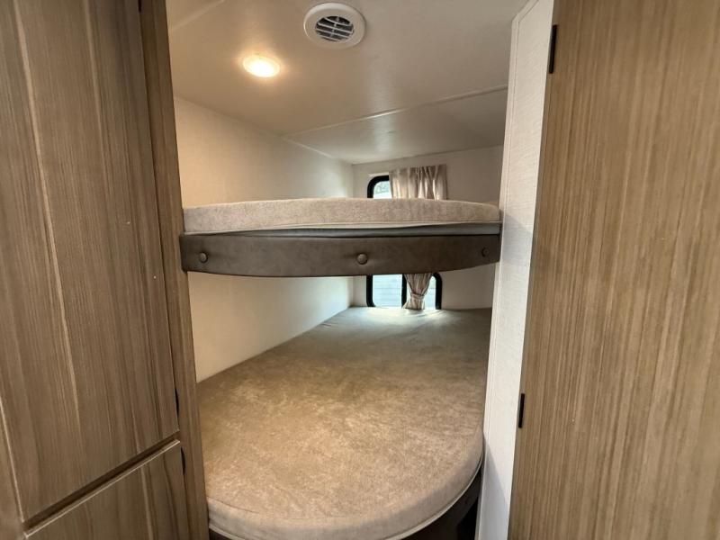 Camping is made easy in this travel trailer with more sleeping space and lots of comforts! The kids or your guests will enjoy the double-size bunks in the back, along with the full bath close by for easy nighttime use. You'll have the front private bedroom with a king bed all to yourselves, and there are dual bedroom wardrobes to keep your space neat and clean. Everyone can meet in the combined kitchen and living room to relax on the super U-lounge with a removable table while the chef of your group makes breakfast on the two burner cooktop. There is also a microwave oven for quick meals, plus a pantry and refrigerator for food storage!