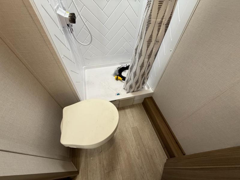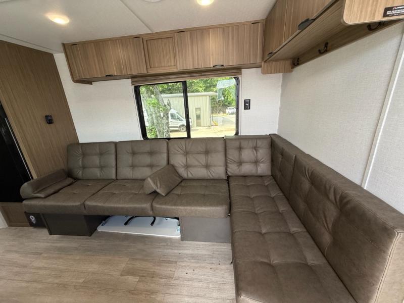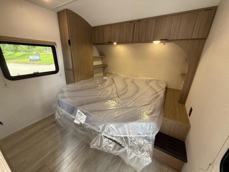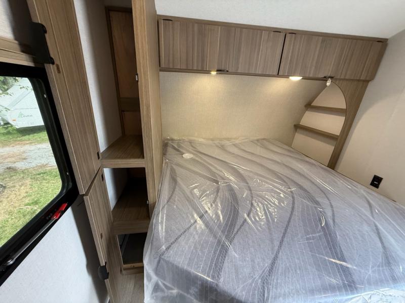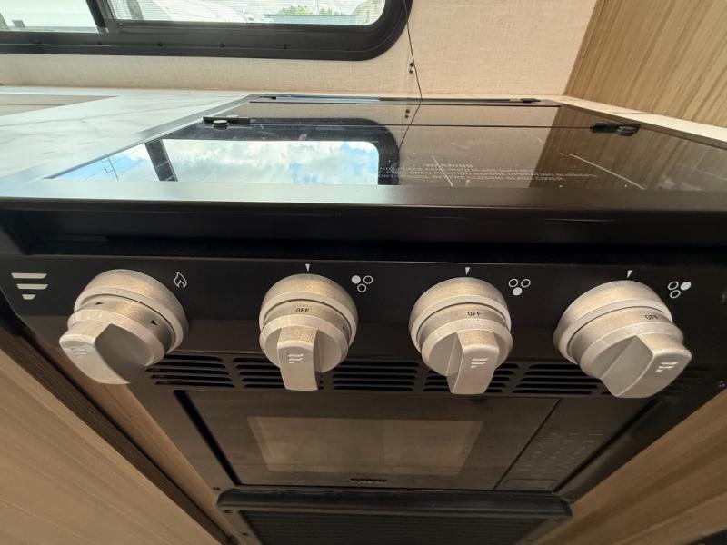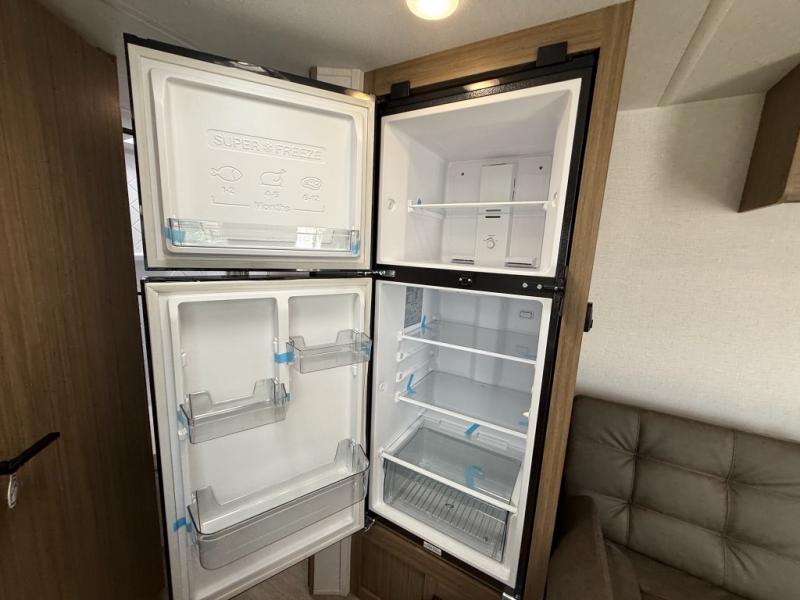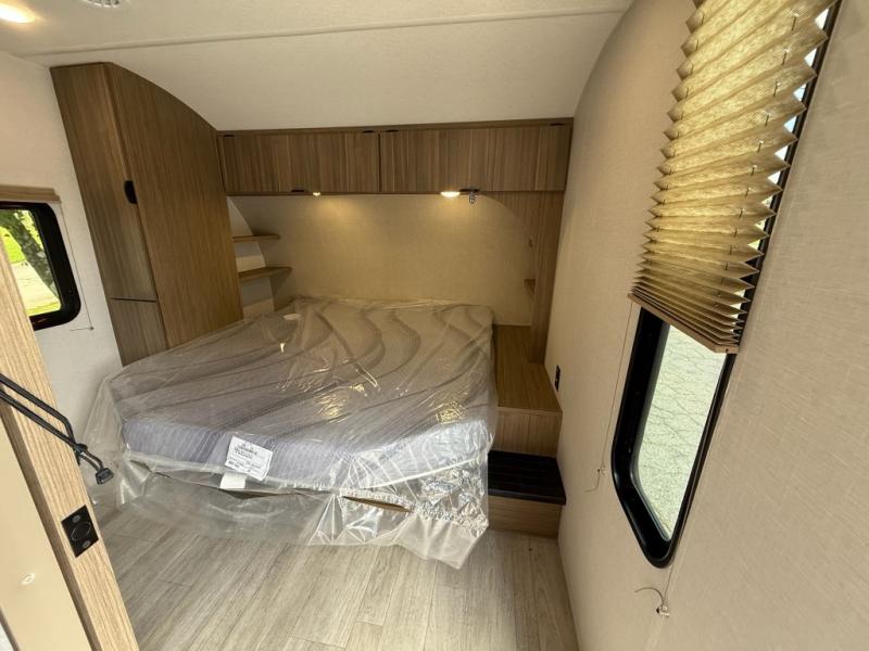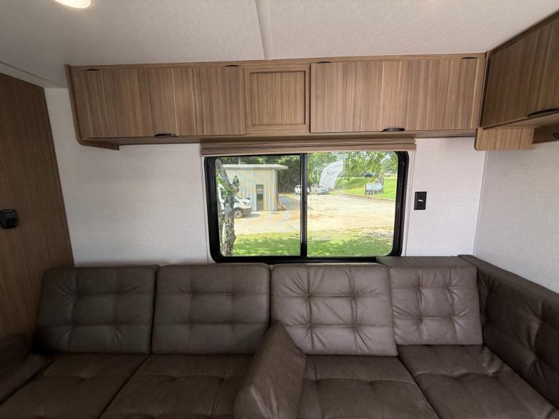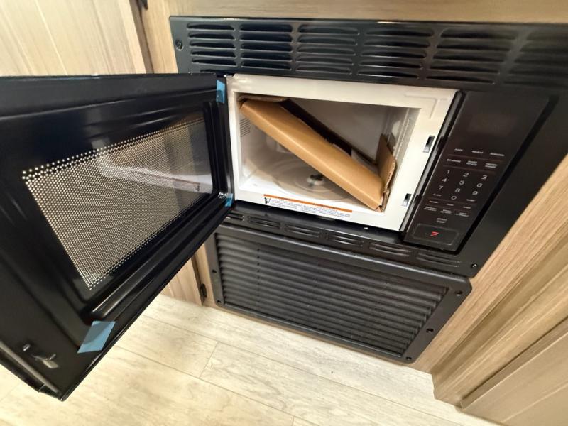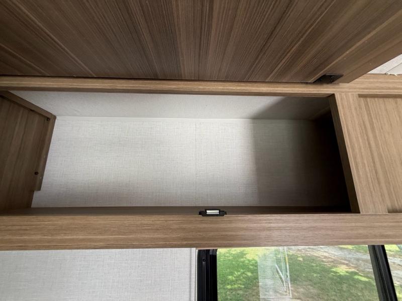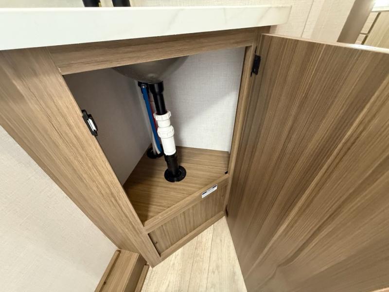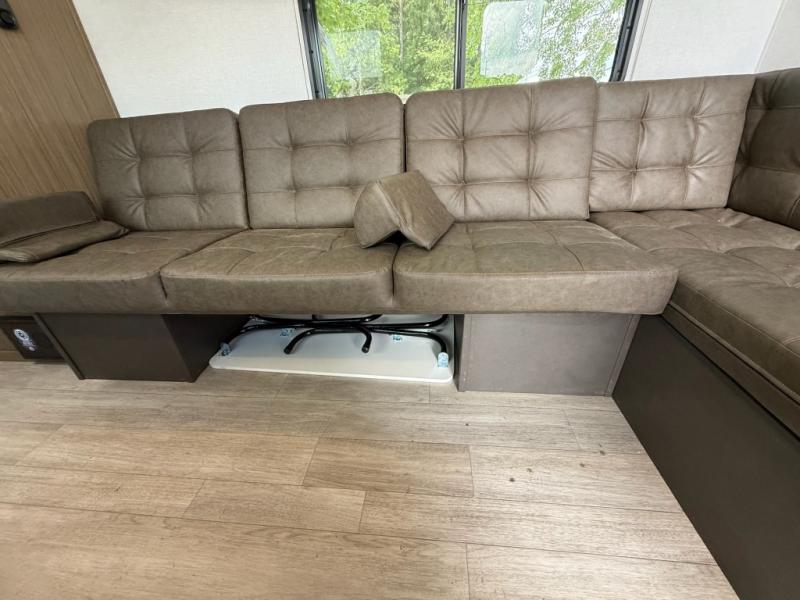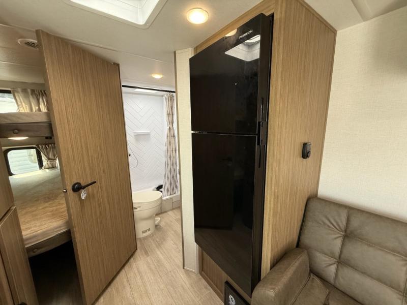 Camping is made easy in this travel trailer with more sleeping space and lots of comforts! The kids or your guests will enjoy the double-size bunks in the back, along with the full bath close by for easy nighttime use. You'll have the front private bedroom with a king bed all to yourselves, and there are dual bedroom wardrobes to keep your space neat and clean. Everyone can meet in the combined kitchen and living room to relax on the super U-lounge with a removable table while the chef of your group makes breakfast on the two burner cooktop. There is also a microwave oven for quick meals, plus a pantry and refrigerator for food storage!