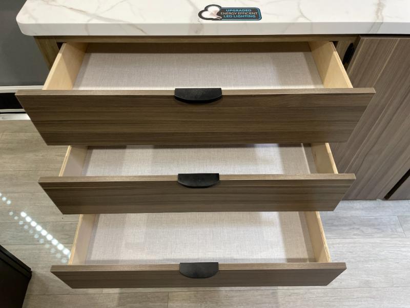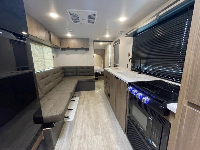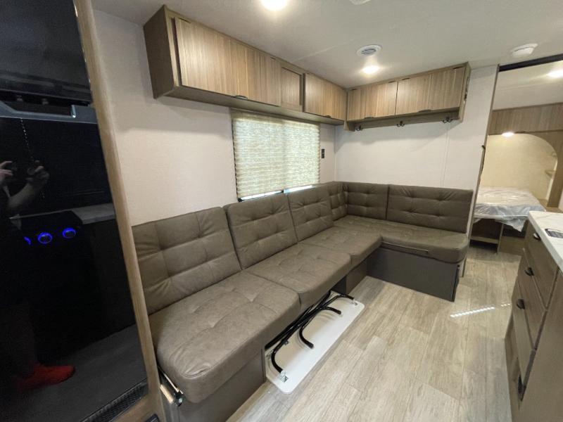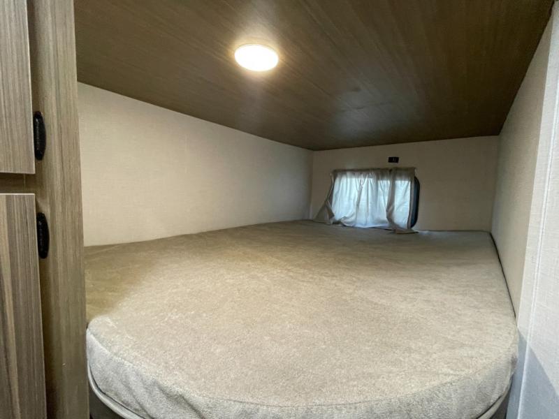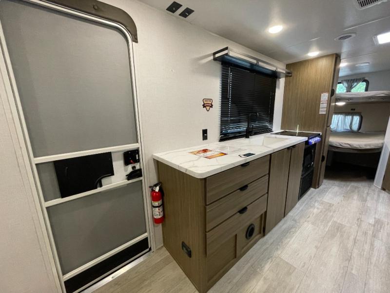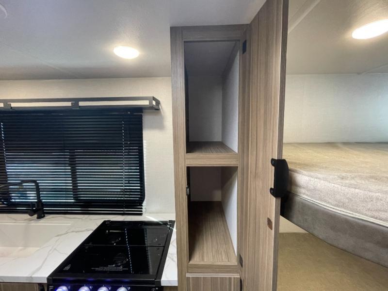Camping is made easy in this travel trailer with more sleeping space and lots of comforts! The kids or your guests will enjoy the double-size bunks in the back, along with the full bath close by for easy nighttime use. You'll have the front private bedroom with a king bed all to yourselves, and there are dual bedroom wardrobes to keep your space neat and clean. Everyone can meet in the combined kitchen and living room to relax on the super U-lounge with a removable table while the chef of your group makes breakfast on the two burner cooktop. There is also a microwave oven for quick meals, plus a pantry and refrigerator for food storage!