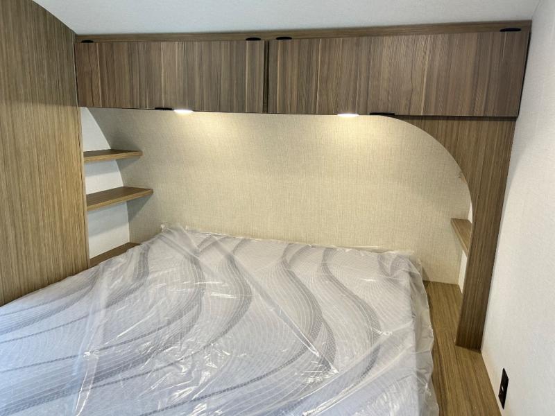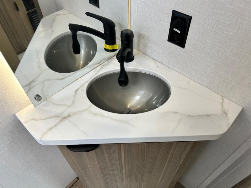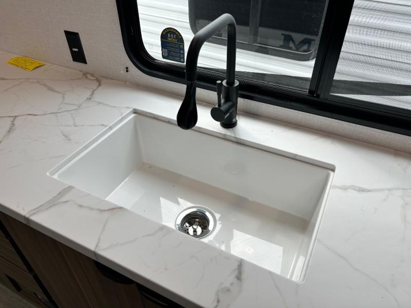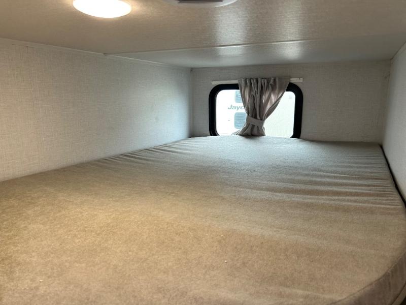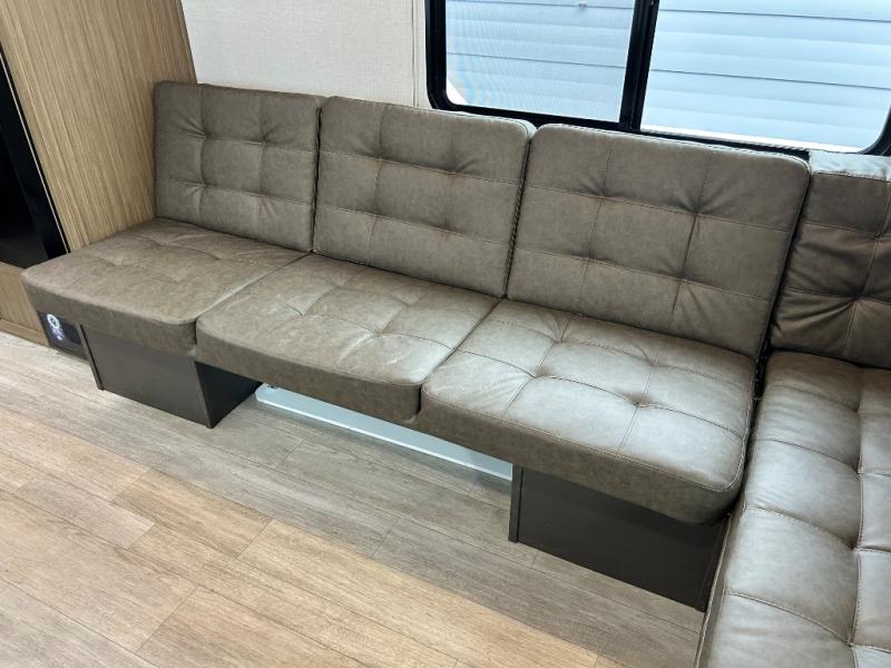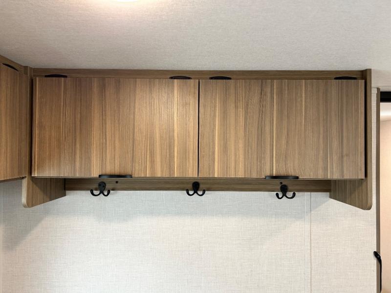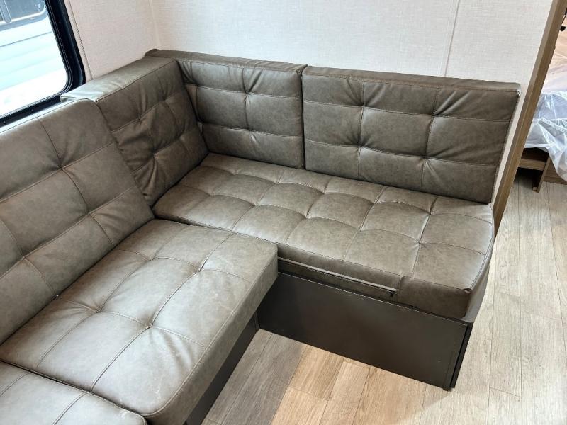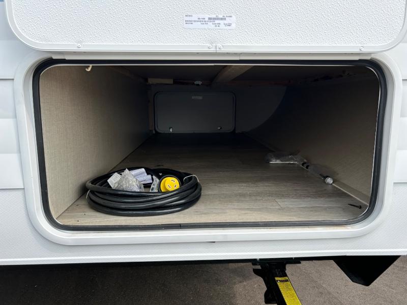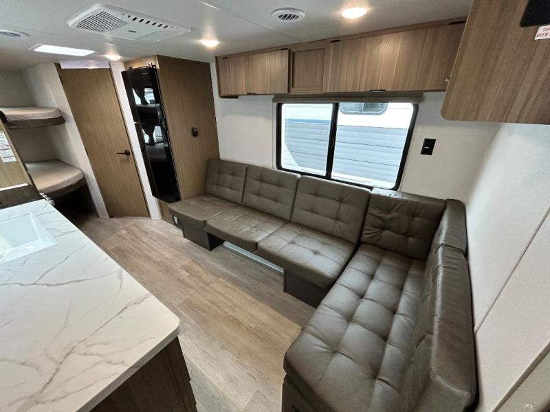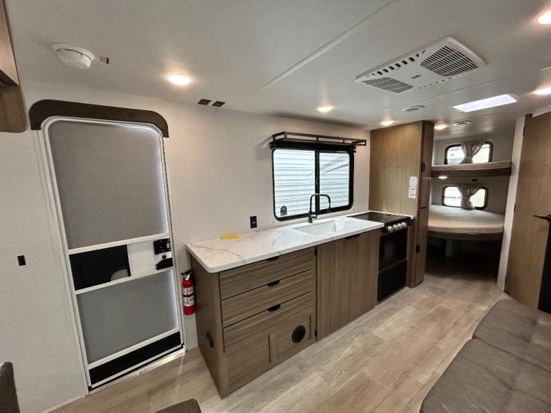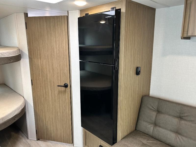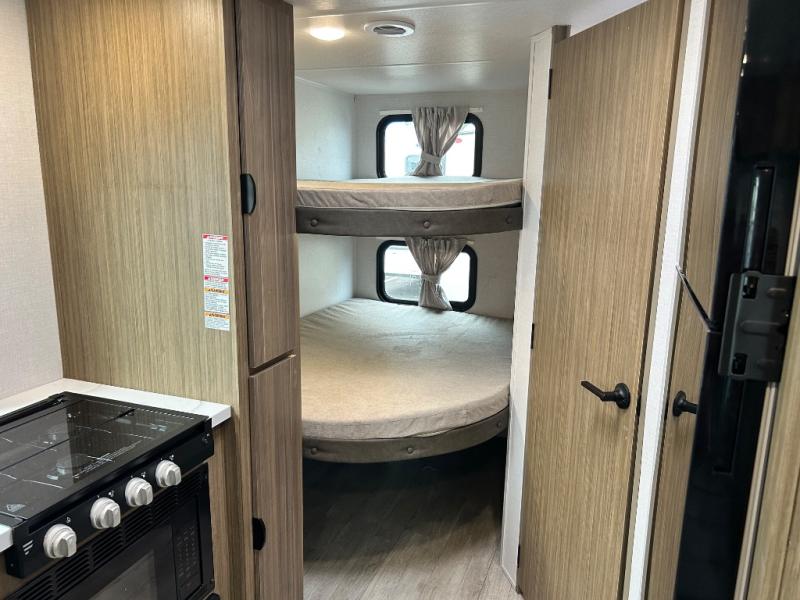 Camping is made easy in this travel trailer with more sleeping space and lots of comforts! The kids or your guests will enjoy the double-size bunks in the back, along with the full bath close by for easy nighttime use. You'll have the front private bedroom with a king bed all to yourselves, and there are dual bedroom wardrobes to keep your space neat and clean. Everyone can meet in the combined kitchen and living room to relax on the super U-lounge with a removable table while the chef of your group makes breakfast on the two burner cooktop. There is also a microwave oven for quick meals, plus a pantry and refrigerator for food storage!
