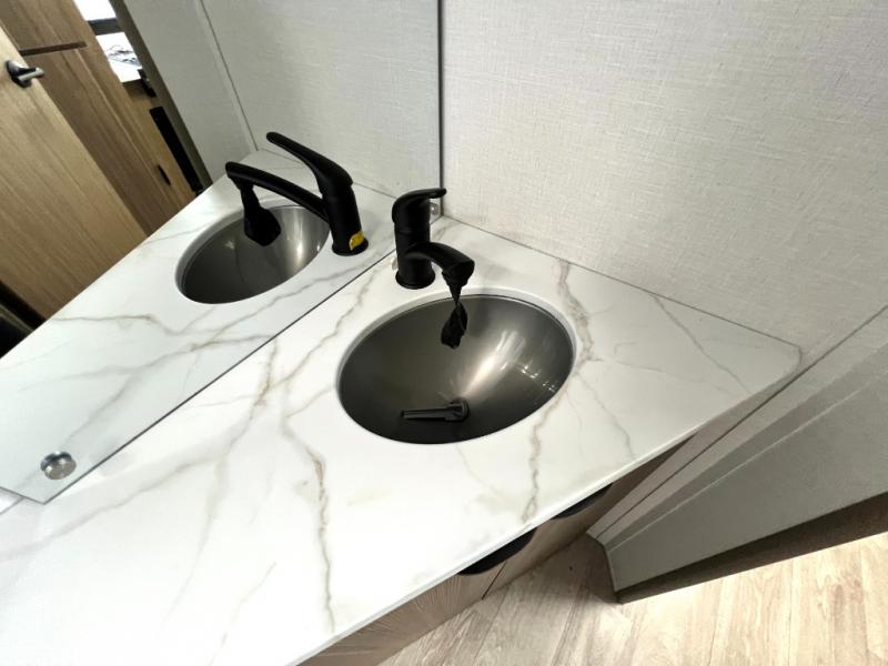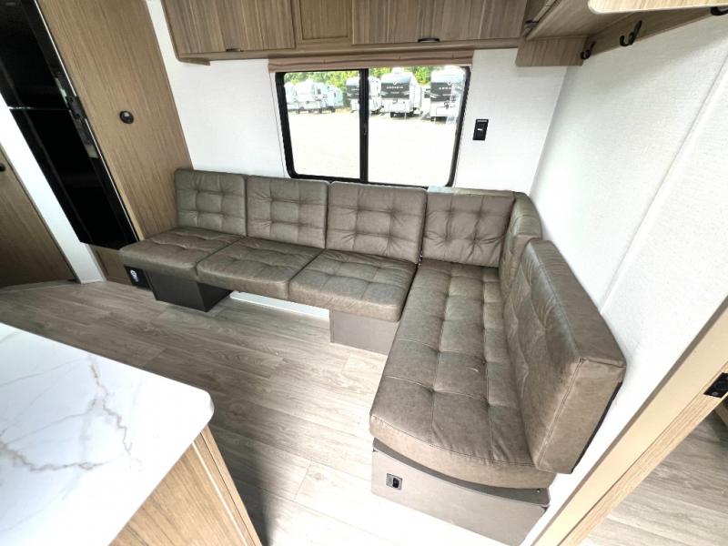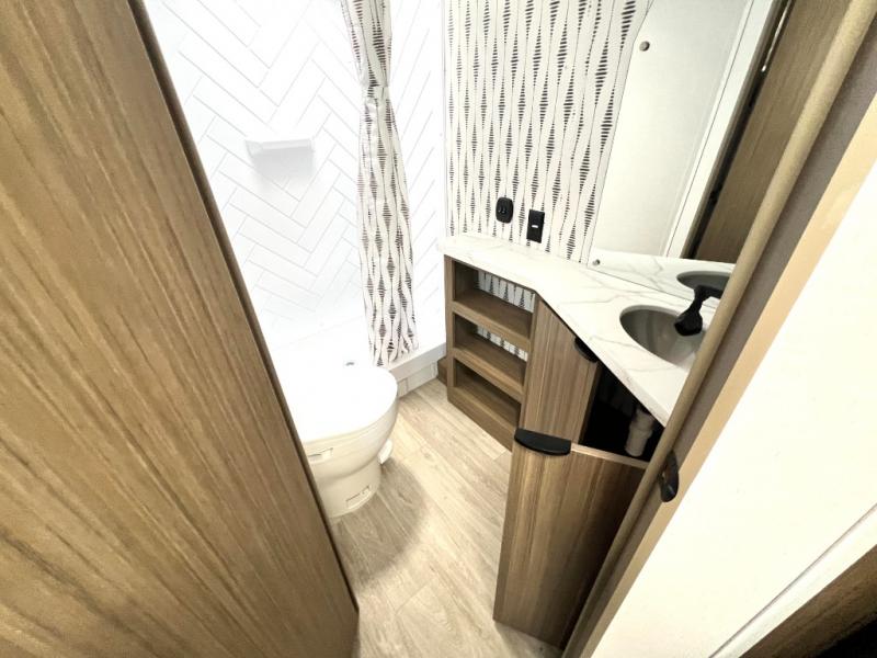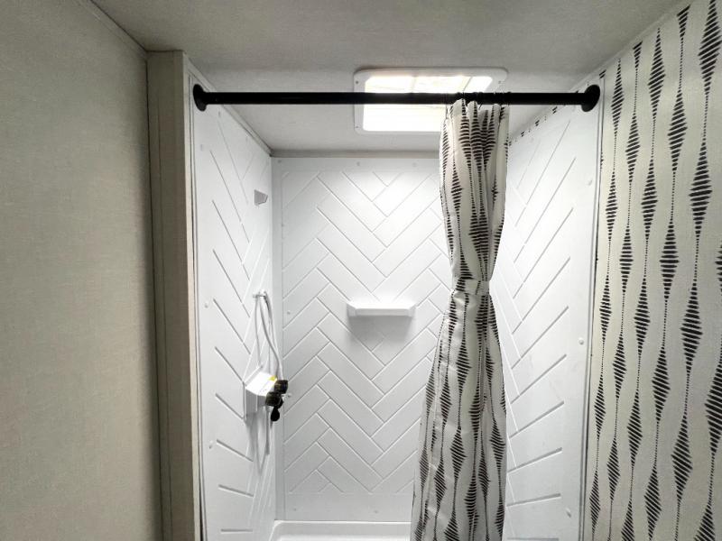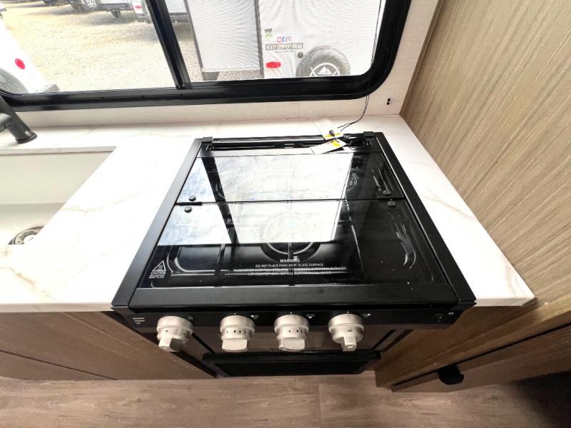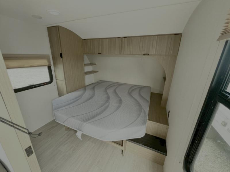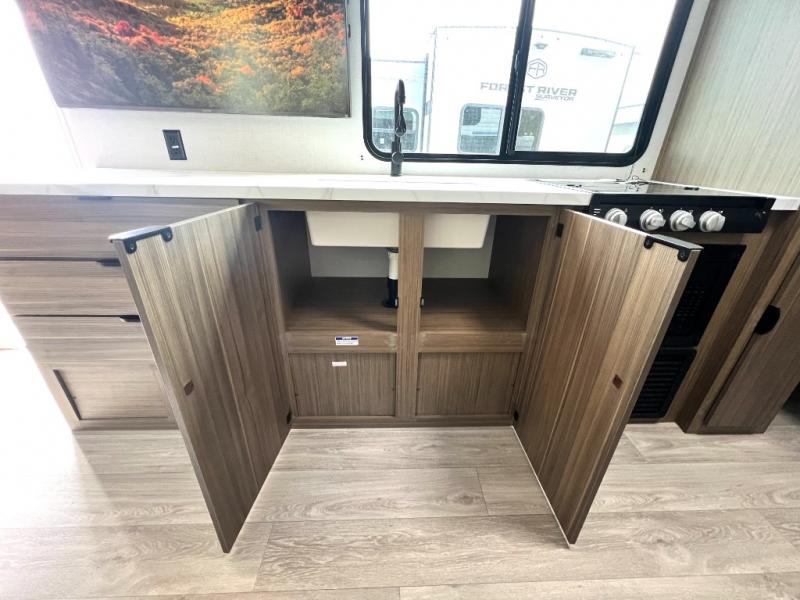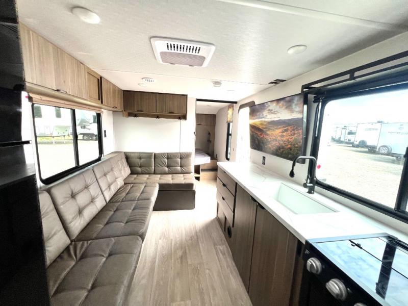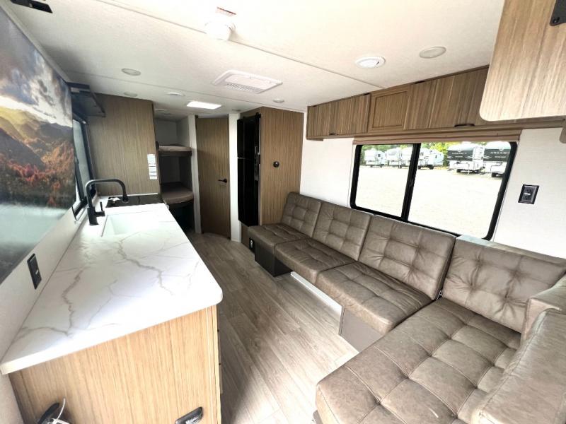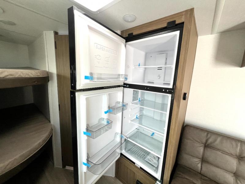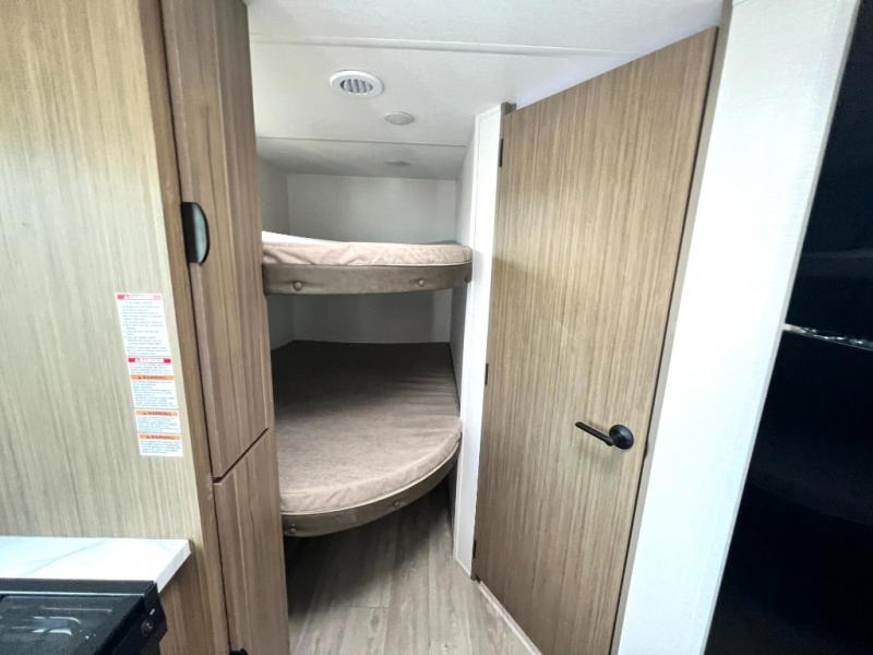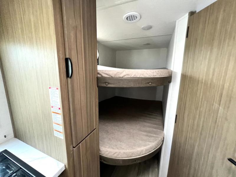 Camping is made easy in this travel trailer with more sleeping space and lots of comforts! The kids or your guests will enjoy the double-size bunks in the back, along with the full bath close by for easy nighttime use. You'll have the front private bedroom with a king bed all to yourselves, and there are dual bedroom wardrobes to keep your space neat and clean. Everyone can meet in the combined kitchen and living room to relax on the super U-lounge with a removable table while the chef of your group makes breakfast on the two burner cooktop. There is also a microwave oven for quick meals, plus a pantry and refrigerator for food storage!