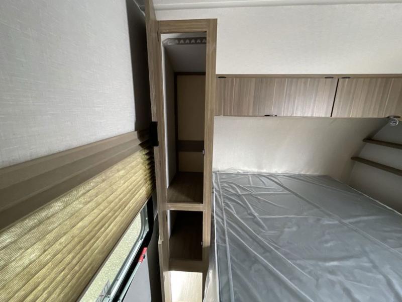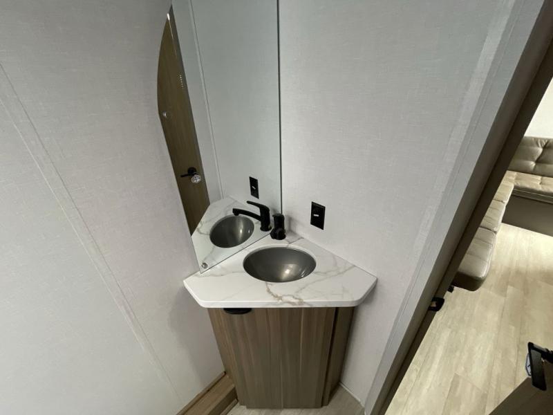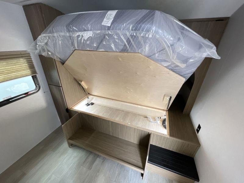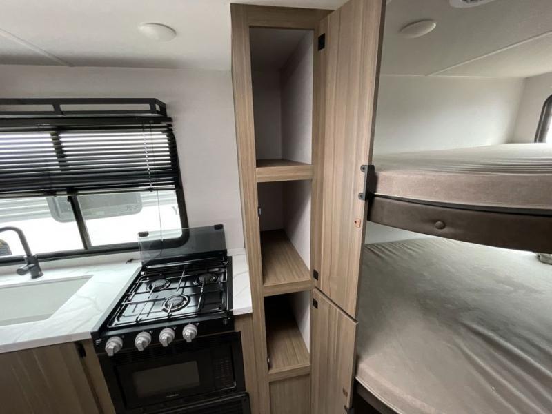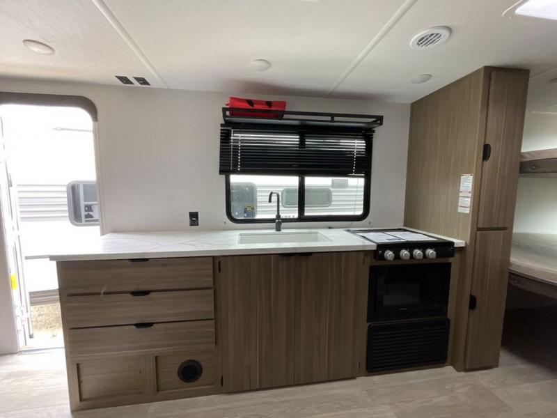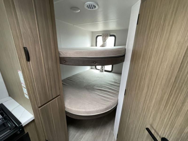 Camping is made easy in this travel trailer with more sleeping space and lots of comforts! The kids or your guests will enjoy the double-size bunks in the back, along with the full bath close by for easy nighttime use. You'll have the front private bedroom with a king bed all to yourselves, and there are dual bedroom wardrobes to keep your space neat and clean. Everyone can meet in the combined kitchen and living room to relax on the super U-lounge with a removable table while the chef of your group makes breakfast on the two burner cooktop. There is also a microwave oven for quick meals, plus a pantry and refrigerator for food storage!