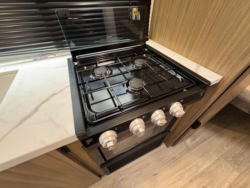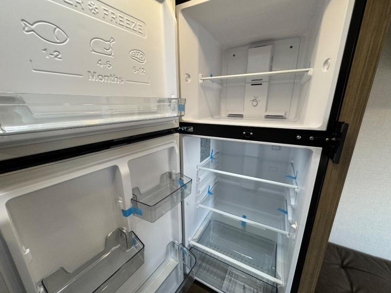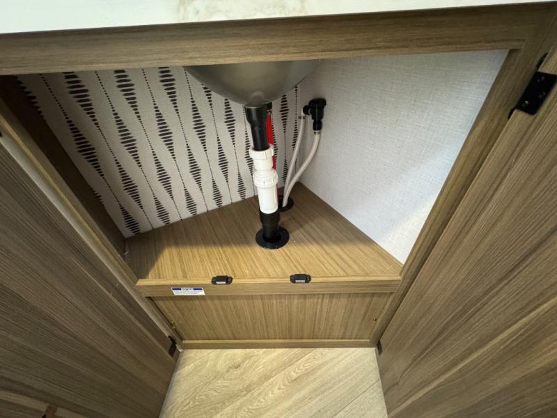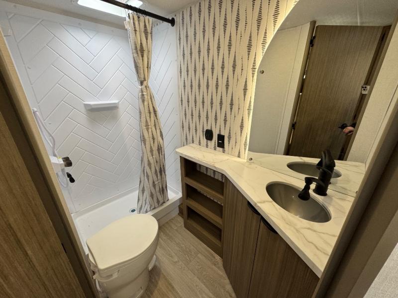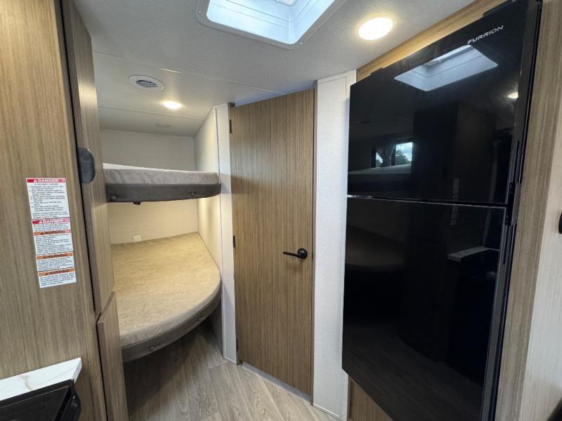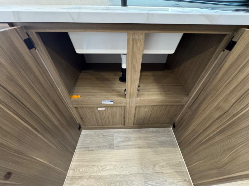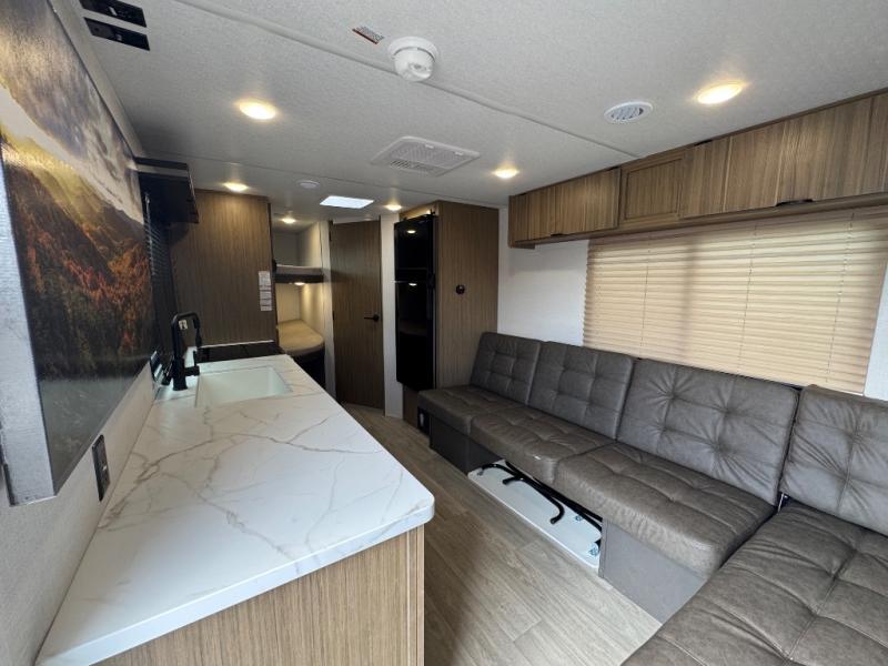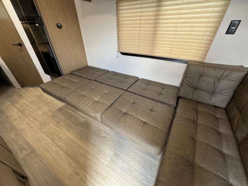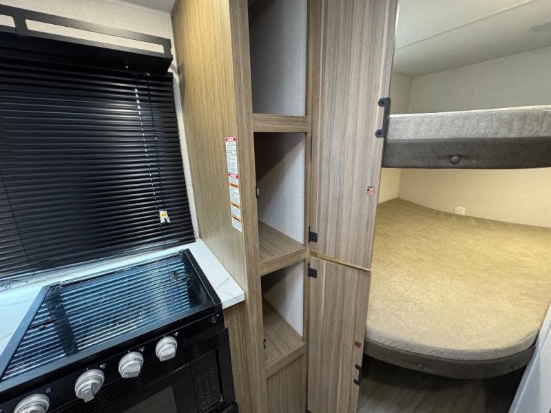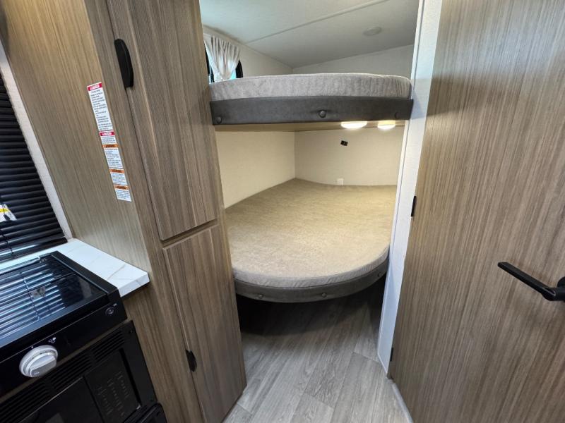 Camping is made easy in this travel trailer with more sleeping space and lots of comforts! The kids or your guests will enjoy the double-size bunks in the back, along with the full bath close by for easy nighttime use. You'll have the front private bedroom with a king bed all to yourselves, and there are dual bedroom wardrobes to keep your space neat and clean. Everyone can meet in the combined kitchen and living room to relax on the super U-lounge with a removable table while the chef of your group makes breakfast on the two burner cooktop. There is also a microwave oven for quick meals, plus a pantry and refrigerator for food storage!