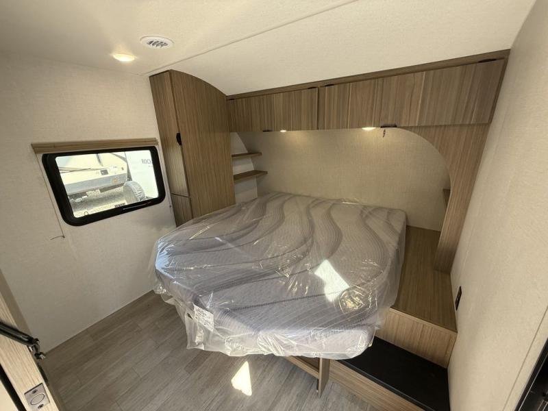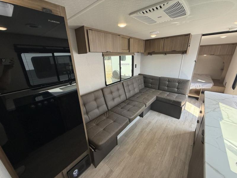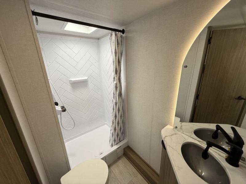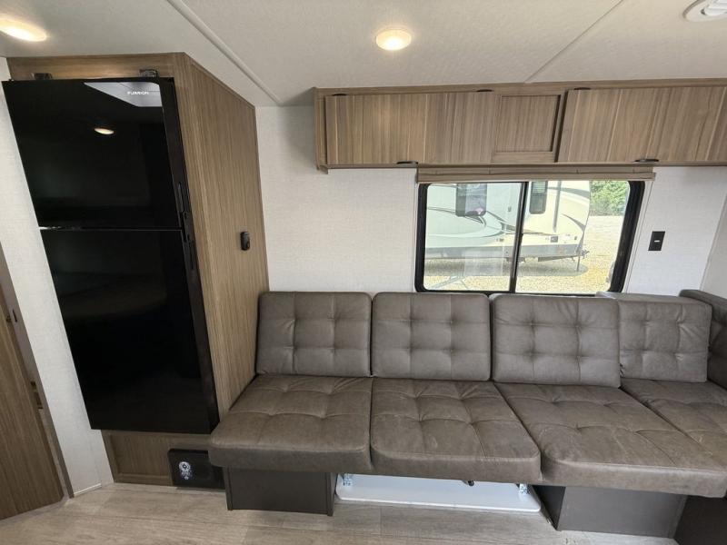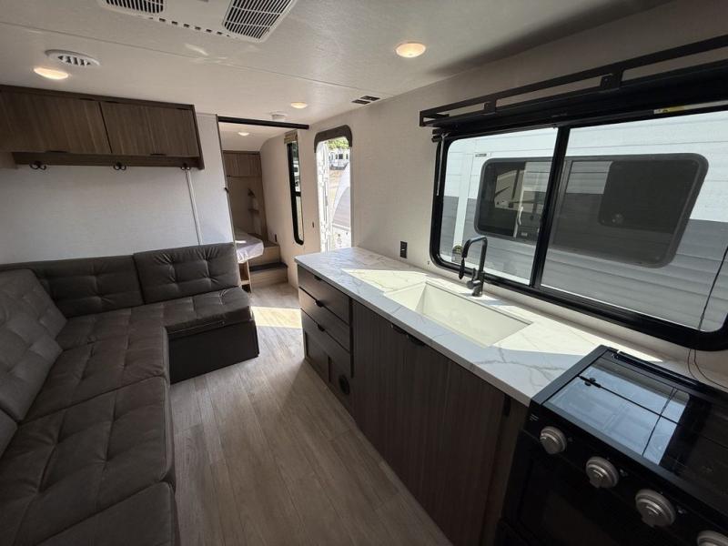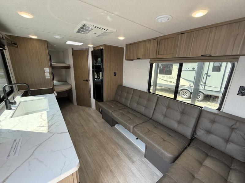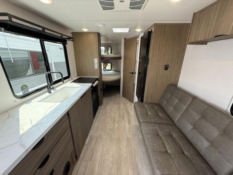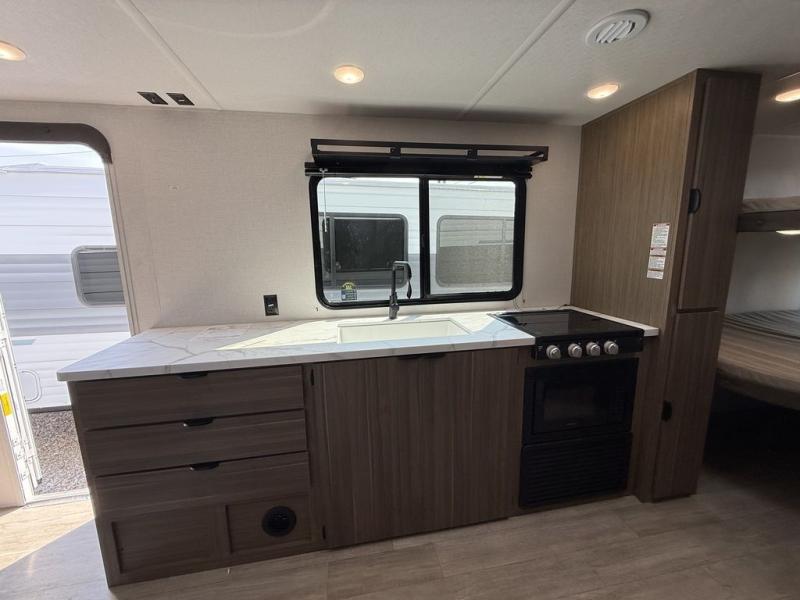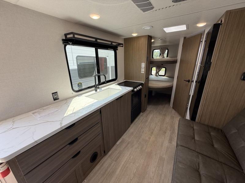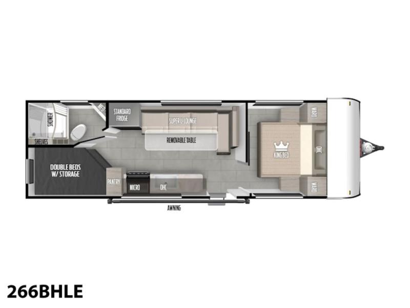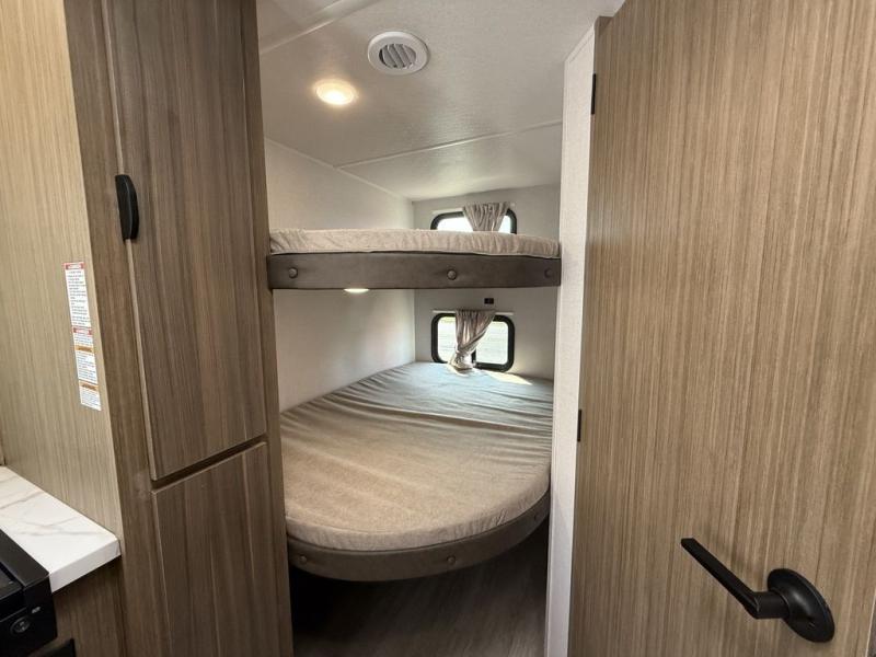 Camping is made easy in this travel trailer with more sleeping space and lots of comforts! The kids or your guests will enjoy the double-size bunks in the back, along with the full bath close by for easy nighttime use. You'll have the front private bedroom with a king bed all to yourselves, and there are dual bedroom wardrobes to keep your space neat and clean. Everyone can meet in the combined kitchen and living room to relax on the super U-lounge with a removable table while the chef of your group makes breakfast on the two burner cooktop. There is also a microwave oven for quick meals, plus a pantry and refrigerator for food storage!